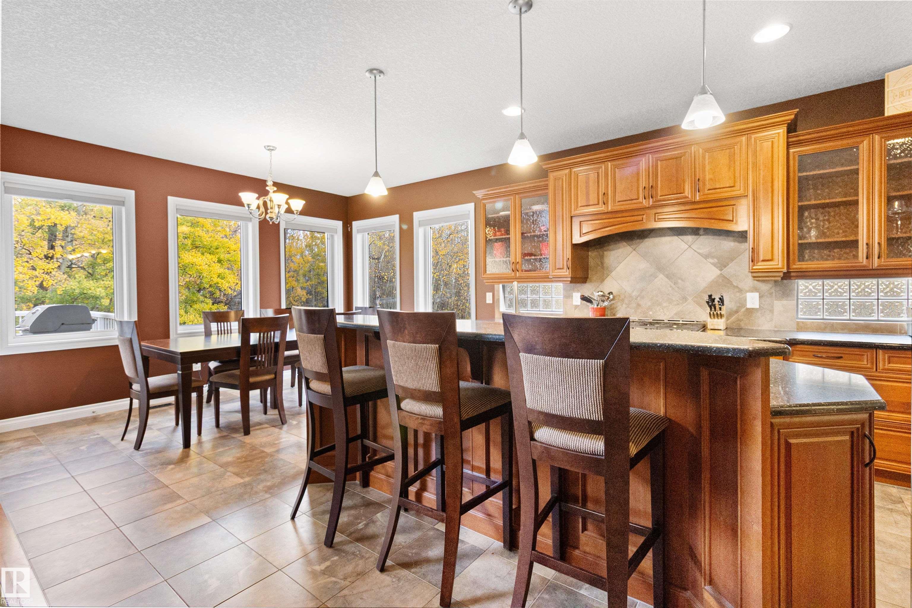 Executive living in Boag Lake Estates! This stunning walkout bungalow offers over 3,500 sq. ft. of developed space, just 5 minutes from Sherwood Park with municipal water & sewer. Gorgeous curb appeal, mature landscaping, paved driveway, and an oversized 24'x40' triple garage with RV parking set the tone. Inside, a grand foyer with soaring ceilings leads to a versatile flex/den, and the heart of the home—an entertainer’s kitchen, spacious dinette, and deck with serene views. The primary suite features a spa-like ensuite and walk-in closet. The bright walkout basement boasts a family room, games area, wet bar, two bedrooms, office, and full bath, opening to a stone patio with outdoor bar. Perfect for gatherings or quiet evenings, this home combines luxury, comfort, and nature at your doorstep.