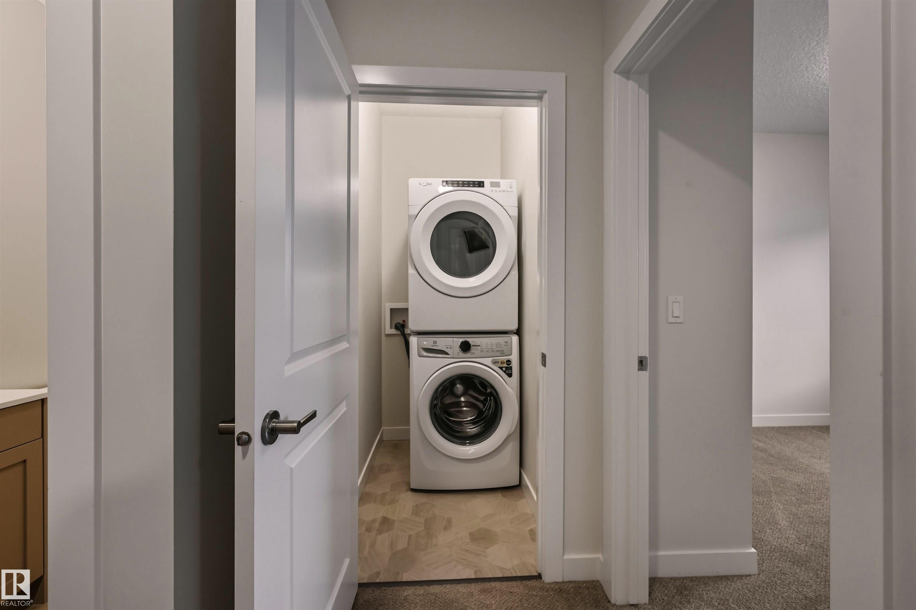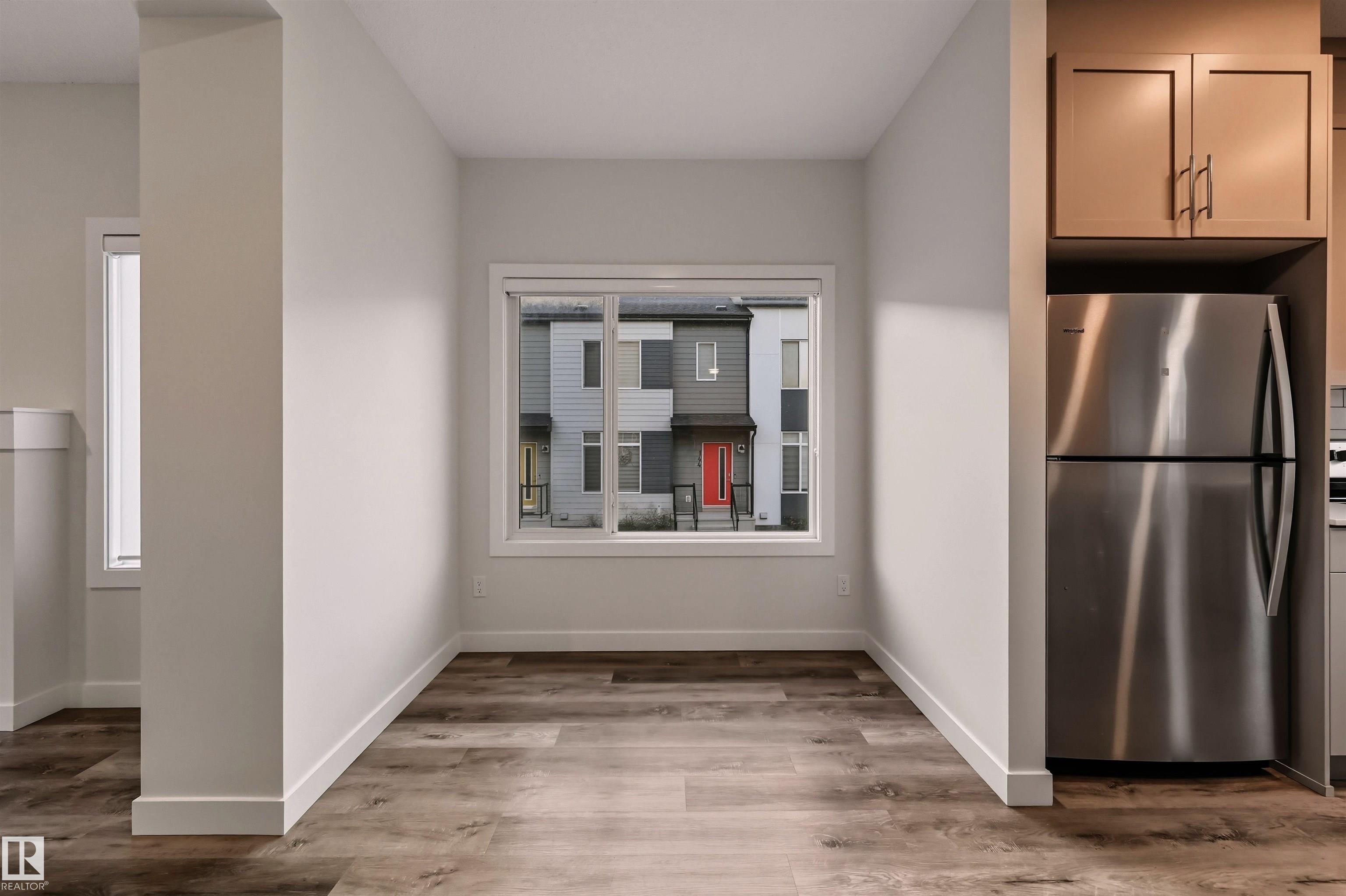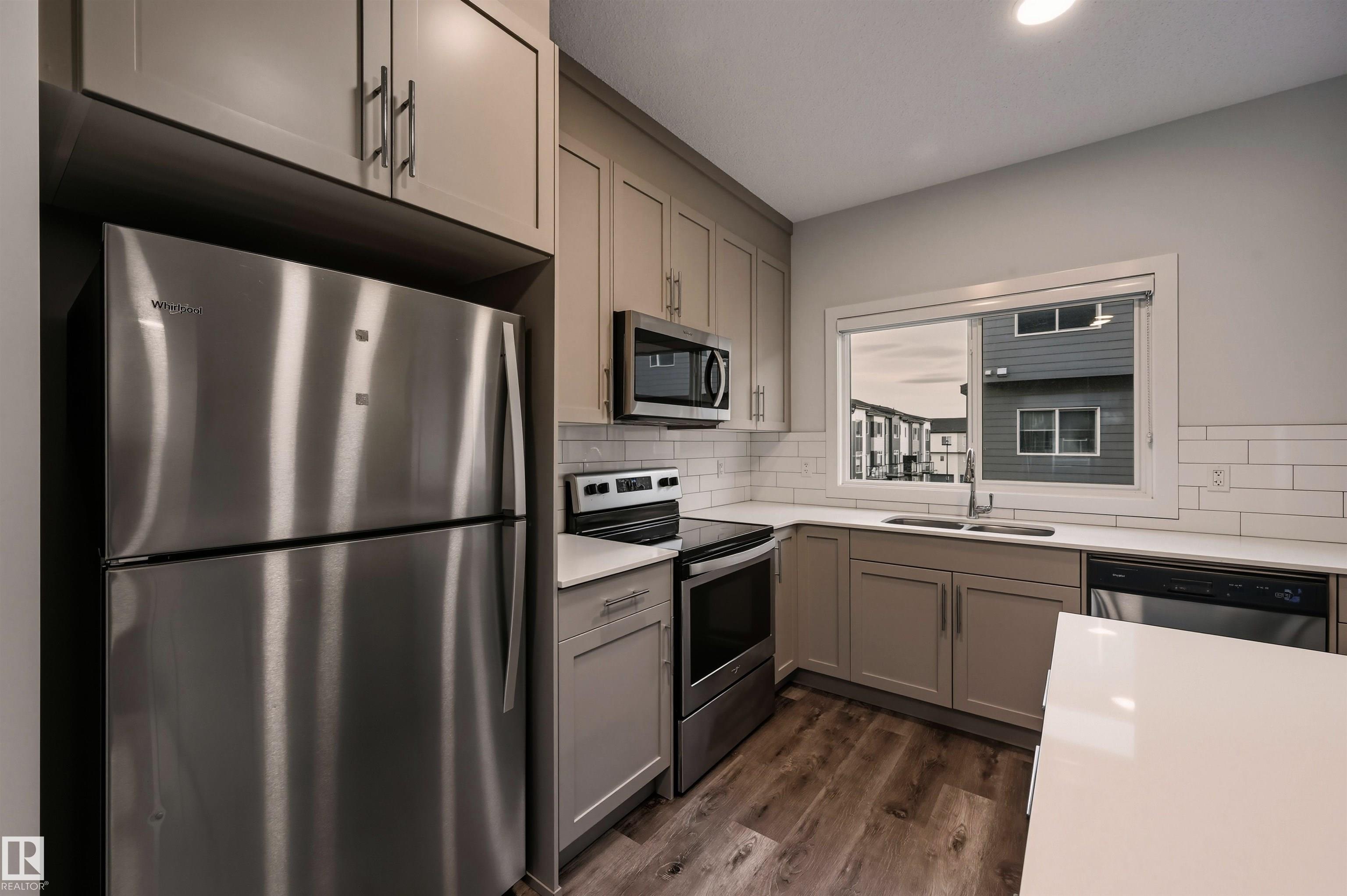 Bright, modern & spacious END UNIT 3 bed/2.5 bath townhouse w/ dbl attached garage in desirable Walker. Perfect for first time home owners or investors! Main floor features extra windows, 9' ceilings, vinyl plank floors & a roomy living room filled with natural light from the large South facing window. Kitchen offers a functional layout, stainless steel appliances, quartz countertops, tons of counter space, walk-in pantry, eating bar, & built in desk. Upper level also has 9' ceilings & large primary bedrm w/ 4pc ensuite & walk in closet. Two other well sized bedrms, 4 pc main bath & laundry complete this level. Lower level flex room is perfect for an office, play rm, exercise area, or extra storage space! Energy-efficient mechanical including HRV & tankless hot water for a lower utility bill. This well maintained complex offers visitor parking and nearby walking trails & lake. Conveniently close to shopping, schools & public transit. Quick access to commuter routes incl Henday