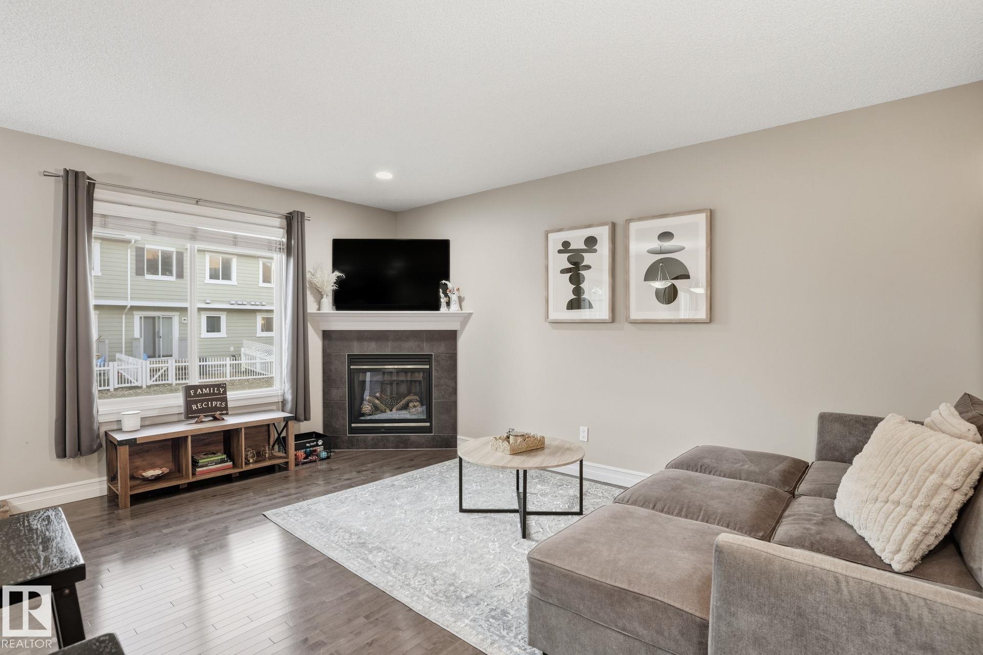 Step into this impeccably cared-for 2-storey half-duplex, perfectly situated in a well-run Sherwood Park complex with low condo fees. This 3-bedroom, 2.5-bath home welcomes you with an open-concept main floor, ideal for gatherings. The sleek kitchen features granite countertops, a corner pantry, stainless steel appliances, and a large island, blending seamlessly into the dining nook and great room. There, a corner gas fireplace adds warmth, complemented by rich hardwood floors. A 2-piece bath and direct access to the single-car garage complete this level. Upstairs, the expansive primary suite boasts a 3-piece ensuite with a 5ft shower, joined by two additional bedrooms, a 4-piece bath, and a convenient laundry area. Built for efficiency, the home includes triple-pane windows, an HRV system, and a tankless hot water heater, keeping energy costs low. The unfinished basement, with utilities neatly tucked away, offers endless possibilities for customization.