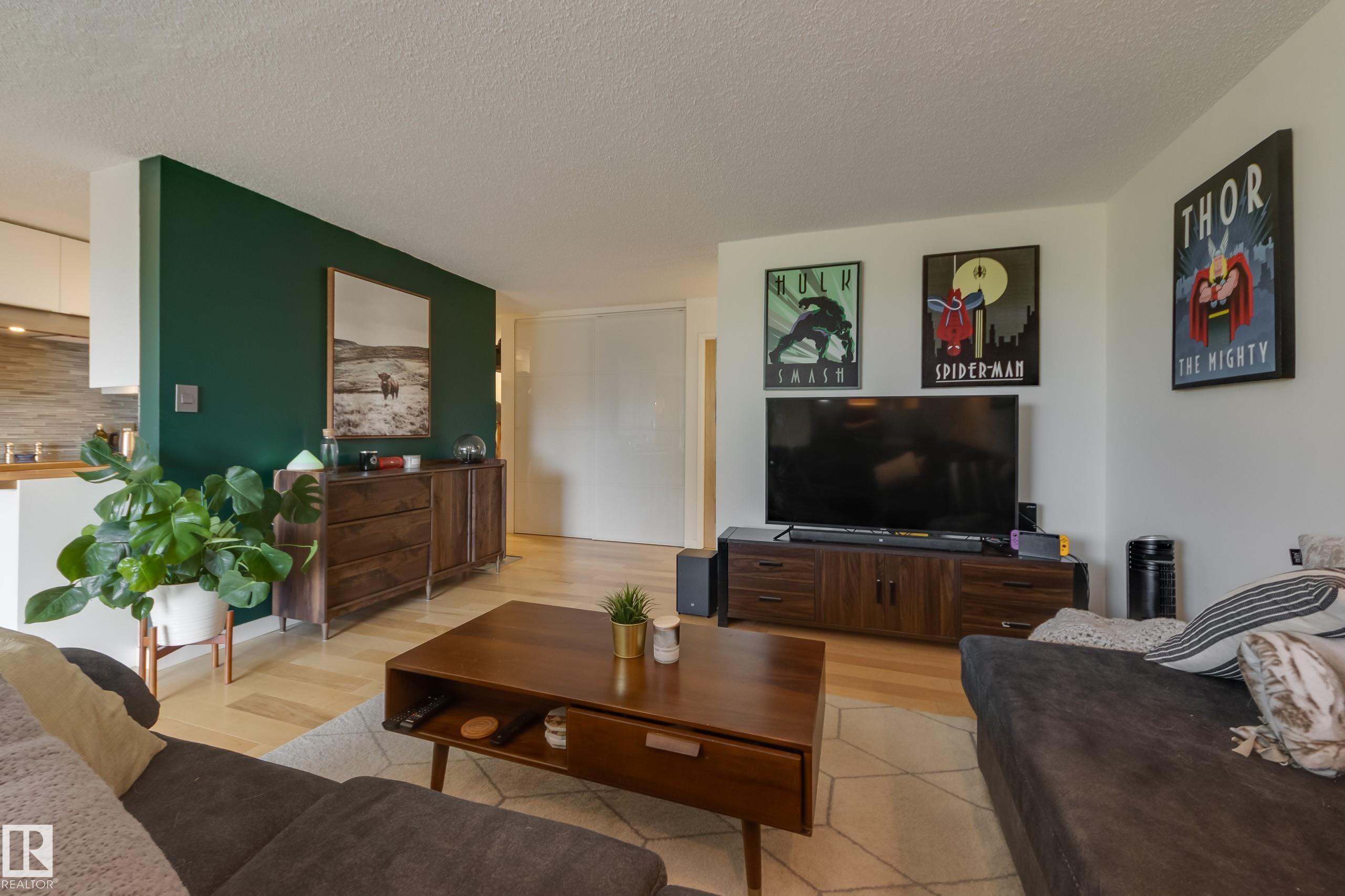 Discover the ideal combination of high-end renovation, size & location in this fully renovated 1061 sq.ft. 2-bedroom, 2-bathroom suite in Westcliffe Arms. With a lovely tree-lined view from it's west side exposure & spacious balcony, this property is filled with natural light. The unit boasts a custom kitchen featuring stainless steel appliances, trendy hardwood & tile flooring, in-suite laundry & a three-piece en-suite bathroom. The large second bedroom/office & renovated 4 piece bath make this perfect for anyone a room mate or working from home. Complete w titled underground parking & a storage locker. The condo fees include heat, electricity & water! Stylish vintage common areas, such as a social lounge & gym. This prime location is close to restaurants, grocery stores, bike paths & of course the river valley. Just half a block away from the Government Center and LRT, it offers easy access to the UofA & downtown. A very rare blend of 70's square footage & modern interior - this is the one.