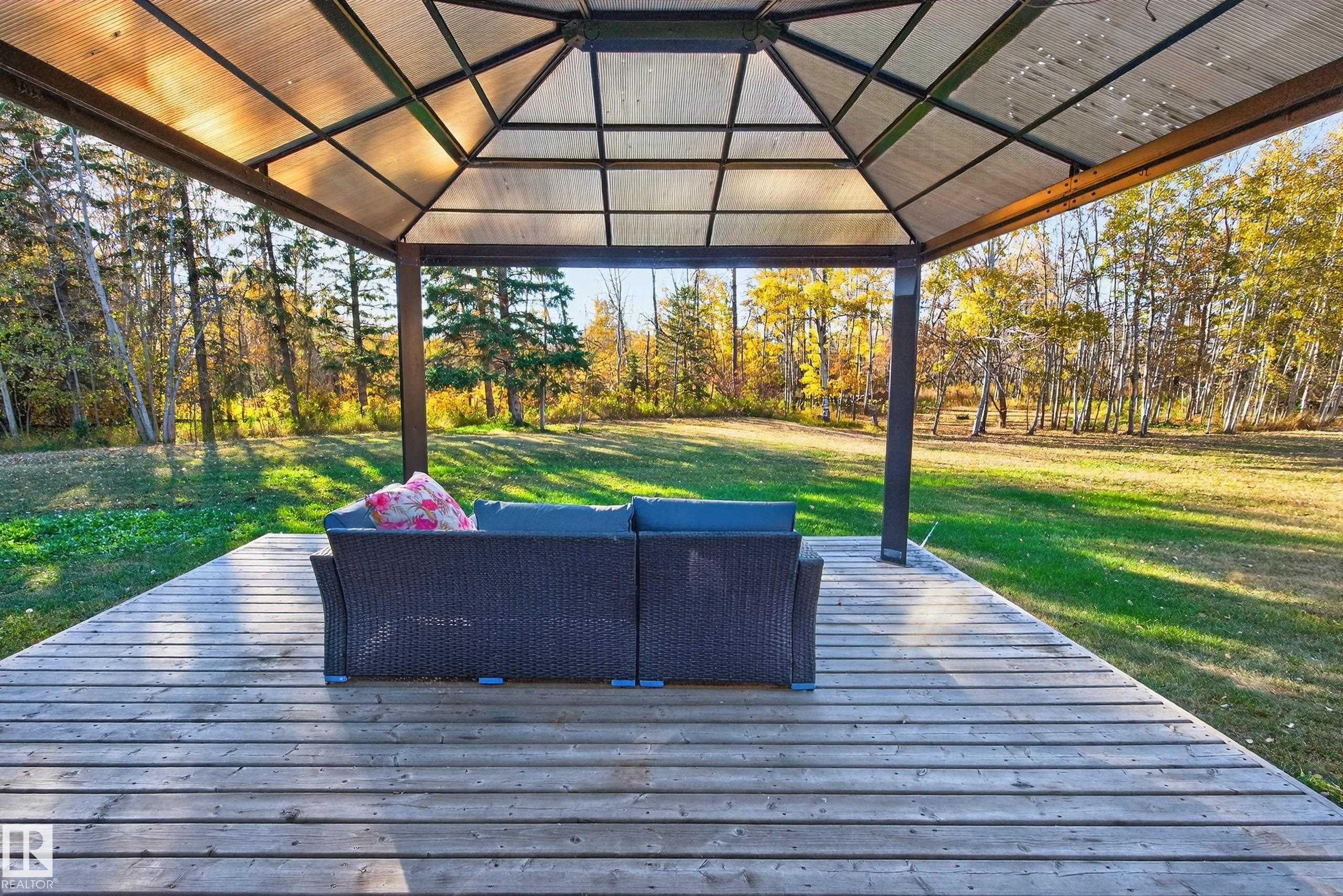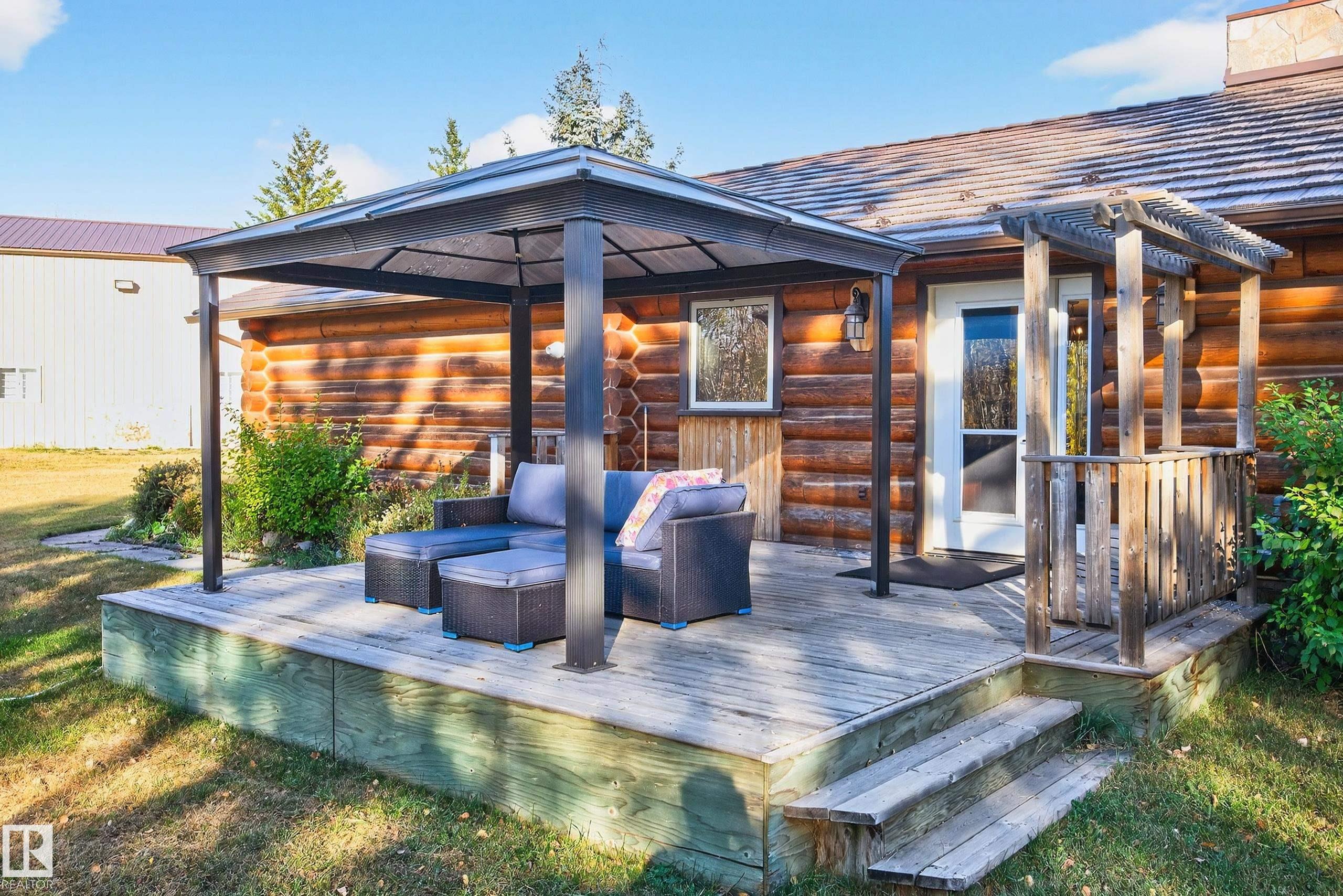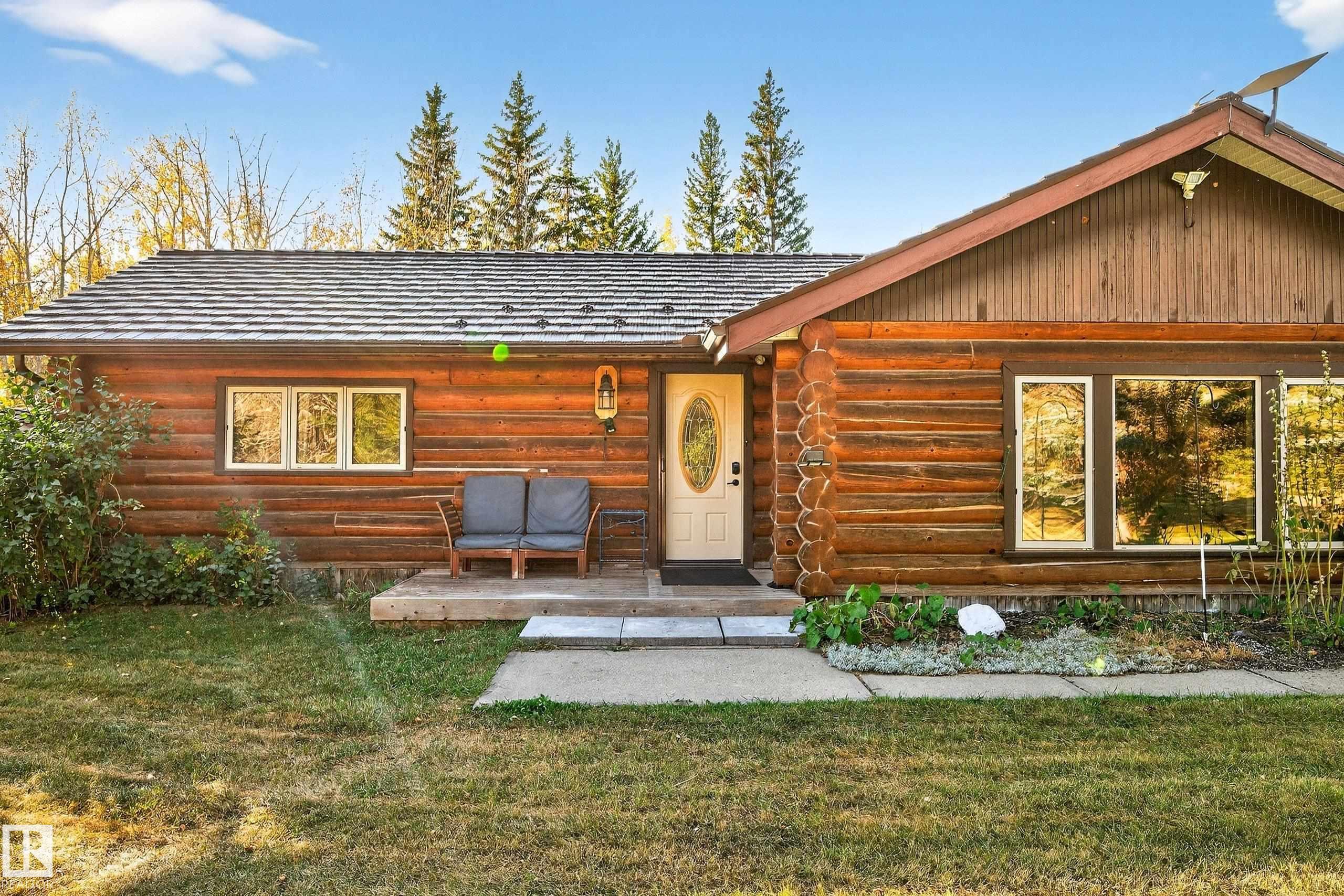 Stunning 2,034 sq.ft log bungalow on 2.06 private acres in Spanish Oaks, just off Hwy 60 and minutes from Edmonton! This beautifully upgraded home features vaulted ceilings, hand-carved bamboo flooring, a cozy wood-burning fireplace, modern kitchen with built-in appliances, 3 spacious bedrooms, 2 living rooms, and a formal dining area. Recent upgrades include a metal roof, triple-paned windows, furnace, hot water tank, pressure tank, flooring, and full log treatment. Outside, enjoy a 28' x 50' shop with radiant heat, 14' high door, 220 power, 200 amp service, floor drains & room to park your RV indoors! Additional features: $150K in recent upgrades, new HVAC, water treatment system, oversized heater, 8x10 & 16x16 sheds, a 16x24 powered clubhouse, and a large storage Quonset. The landscaped yard includes fruit trees, perennials, a large deck, firepit & garden area. Located at the end of a quiet cul-de-sac, this incredible property offers privacy, functionality & charm. A rare find!