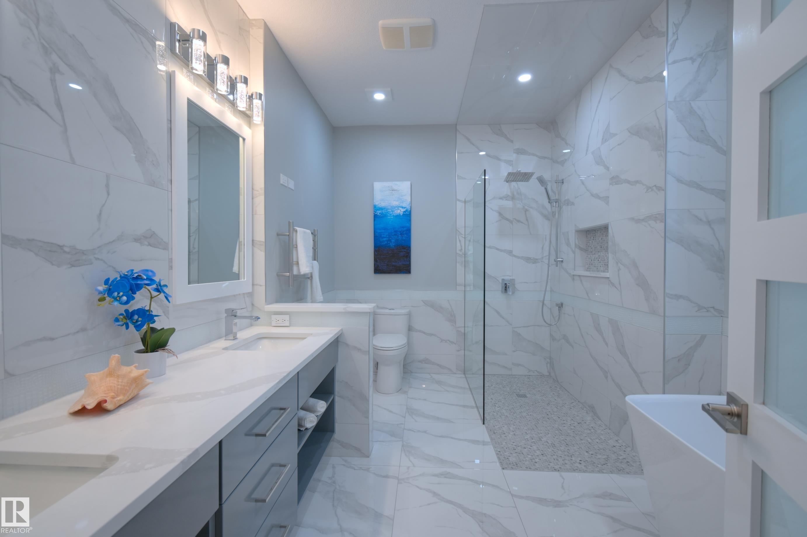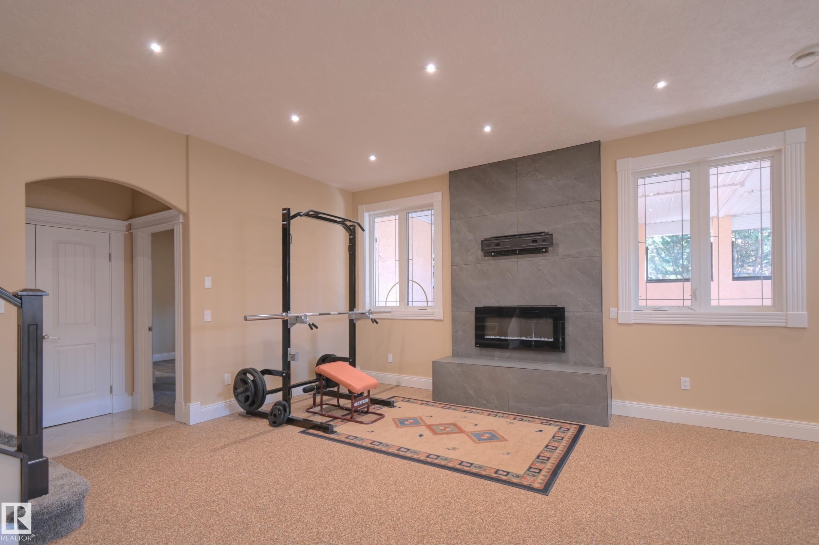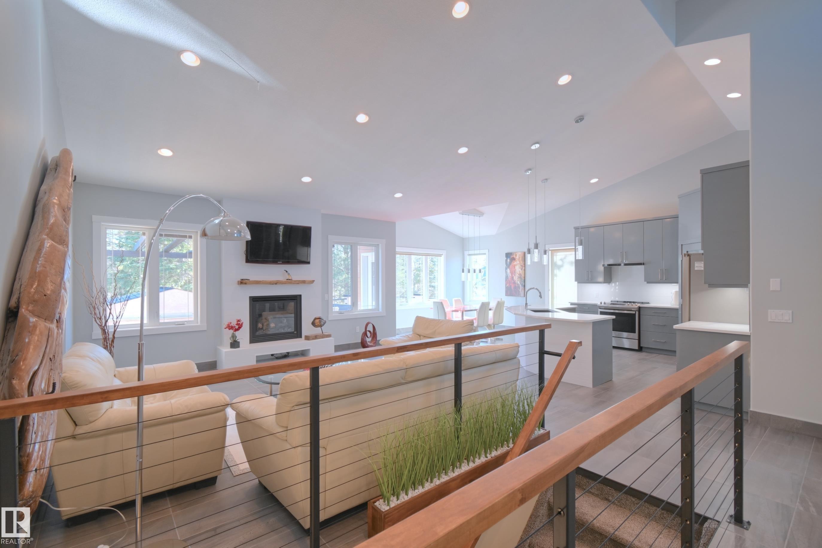 Exceptional Executive Acreage in Prestigious Atim Creek! Just minutes North of Town, this 5-bed + den custom-built bungalow has been beautifully renovated. The updated kitchen features European cabinets, quartz counters, island & a huge new pantry. Ample natural light, a fireplace & vaulted ceilings add elegance to the open main living space. Large windows in the living and dining rooms offer a treed view of the property. The primary suite is HUGE, offering a gorgeous new 5-pc ensuite, walk-in closet, fireplace and deck access. Two additional beds, den, laundry & dog wash complete the main floor. The finished lower level has a family/games room with fireplace and wet bar, 4th & 5th beds (both with ensuites), media room and three more bathrooms. The huge deck is perfect for backyard entertaining, and the lower level walks out to a large, sheltered patio. Gather around the fire pit in the private, treed yard. Parking is never a problem thanks to the oversized heated triple garage. Just 12 min to Edmonton!