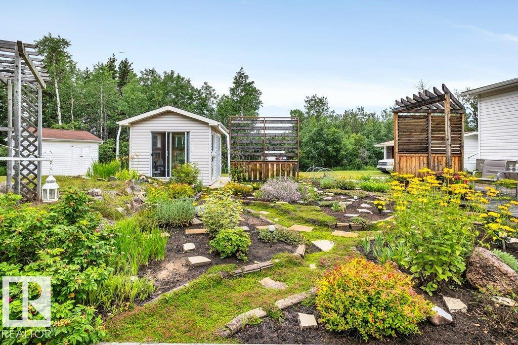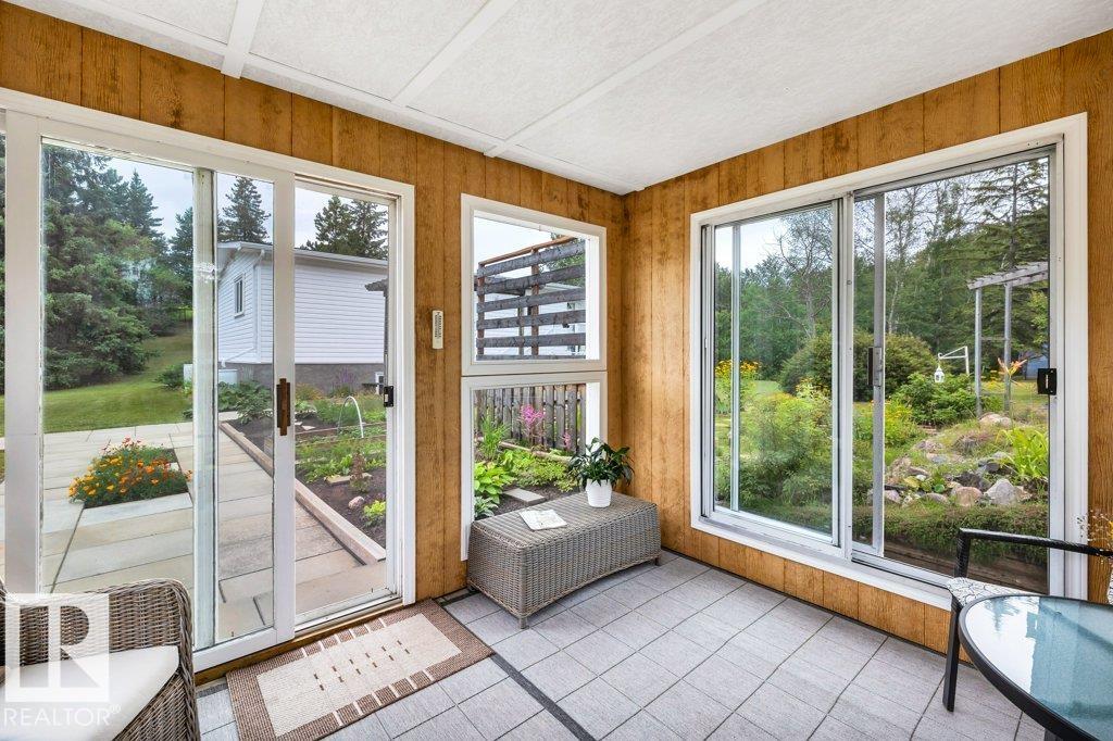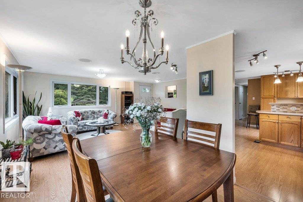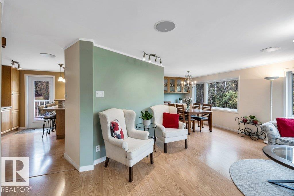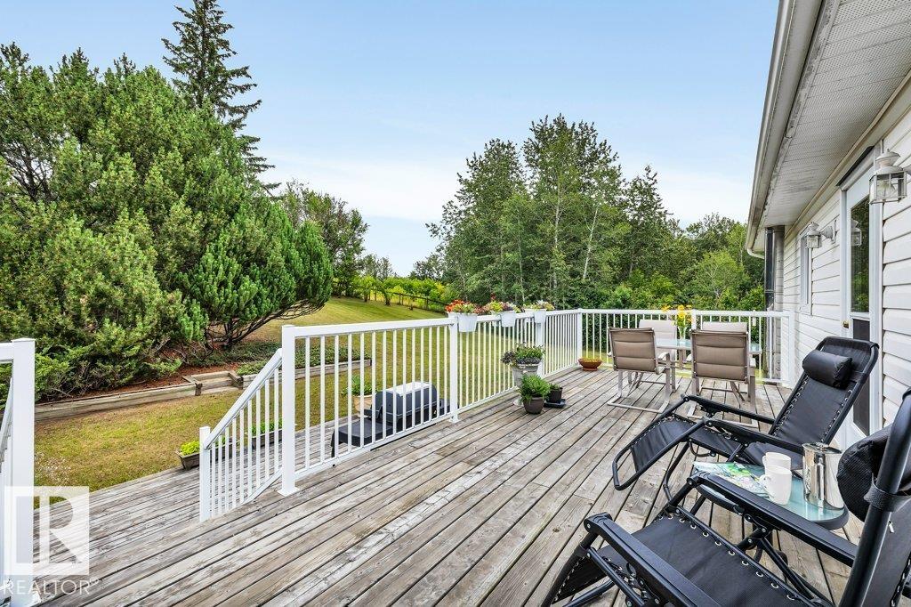 Welcome to this 1,250 sq ft bungalow nestled on 3.09 acres of fully fenced & tree-lined for privacy. Thoughtfully designed for indoor-outdoor living, enjoy large decks at the front & back - ideal for entertaining or peaceful mornings. The open living and dining areas flow together seamlessly, perfect for gatherings. Upstairs features 3 bdrms, a 4-pc bath, & a primary with its own 3-pc ensuite. Convenient main-floor laundry sits by the back entrance. The fully developed basement offers a spacious rec room with wood-burning fireplace & wet bar, a 4th bdrm, 3-pc bath, & ample storage. Triple pane windows, insulation, siding & furnace are only the start of the upgrades done to this home – everything covered! Outside, discover a sunroom overlooking beautifully landscaped gardens, two sheds plus a large barn, & detached carport. The gently hilled lot is rich with mature trees, offering space & privacy for hobbies, pets, & play. Room to roam, grow, and live—this is a place to call home – just 7 mins to Edmonton.