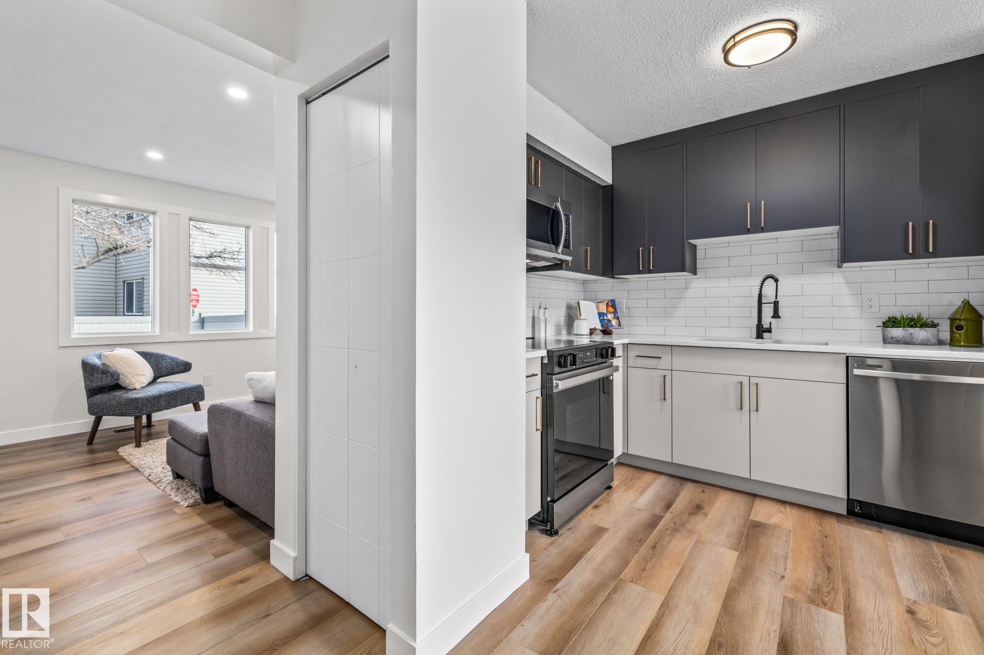 Welcome home to this beautifully renovated end-unit townhouse, perfect for first-time buyers or families! Every detail has been updated, from the brand-new kitchen to the fully finished basement. The bright living room features a cozy wood-burning fireplace and opens to a freshly sodded yard, ideal for kids or weekend BBQs. A main-floor half bath adds convenience. Upstairs, enjoy three bedrooms, including a generous primary suite with ample closet space, plus a stylish new four-piece bathroom. The finished basement offers space for a family room, play area, or home office. Recent upgrades include quartz countertops, vinyl plank flooring, modern doors and trim, pot lights, updated lighting and hardware, plush carpet, and fresh paint. Located in a family-friendly community steps from school and playground, with easy access to shopping, transit, the Anthony Henday, and Yellowhead Trail.