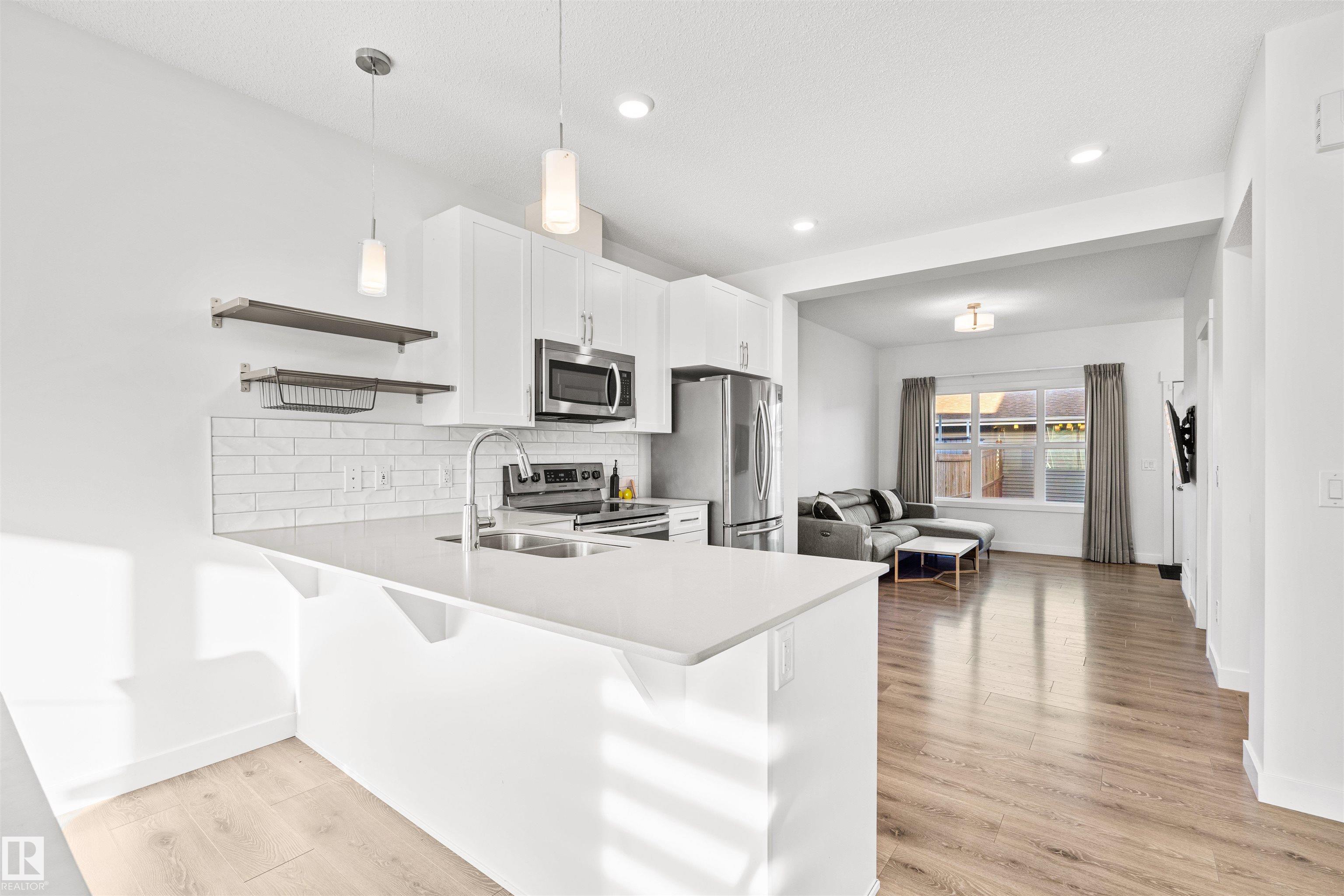 NO CONDO FEE! END UNIT! Welcome to this beautifully maintained two-storey home in the desirable Glenridding Ravine. A charming front porch opens to a bright main floor featuring elegant laminate flooring and a stunning kitchen with quartz countertops, stylish cabinetry, and stainless steel appliances. Upstairs, the spacious primary suite boasts a walk-in closet and private three-piece ensuite. Two additional bedrooms, a four-piece bathroom, and convenient upper-floor laundry complete this level. The unfinished basement presents excellent potential for customization. Outside, enjoy a fully-landscaped fenced yard and double detached garage. With parks, schools, and shopping nearby plus easy access to Anthony Henday Drive and Ellerslie Road. Don’t miss out!