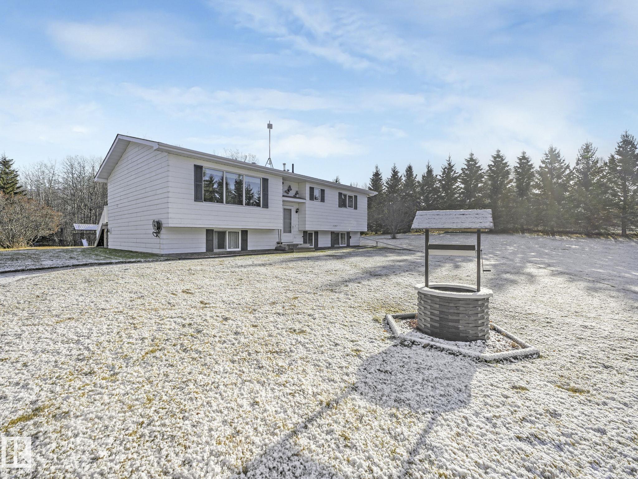 BEAUTIFUL PARK LIKE SETTING with 5 BEDROOM HOME on 1.57 ACRES backing onto reserve land minutes from Spruce Grove and Stony Plain. Many upgrades to the home including SHINGLES... FURNACE... HOT WATER TANK... AIR CONDITIONING... TRIPLE PANE GLASS in living room windows...PRESSURE TANK and GARAGE HEATER. PRICED $75,000 UNDER ASSESSED VALUE!!! Bright and spacious floor plan with large living room, kitchen, 3 spacious bedrooms on the main floor and 4 piece bath. The basement is fully finished with gas fireplace in the family room, 2 additional bedrooms, cold room and plenty of storage. The heated 28' x 28' garage has tons of room for parking, 220V wiring and work benches. The yard is stunning with large garden area, gazebo, mature spruce trees, apple tree, lilacs and allows for plenty of privacy. Perfect starter acreage with LAWN TRACTOR and QUAD INCLUDED!!! Playground across the street and close to MUIR LAKE School and CHICKAKOO LAKE in paved subdivision of HYCREST PLACE II. A MUST SEE!!!