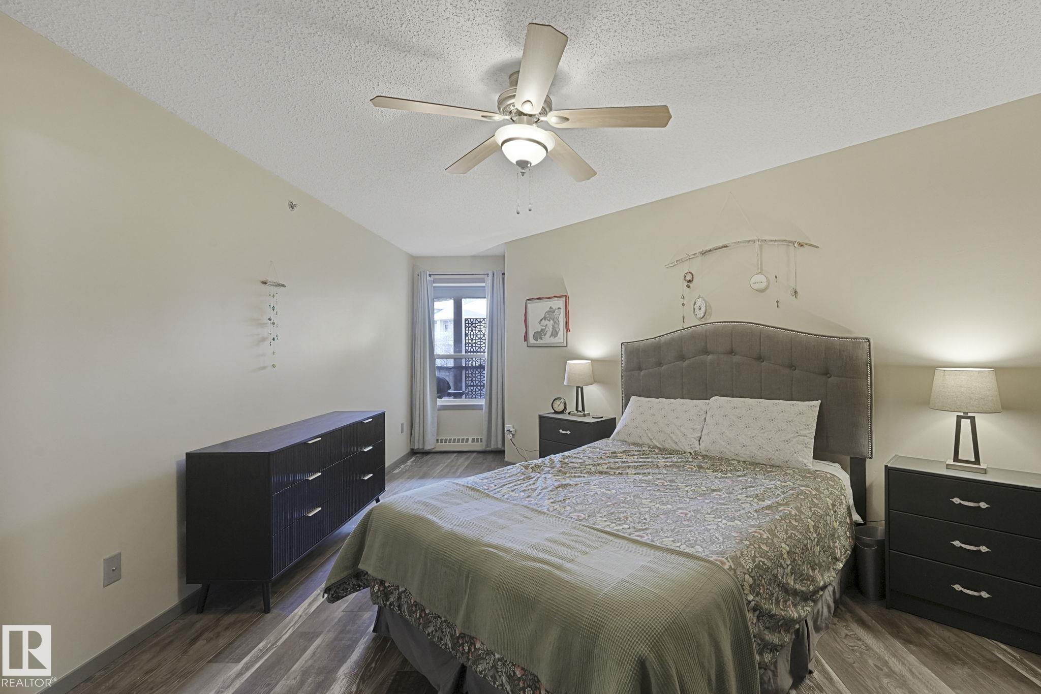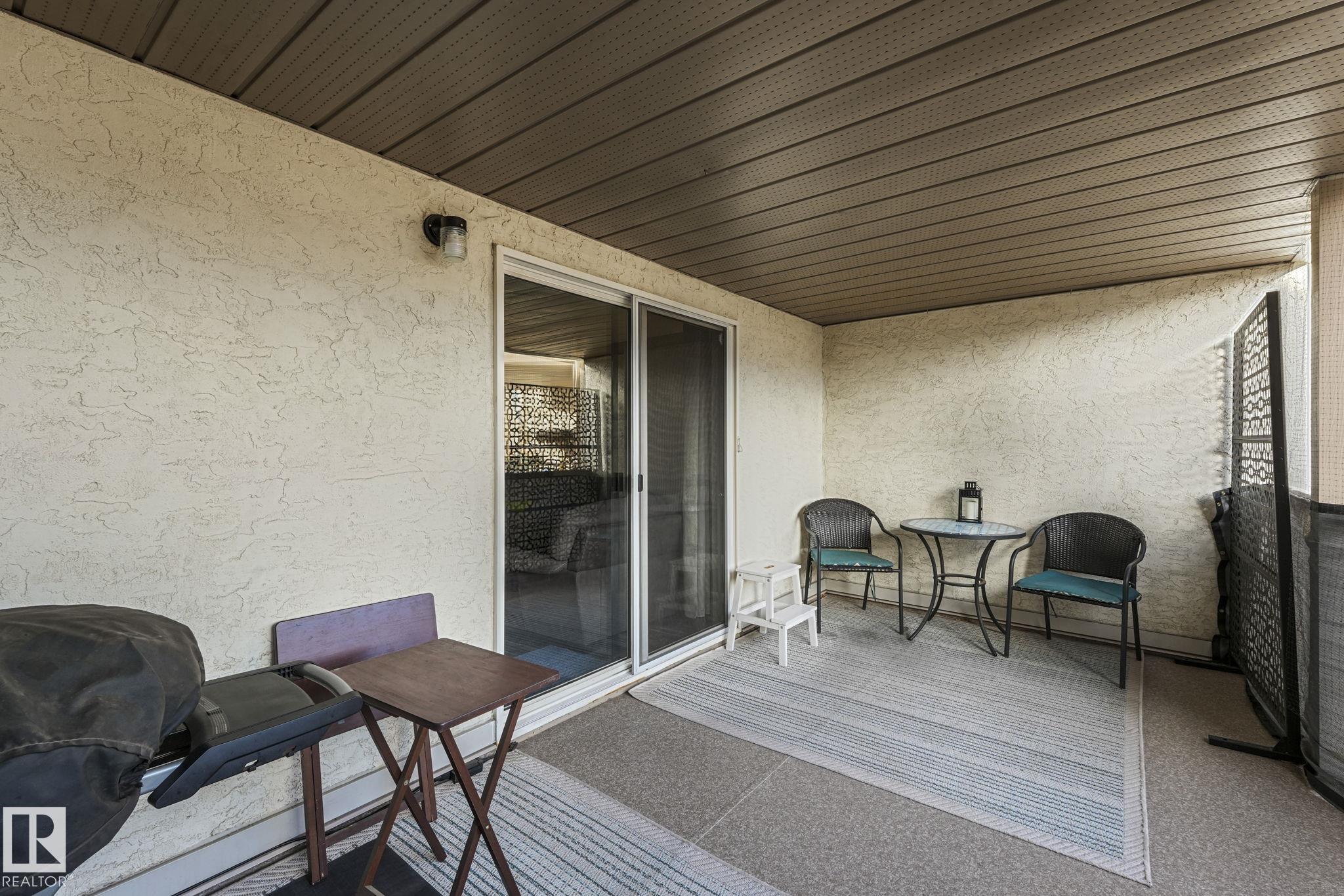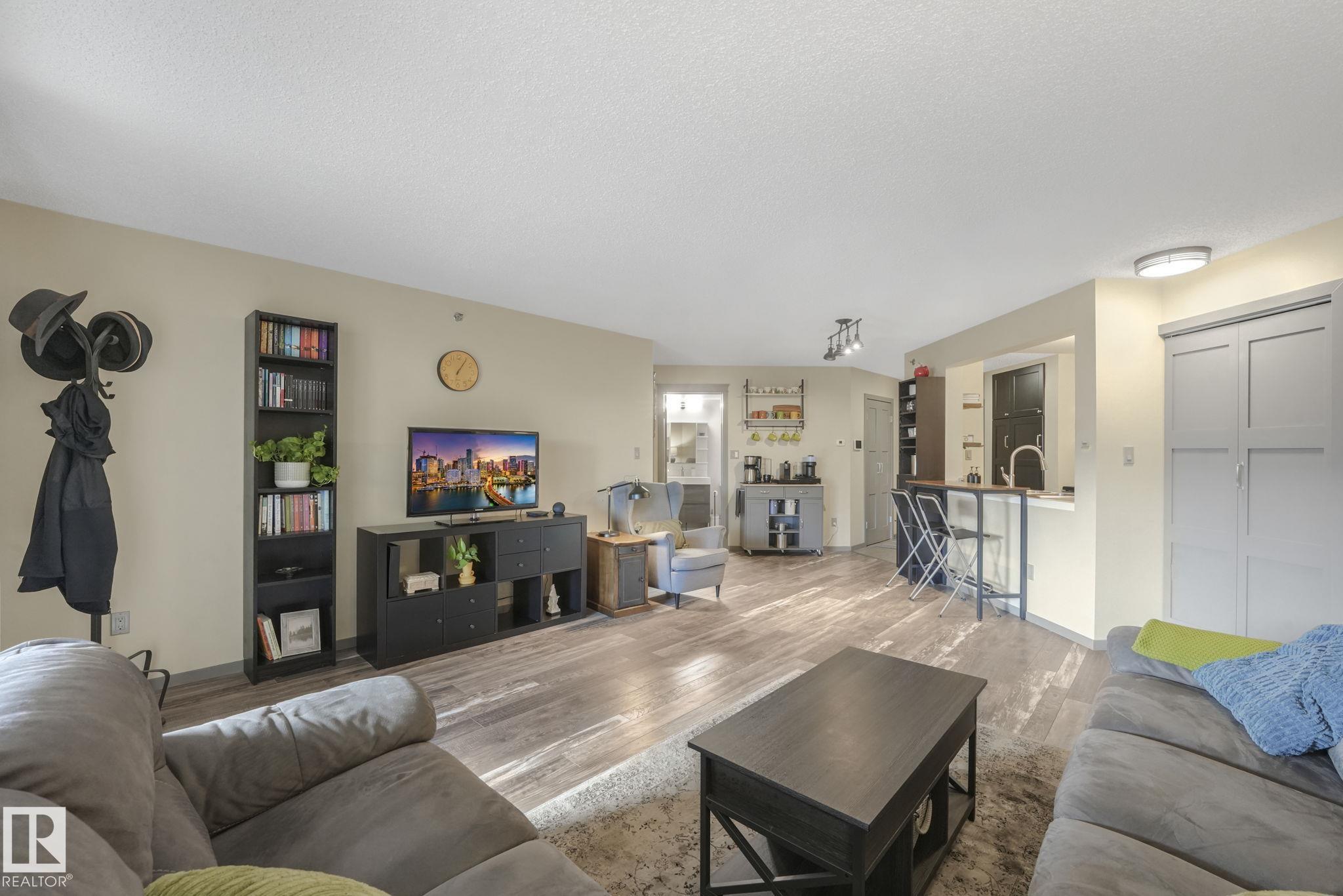 This beautifully upgraded 3rd-floor condo offers modern finishes and an unbeatable walkable location near the LRT, transit, Save-On-Foods, Commonwealth Stadium, Borden Park, Concordia University and the River Valley. The unit features updated flooring, fresh paint, modern lighting and a stylish kitchen with SS appliances. The open living and dining space leads to a huge private balcony, perfect for relaxing, entertaining or enjoying the treed surroundings. The spacious, king-sized primary bedroom offers excellent closet space and plenty of natural light, while the den makes an ideal office or flex room. The fully updated 4-piece bathroom showcases modern tilework, a newer vanity and a clean, contemporary design. Enjoy the convenience of in-suite laundry and impressive storage throughout. Located in a well-run building with many long-term residents, this move-in-ready condo is ideal for buyers or investors seeking a clean, modern home in a vibrant, amenity-rich neighbourhood.