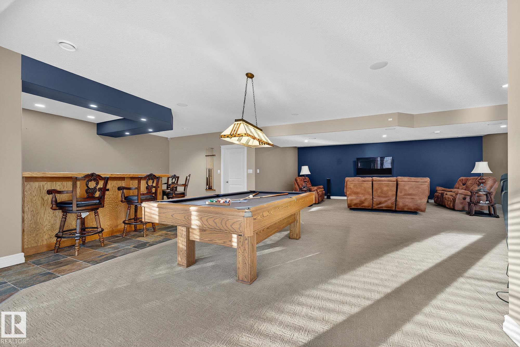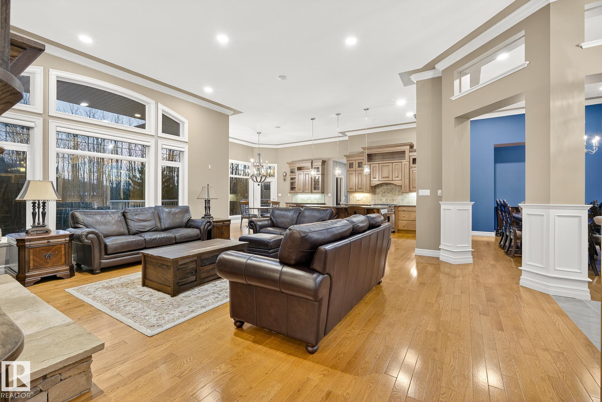 Welcome to Muir Ridge Estates, where luxury meets cozy lakeside living. This executive walkout bungalow offers just under 5,000 sq ft of refined space on a fenced and gated 2-acre treed lot at the end of a quiet cul-de-sac by the lake. Inside, enjoy the open concept chef's kitchen, breakfast nook, 4 bedrooms, 3.5 baths, a formal dining room, dedicated office/den, upstairs laundry, and an inviting fireplace that sets the tone for warm winter gatherings in the main living room. The walkout basement hosts a spacious rec room, wet bar, gym, and ample storage. Step outside to the elevated patio, hot tub, fire pit, and serene views. The oversized heated triple garage includes workshop space, storage, and an attached dog run. A home generator adds peace of mind. With RV/Boat/ATV parking, direct access to canoeing, fishing, trails, and winter recreation, and minutes to Spruce Grove and 30 minutes to Edmonton, this is refined rural living at its most welcoming.