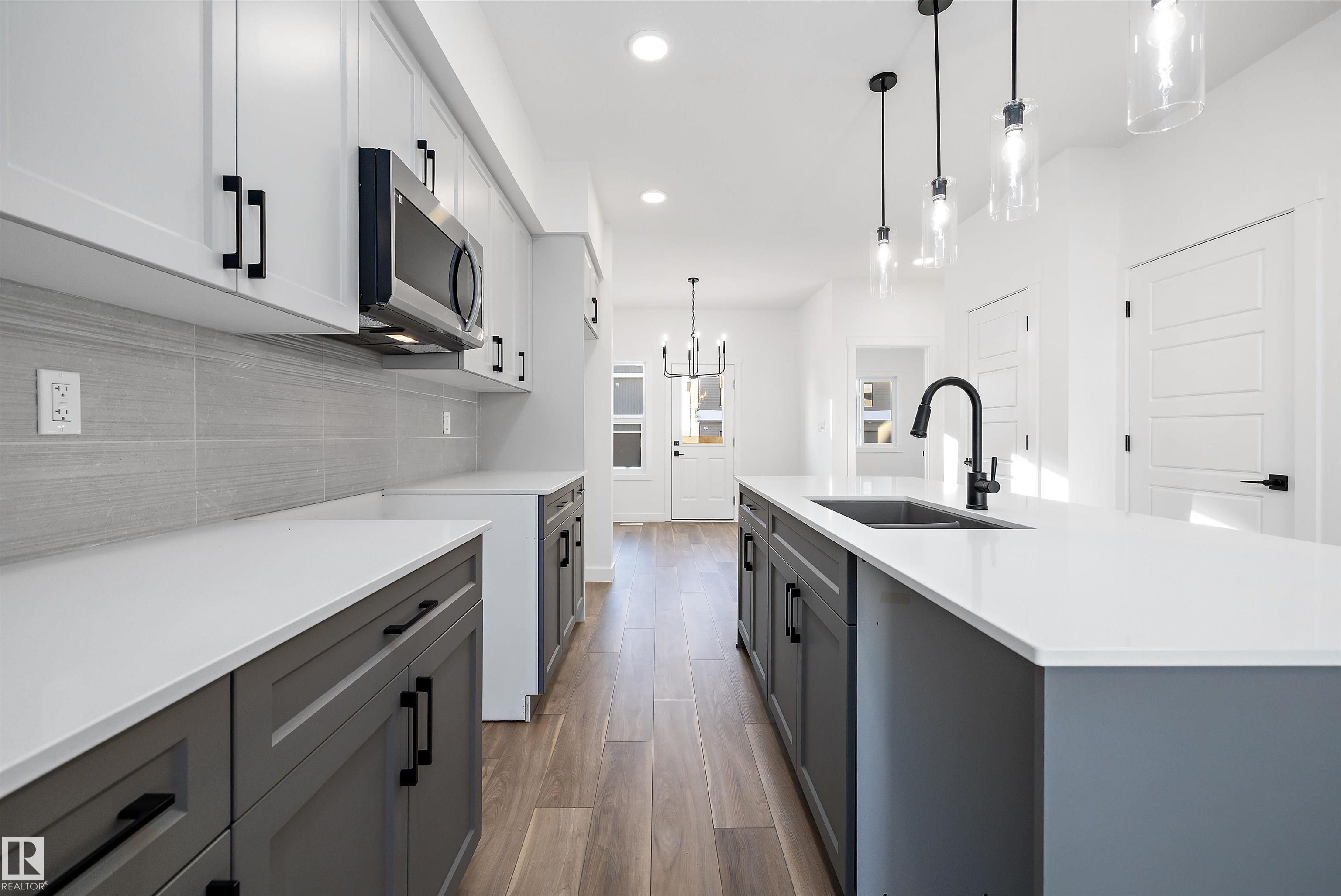 Welcome to the Sylvan by Sterling Homes, a stylish home blending modern design and functionality. The main floor features luxury vinyl plank flooring and a welcoming foyer with coat closet opening to a bright great room. The kitchen offers quartz countertops, island with flush eating ledge, Silgranit undermount sink, pendant lighting, over-the-range microwave, soft-close cabinets with upgraded door profiles, and a pantry tucked near the stairs. At the rear, a sunlit nook overlooks the backyard and sits beside a main-floor bedroom and 3-piece bath with stand-up shower, with a garden door to the outdoors. Upstairs features a primary suite with walk-in closet and 3-piece ensuite, two additional bedrooms, a full bath, and laundry closet. 9’ ceilings on main and basement levels, separate side entrance, black plumbing and lighting fixtures, basement rough-in, and parking pad with option for detached double garage complete this home.