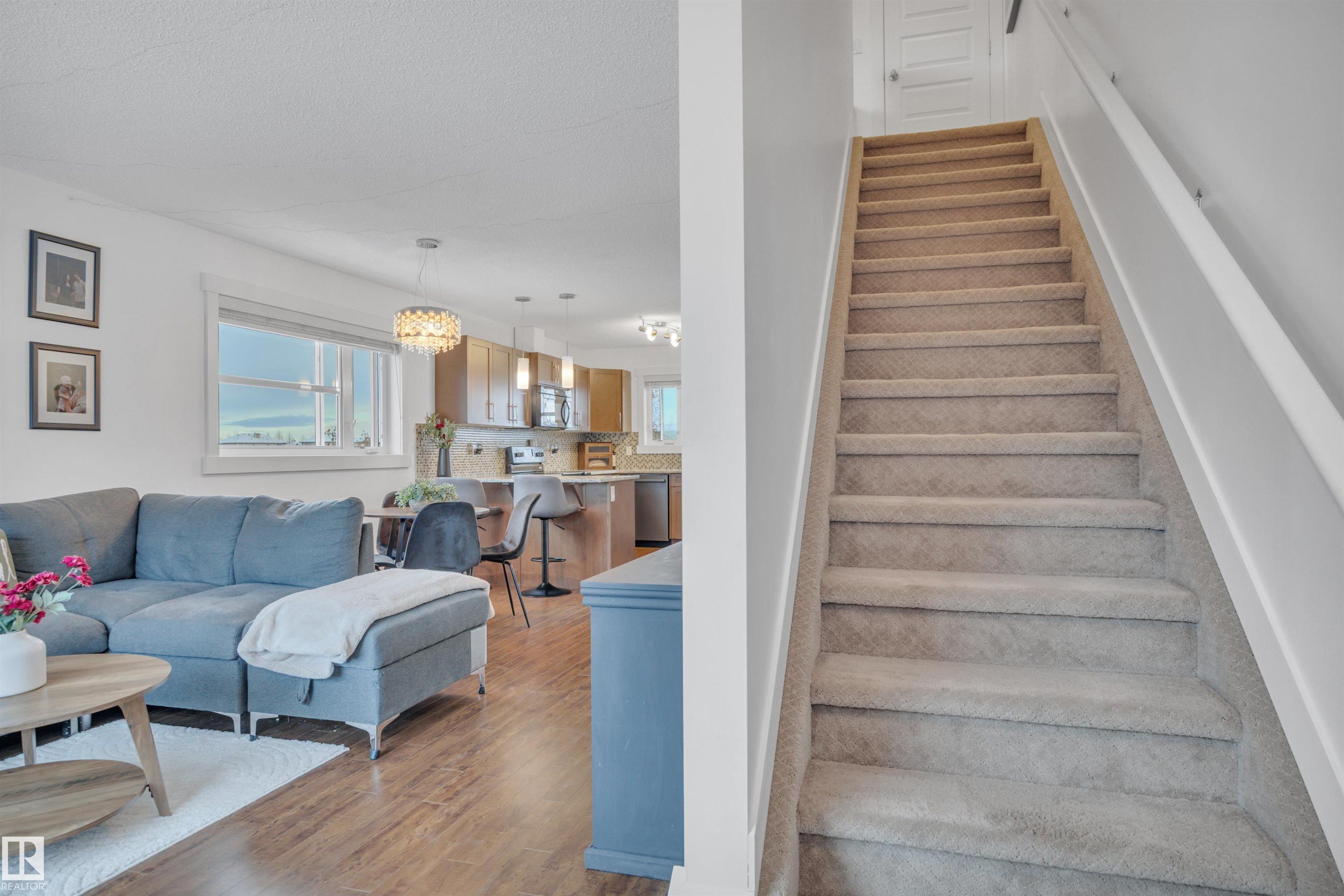 PRIDE OF OWNERSHIP! CORNER UNIT! EPOXY GARAGE FLOOR! Stop renting & start owning! This 1299 sq ft 2 bed, 2.5 bath home w/ 31' DEEP TANDEM GARAGE has been cared for & shows well. Granite countertops w/ subway tile throughout, woodgrain laminate flooring, black appliances w/ newer dishwasher, updated paint, newer custom blinds & more! Main floor living space unites the kitchen / dining / living room together with a true open concept design. 2 pce bathroom & rear deck access for convenience. Upstairs brings duel primary bedrooms, each with their own 4 pce ensuite w/ tile flooring & walk in closet! Upper laundry & linen storage. Private deck for summer BBQs. Quick access to EIA & Hwy 2, amenities, schools, & multiple playgrounds steps away. Condo fees of $408.51 inc snow removal & landscaping, professional management. Terrific first home or investment property; great value!