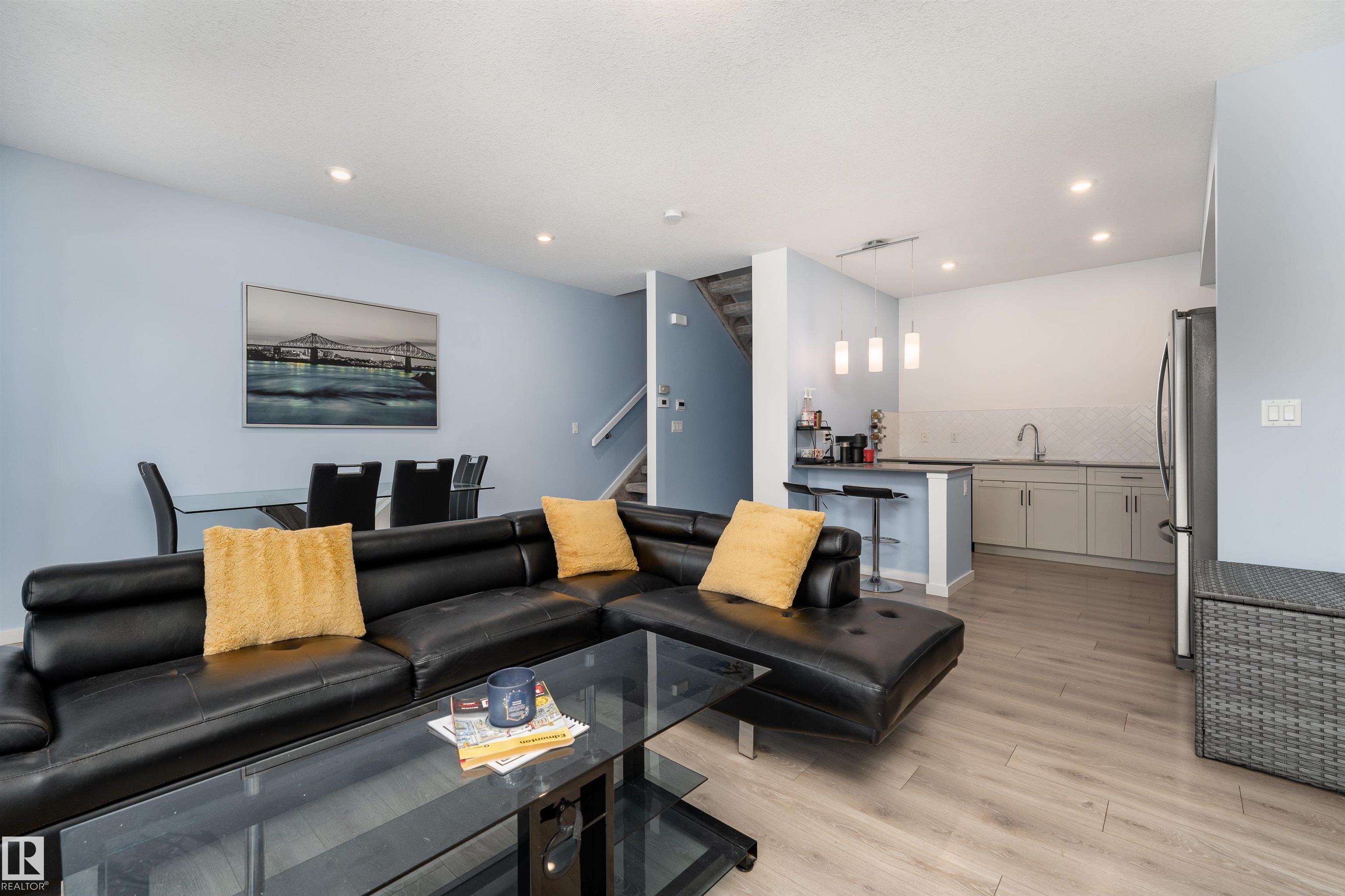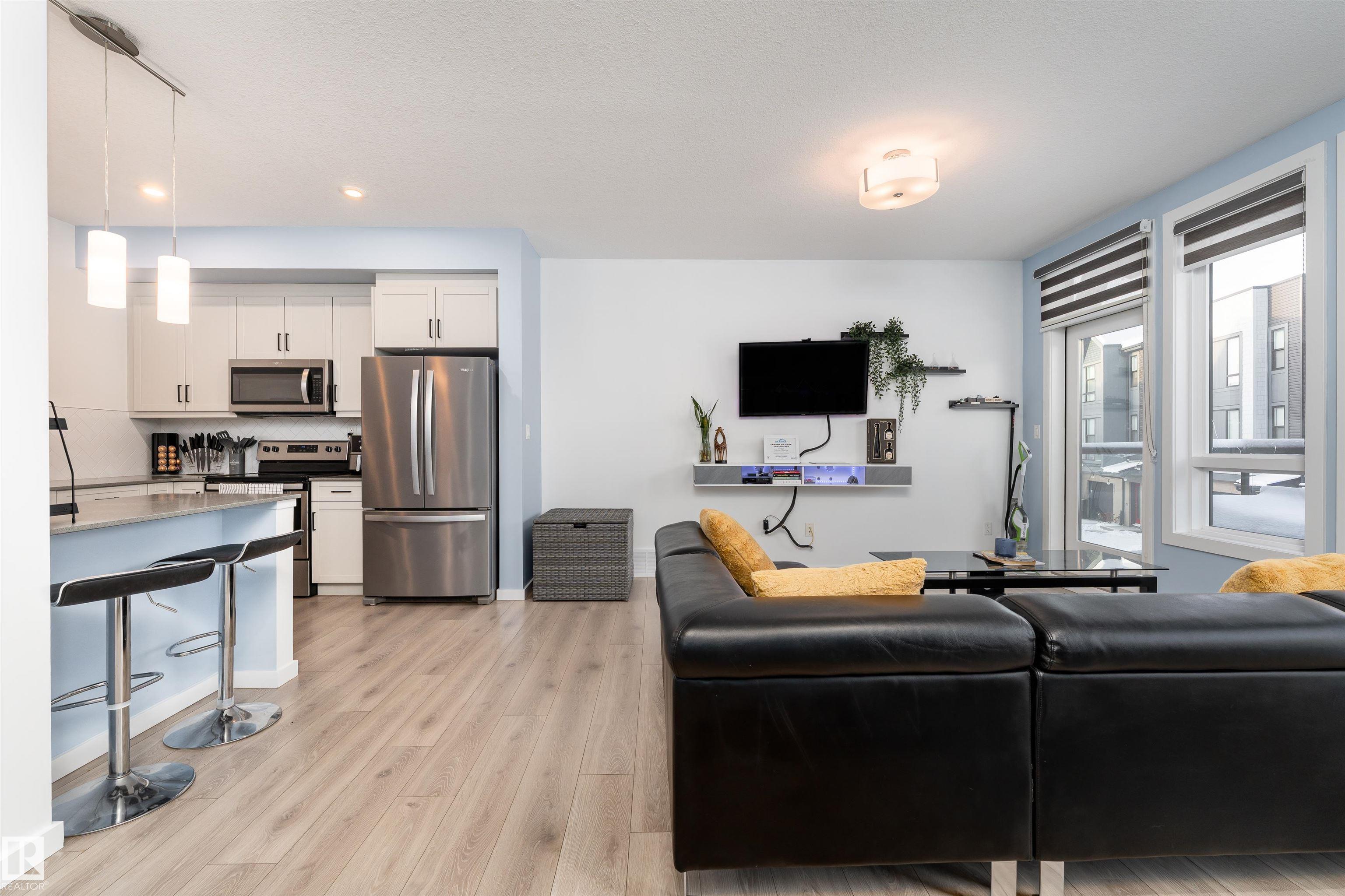Contemporary comfort meets exceptional value in Rutherford! This stylish 3-storey townhome offers a fantastic entry into South Edmonton living with impressively low condo fees. Step inside to a welcoming foyer with easy access to the fully finished attached garage. The sun-filled main level showcases soaring windows, a sleek open-concept kitchen complete with quartz countertops and stainless steel appliances, a designated dining area, and a modern living space perfect for entertaining. The upper level features 2 spacious bedrooms, including a king-sized primary retreat with a walk-through closet and a private ensuite boasting an oversized shower. A full 4pc bathroom and convenient upstairs laundry complete this floor. Added perks include a main-floor 2pc powder room, custom garage storage and built-ins, and guest parking located just steps from the unit. Ideally located near trails, green spaces, schools, shopping, and major commuter routes.