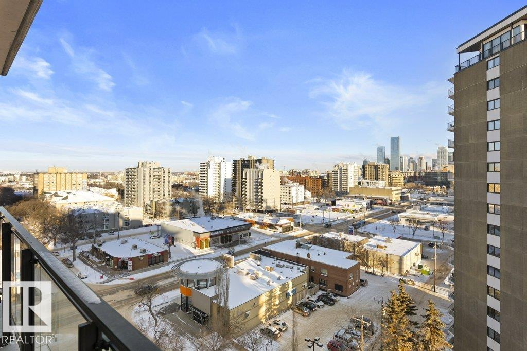 Elevate your downtown lifestyle in this IMMACULATE 11th-FLOOR executive condo with 2 bedrooms + DEN, 2 full baths, 2 TITLED UNDERGROUND parking stalls w/ storage PLUS the rare bonus of only 4 UNITS PER FLOOR for added privacy! This bright CORNER UNIT offers stunning east & north city views through FLOOR-TO-CEILING windows and a large balcony w/ natural gas BBQ hookup, perfect for entertaining above it all. A thoughtfully designed space features hardwood floors, a modern kitchen with granite counters, tons of cabinets, and a versatile den ideal for a home office or dining space. The spacious primary suite includes a WALK-IN closet & spa-inspired 5-PIECE ENSUITE with soaker tub and DOUBLE sinks. Enjoy year-round comfort with a heat pump system (furnace & A/C replaced in 2022) and in-suite laundry. Well-managed building w/ gym and ample visitor parking. Steps to Jasper Ave, restaurants, river valley trails, and everything downtown has to offer, this is urban living done right!