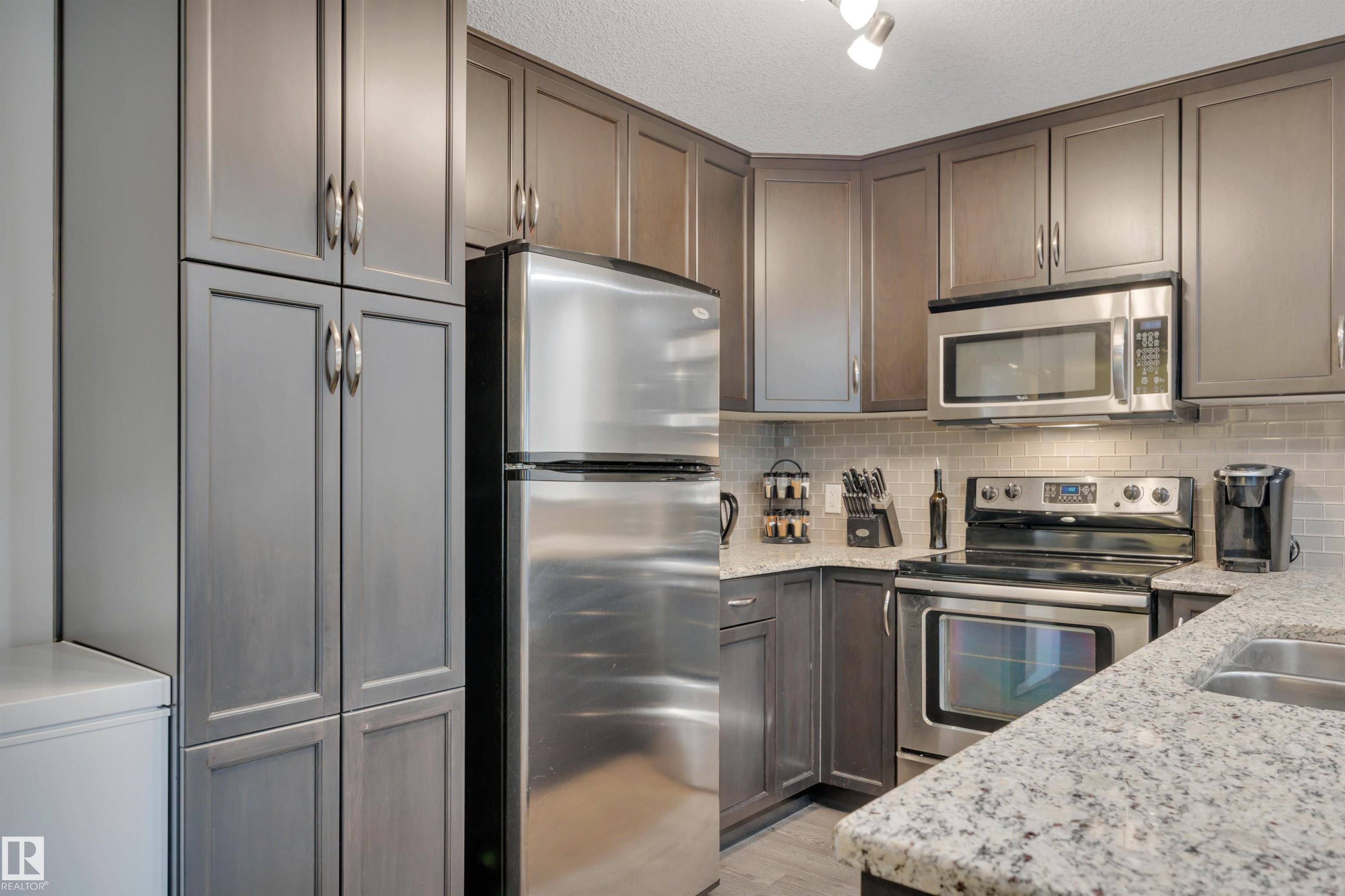 Beautiful well cared for building in a great neighborhood for a low maintenance condo lifestyle here. Laminate floors run through the open kitchen, living & dining areas. The kitchen features granite counters, raised bar, pantry & stainless steel appliances. Split-bedroom layout offers privacy—two bedrooms separated by the living room. Separate laundry/storage room for in-suite laundry. The sliding door opens to a private, treed patio overlooking greenspace. The primary suite includes a walk-through closet & 3-pce ensuite with oversized shower & seat. Second bedroom is generous with a large closet, right beside the 4 pce bathroom. Ideally located, with quick access to Ellerslie, Henday & Hwy 2 to EIA, with all essential shopping nearby. Two titled Parking spots! One outdoor stall & one underground parking with storage locker. This clean & nicely finished condo offers extras like a fitness centre, social room with pool table & guest suite. A perfect balance of comfort, convenience & low-maintenance living!