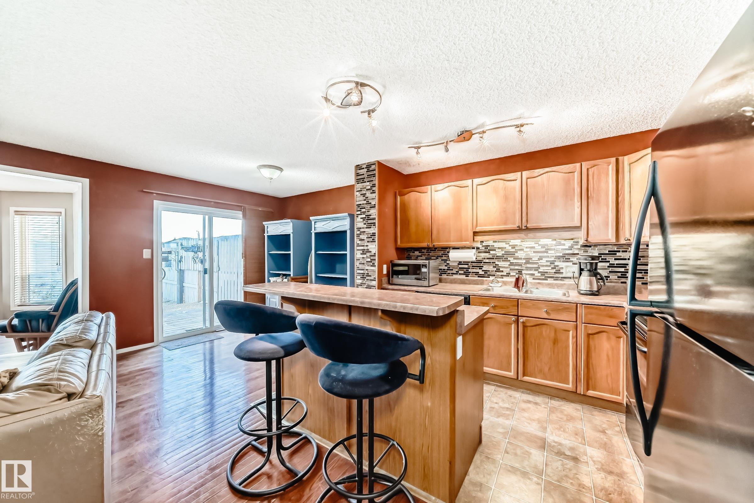 Welcome to Silver Berry and this unique 2-storey duplex, offering over 1,694 sq ft of total finished living space with 1,331 sq ft above grade, all situated on a massive pie-shaped lot backing onto greenbelt and walking trails. This home features two very spacious bedrooms and two bathrooms. The main floor featuresa an open-concept layout with a bright living room highlighted by a warm gas fireplace, a cozy dining area, and a functional kitchen with ample cabinetry. A bonus flex room addition (2009) provides stunning views of the park-like backyard oasis. The exterior is accented with stone for added curb appeal. The finished basement includes a family/games room. Recent updates include newer washer, fridge, central air conditioning, and shingles replaced in 2024. Enjoy the large deck accessed through patio doors, beautifully landscaped grounds, a rock garden, mature trees, and a garden shed for extra storage. Close to schools, shopping, transit, parks, and major roadways like Whitemud & Anthony Henday.