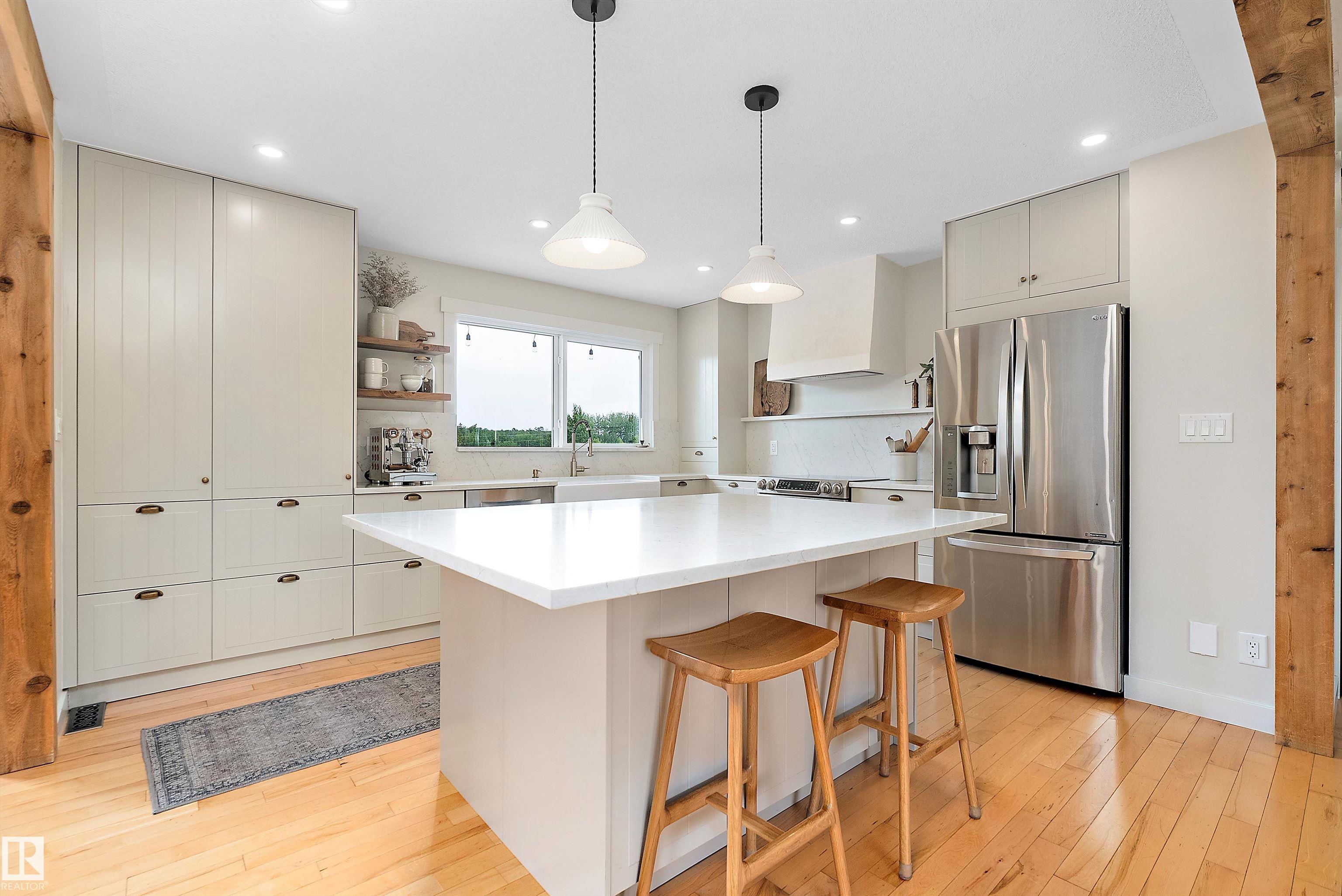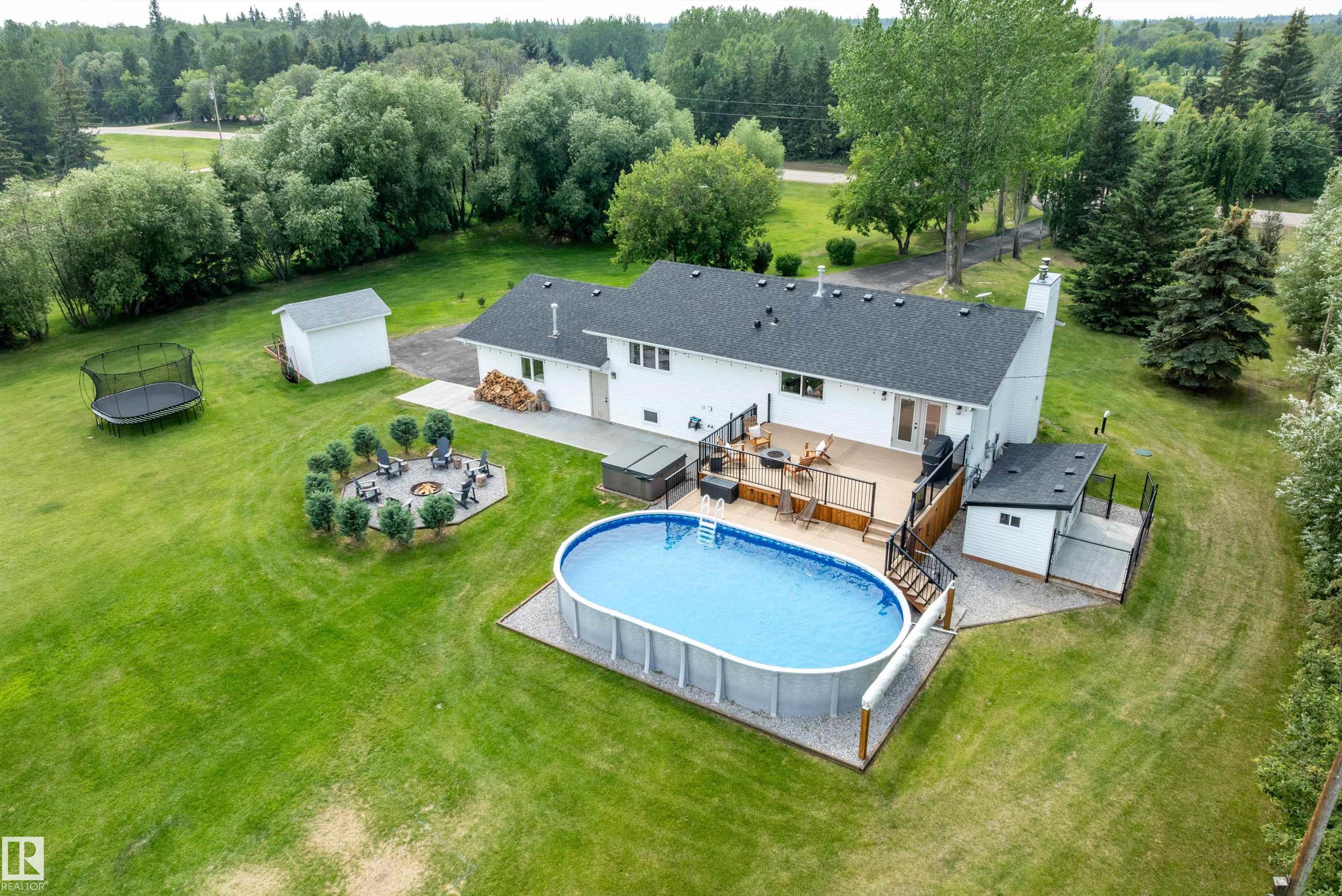 Resort-Style Acreage with Rare Rear Access! Gorgeous home, gorgeous property! Over 2,600 sq. ft. of fully developed living space on a private 3.14-acre property offering exceptional functionality and outdoor living. The home is fully, professionally renovated, featuring a full kitchen replacement 2 years ago and a new roof in 2020. Large windows provide excellent natural light throughout. Outdoor features truly set this property apart, including a heated pool with pool side deck, a large upper rear deck (2020), hot tub, and an inground fire pit framed by juniper trees. The decks are built out of high-quality PVC decking. The grounds are beautifully maintained, with lush, incredibly green grass. Ideal for hobby farming or storage, the property includes a pasture just under one acre, hobby farm barn, heated 3-bay storage/dog shed, and electric dog fence to keep your pup from wandering. A rare acreage offering space, privacy, and versatility.
