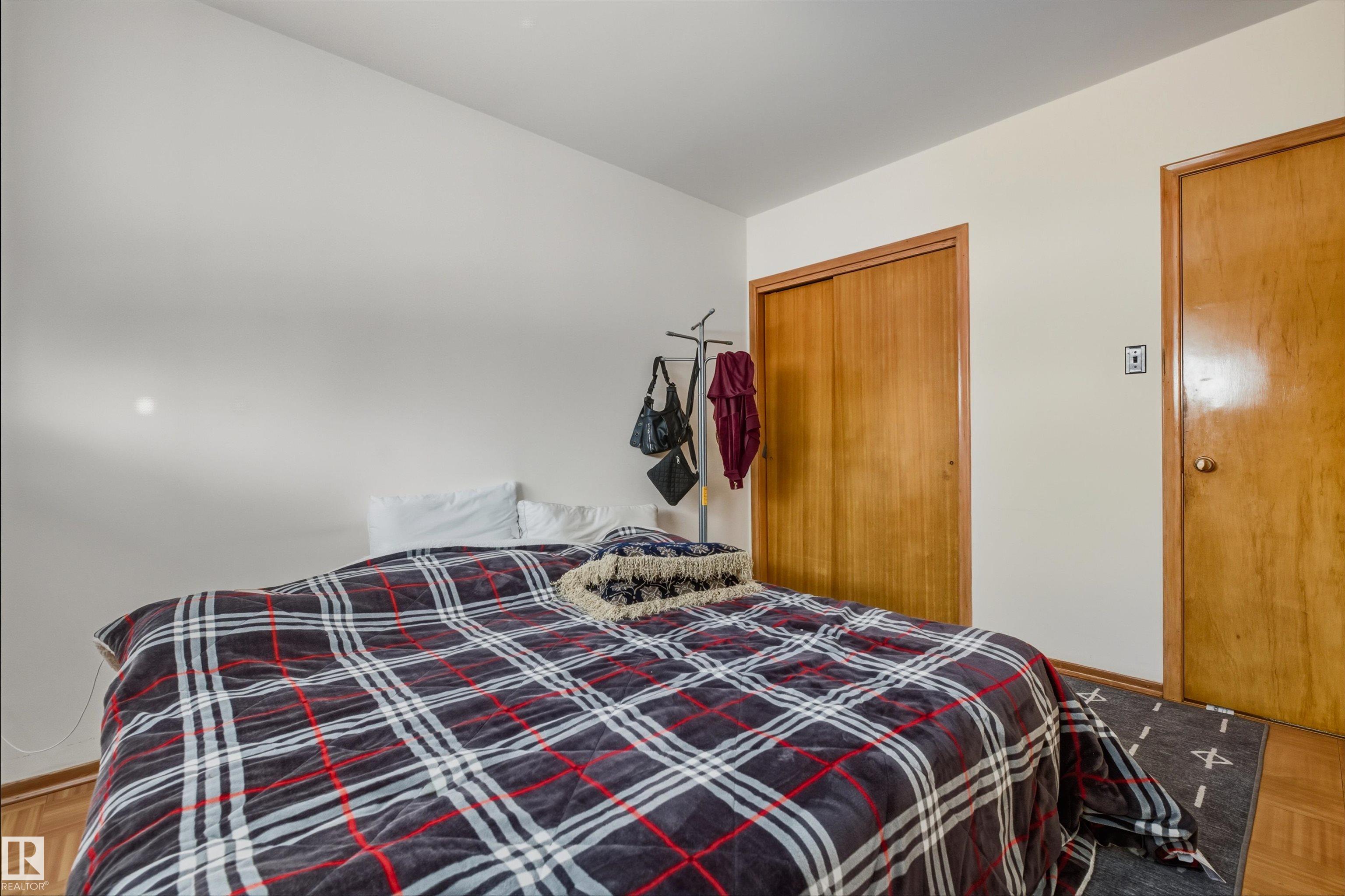 Welcome to this timeless 5 bedroom bungalow! Tucked away on a quiet street, this gem features hardwood floors hidden beneath the shag carpet. Bright and spacious eat in kitchen overlooking the large, fenced yard with mature apple trees. This home radiates good energy and solid bones, the perfect opportunity to create your family dream home or a great investment for flippers or landlords. The high ceiling basement offers excellent potential for a secondary suite with a separate entrance. Outside, enjoy the oversized double heated garage. Extra parking for 2 vehicles and and a cement pad ready for a boat or RV. Unbeatable location across from park with off leash dog area, near grand trunk arena, pool and leisure center. Minutes from shops on 97st, schools, transit and restaurants. 15 min drive to downtown. Dont miss out on this charming gem!!