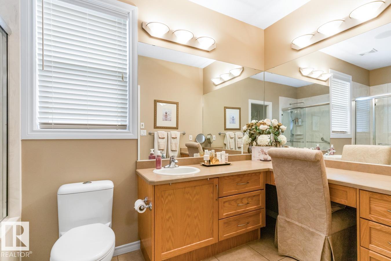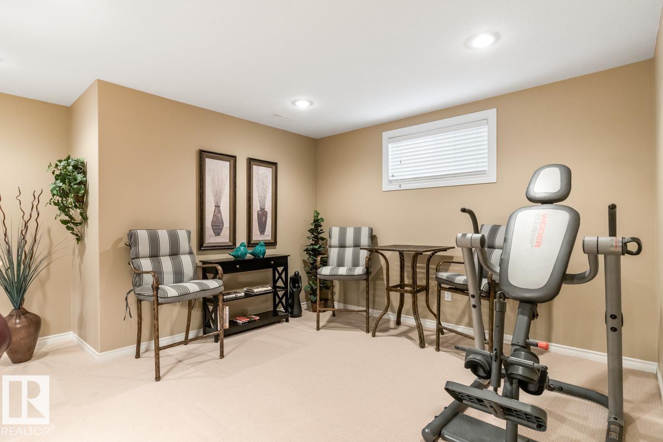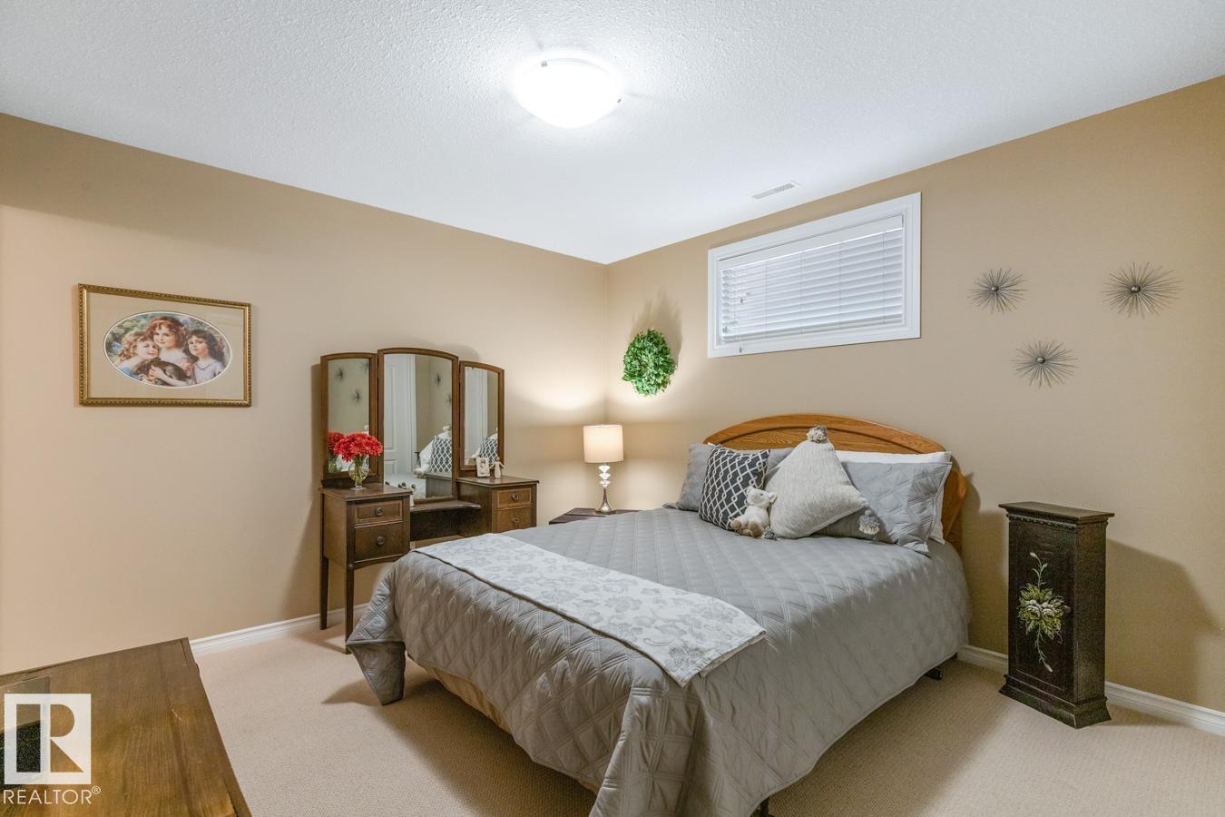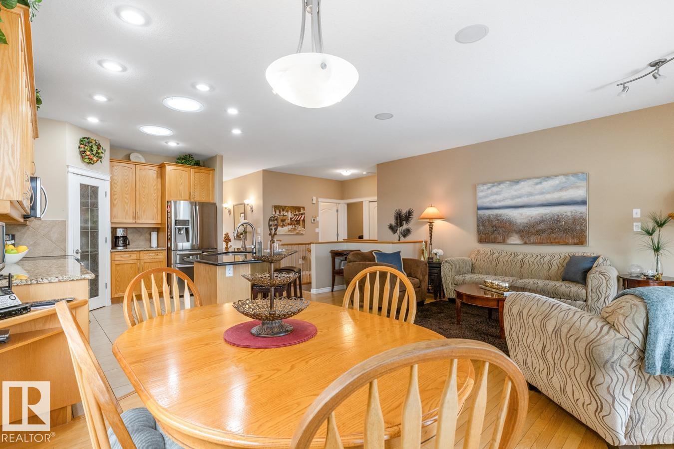 This IMMACULATE Salvi-built bungalow is tucked away on a quiet street in the desirable community of The Ridge and is ready for its next family. Step inside to a bright, open layout featuring 9’ ceilings with tile and hardwood flooring throughout. The kitchen offers ample cabinetry, corner pantry, stainless steel appliances, and a granite waterfall island overlooking the dining and living area with cozy fireplace. The king-sized primary suite features a walk-in closet and ensuite with 5’ shower and makeup vanity. A generous second bedroom with walk-in closet, 4-pc bath, flex room, and laundry complete the main floor. The fully finished basement boasts a spacious family room with second fireplace, two additional bedrooms, 3-pc bath, and large storage room. Enjoy the fully fenced, landscaped yard with maintenance-free deck and 8x8 shed. 25x20 heated garage, A/C, and an unbeatable location close to schools, parks, trails, and amenities complete this exceptional home.