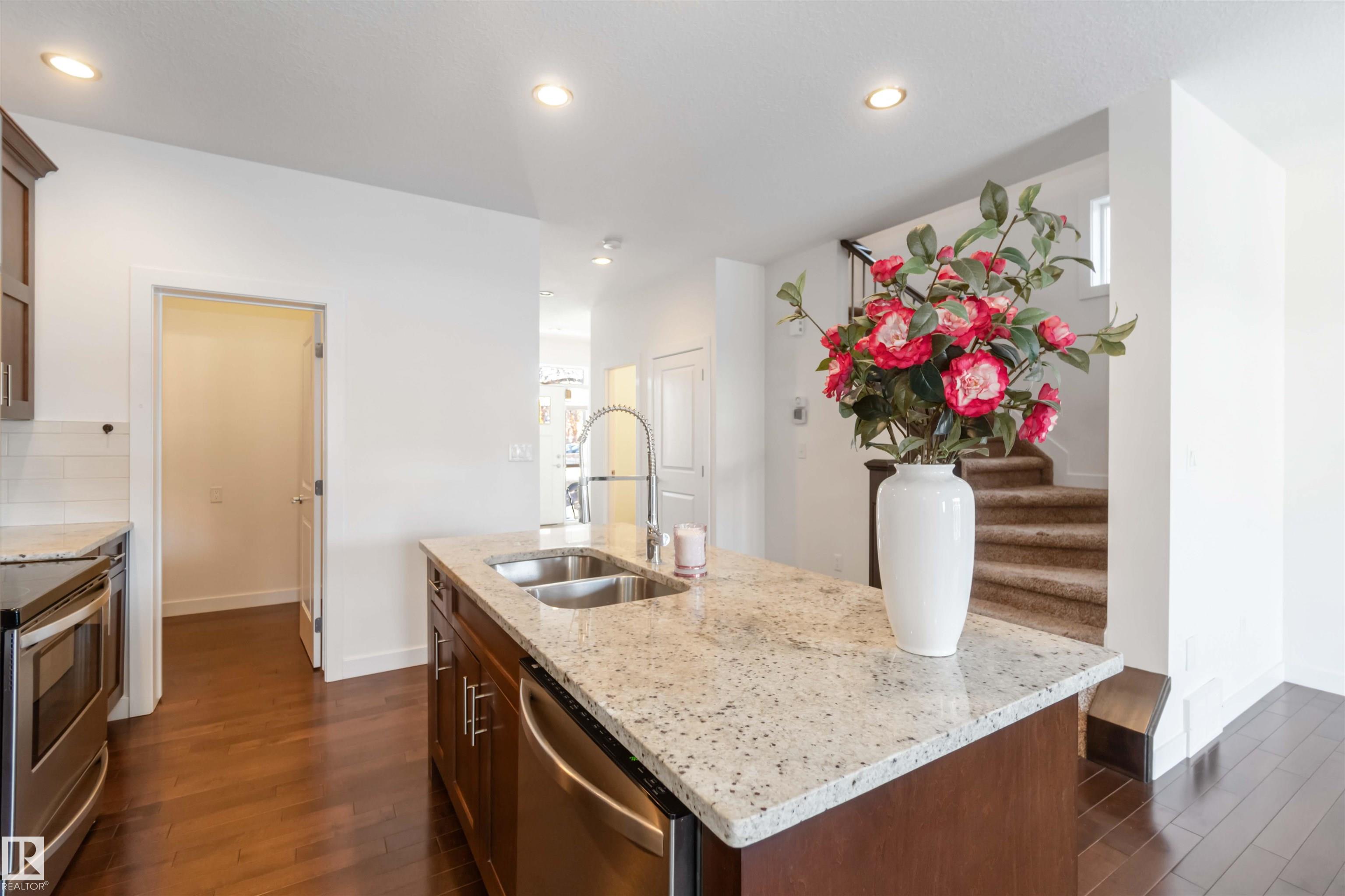 Inglewood welcomes you to this well-maintained half-duplex home offering 4 bedrooms, a den, 3.5 bathrooms, a fully finished basement. The main floor features beautiful, well-cared-for hardwood flooring, a large den near the front entry, a 2-piece bathroom, a spacious living room, & a stunning kitchen w/ a large granite island, rich wood cabinetry, SS Appliances & granite countertops.The upper level offers 3 spacious bedrooms, including a primary bedroom w/ a stunning 5-piece ensuite, plus a 4-piece bathroom, laundry room, & plush high-end carpeting throughout. A separate side entrance leads to the fully finished basement, complete w/ a large living room, kitchen, 4-piece bathroom, & a generous bedroom. The basement offers potential for conversion to a legal suite.The backyard is perfect for entertaining & provides access to the double garage. Conveniently located close to premier schools, NAIT Campus, Grant MacEwan University, easy access to the University of Alberta via Groat Road, and shopping centres.