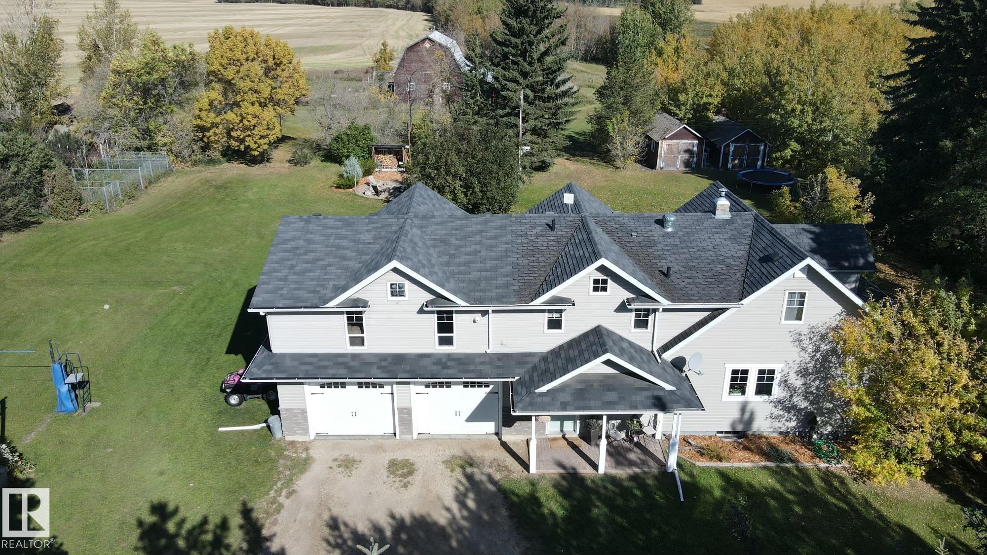 Must see on a PARK LIKE SETTING! An amazing updated farmhouse offers over 2590sf, nothing is missing from this home. Step inside, be amazed by the unique charm of the 3 bedrooms and the massive bonus room. Originally built in 1940, it seamlessly blends modern upgrades with old-school charm. From the electrical/plumbing/heating to the newer cistern & addition, every detail has been thoughtfully updated. Immerse yourself in the best of both worlds with the original hardwood floors and modern amenities. Outside, the 2.74acres beckons you to explore. From the beautifully landscaped yard to the composite deck, you'll find tranquility at every turn. As you venture further, you'll be captivated by the sight of the original red barn, proudly standing tall. With stables and a loft, it's perfect for housing your horses. Located just 7 minutes from Spruce Grove and outside of subdivision, this home offers the convenience you want and the privacy you deserve, and don't forget your skates, a game of shinny awaits.
