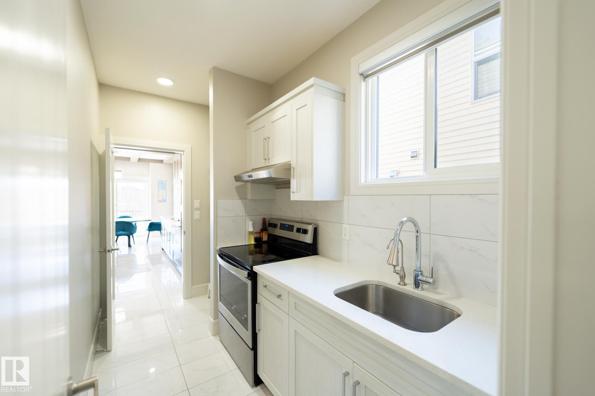 Welcome to this exceptional home in the heart of Maple Crest, situated on a massive lot backing onto green space, walking trails, and a ravine/environmental reserve. Designed for modern family living, this home offers 5 bedrooms and 3 full bathrooms, including a main floor bedroom with full bath—perfect for parents, guests, or multi-generational living. The bright open-concept layout features a vaulted, open-to-above front entry, spacious living area, and a stylish kitchen with quartz countertops, upgraded cabinetry, pot & pan drawers, and a separate spice kitchen, plus a dining nook overlooking the backyard. Upstairs includes 4 generous bedrooms, a large bonus room, and convenient upper laundry. Separate side entrance to basement for future suite potential. Oversized double attached garage fits full-size trucks. Close to schools, shopping, parks, and all amenities—an ideal family home in a prime location.