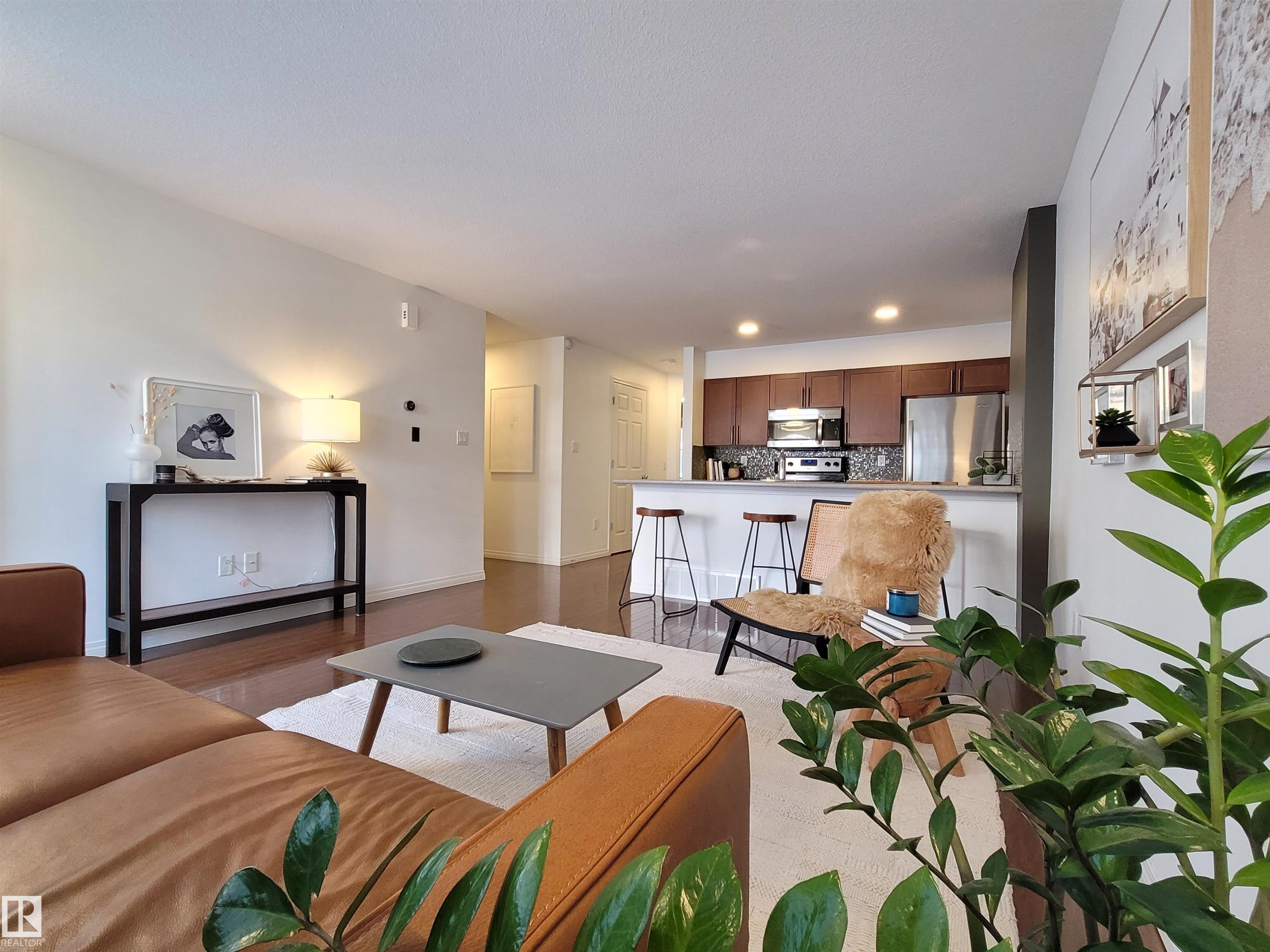 Well maintained 783 sq. foot single level townhome located in the beautiful neighborhood of South Terwillegar. The entrance opens to a bright living room with a huge front window that allows for abundance of natural light. Modern kitchen features maple cabinetry and stainless steel appliances. Two generous bedrooms and a modern bathroom with stack washer/dryer. The lower level includes the mechanical room and a two-car tandem garage. Located near community garden, church, cafe, Rec Centre, bus stations, schools and restaurants. Welcome home!!!