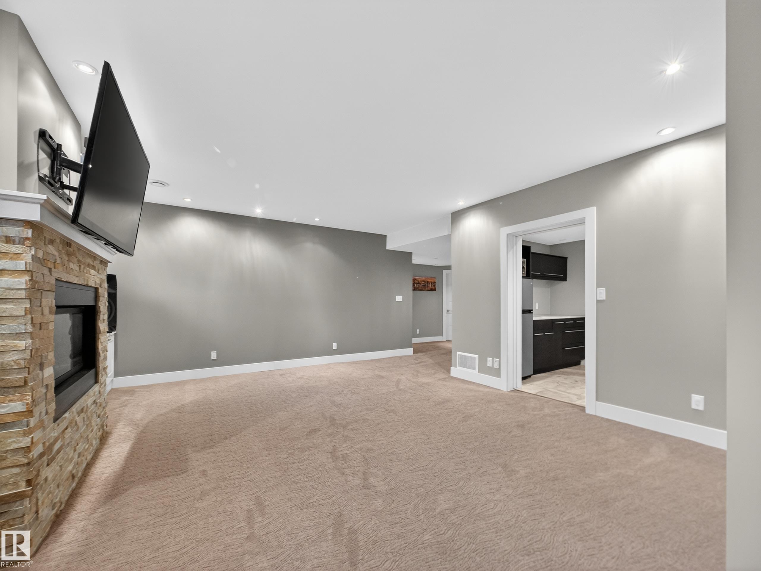 Elegant 5-bedroom Carriage Custom-built home in the sought-after community of Terwillegar Gardens. The main floor features an inviting foyer, a bright living room with vaulted ceilings, expansive windows, gas fireplace, and chandelier. The kitchen offers quartz countertops, modern cabinetry, stainless-steel appliances, and a corner pantry. A formal dining room is ideal for entertaining, while the rare main-floor primary suite includes a walk-in closet and spa-inspired 5-piece ensuite. Upstairs are three large bedrooms, a 5-piece bath, and a den with built-in cabinetry. The finished basement adds a fifth bedroom, gym, 3-piece bath, kitchenette, laundry/storage area, and a spacious family room with gas fireplace. Recent upgrades include two furnaces, two A/C units, and two humidifiers. Located on a large corner lot with a maintenance-free deck, concrete patio with firepit, and artificial turf. A refined family home in a premier location.