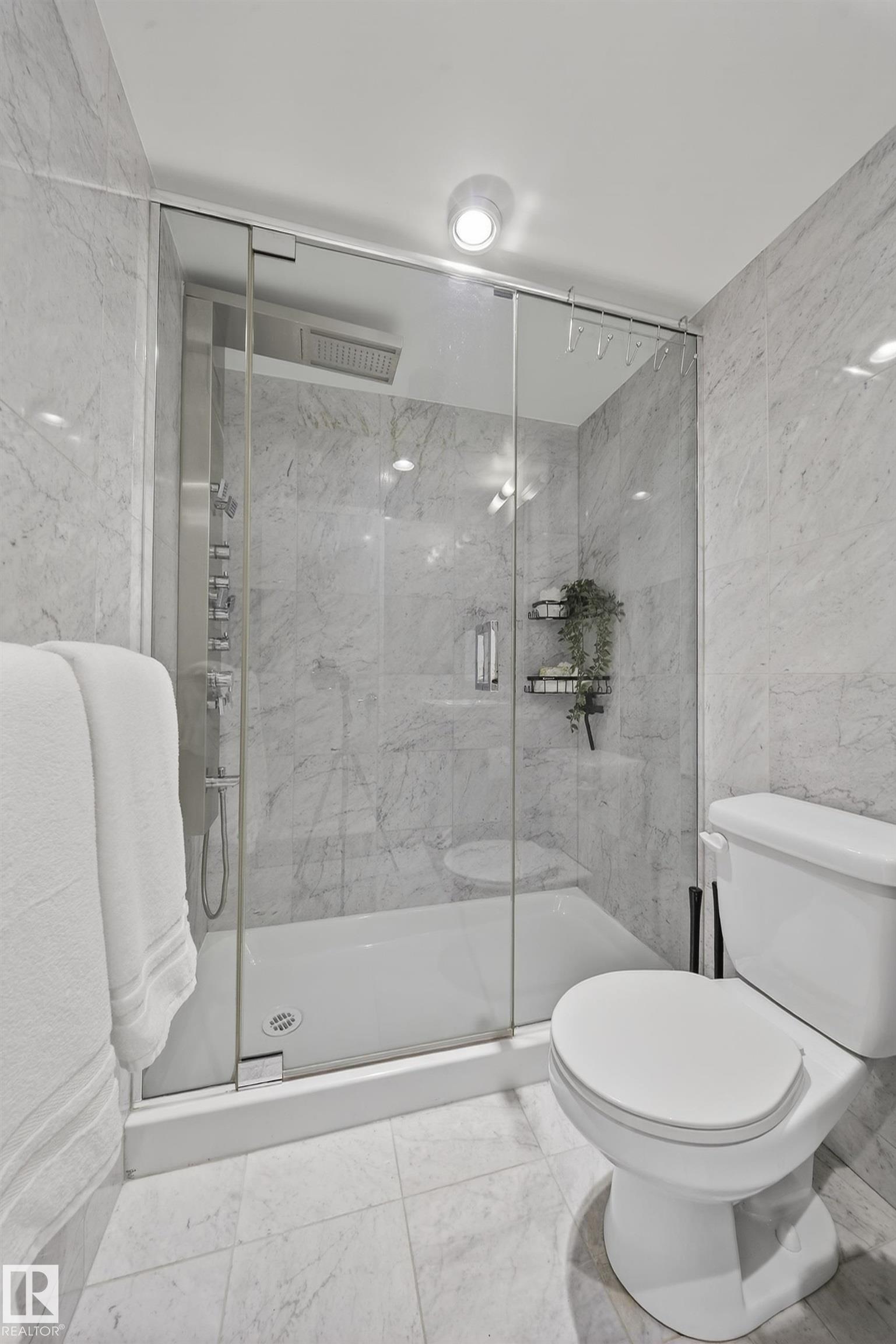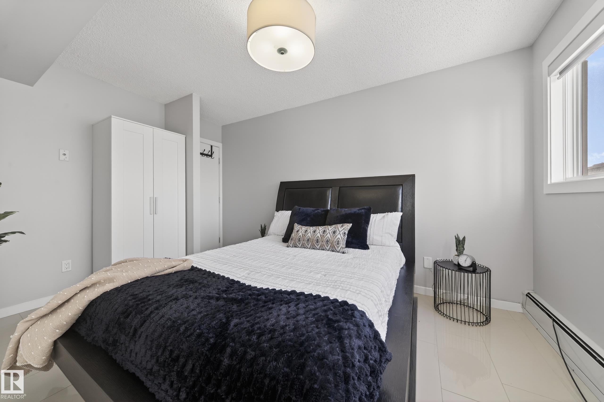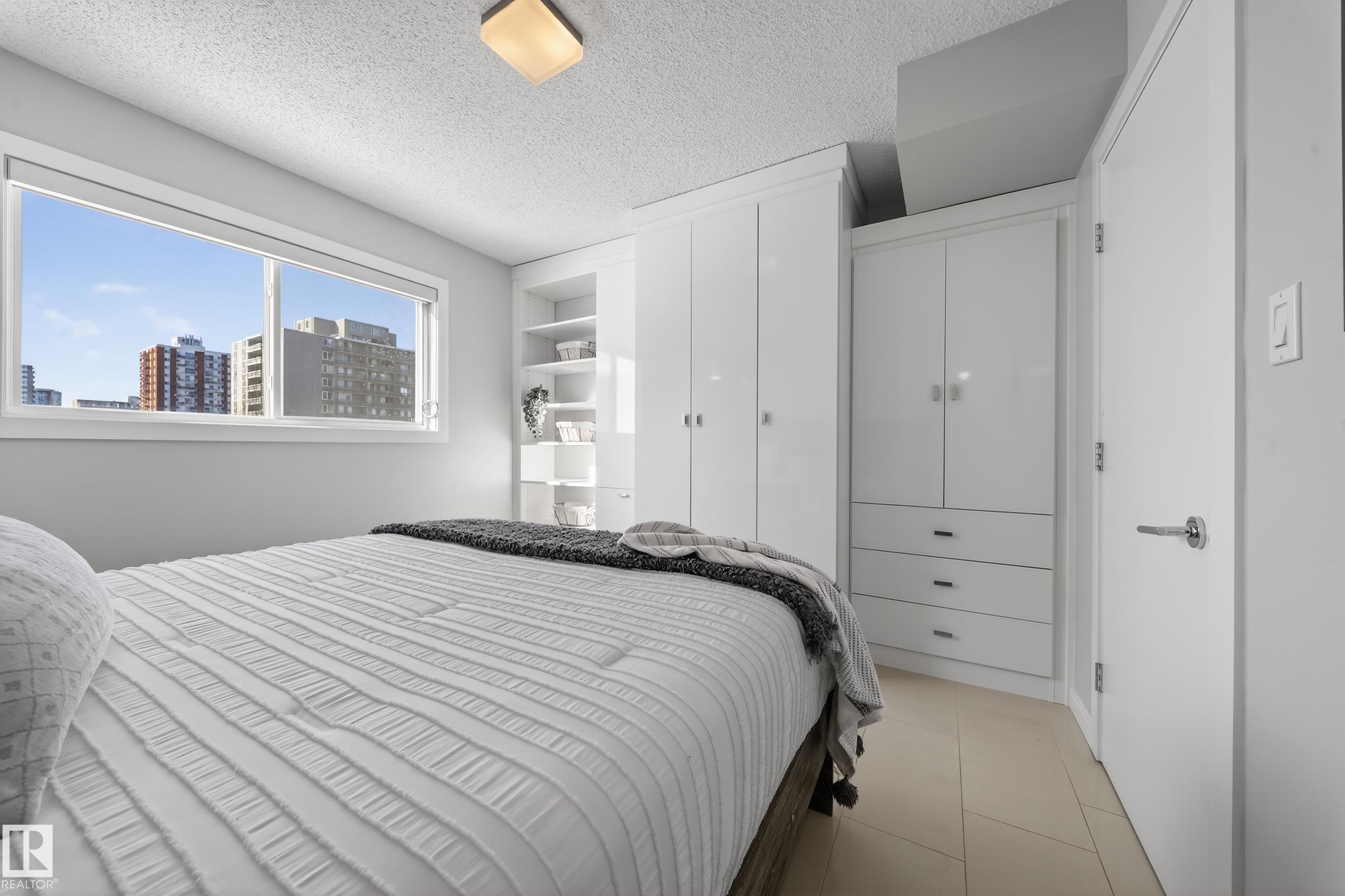 Welcome to this beautifully maintained and freshly painted 5th-floor downtown 2 bedroom, 1 bathroom condo offering modern style and exceptional convenience. The bright and spacious living room features one large picture window that fills the space with natural light and creates an inviting atmosphere, with ample room for comfortable seating and dining. Durable tile flooring runs throughout with no carpet for a clean, contemporary look and easy upkeep. The sleek kitchen showcases 3 cm quartz countertops, built-in appliances, electric cooktop, and a functional breakfast bar. Enjoy your private balcony/patio for fresh air and city views. The bathroom features a high-end multi-jet shower with LED light panel for a spa-like feel. Additional highlights include in-suite washer and dryer, air conditioning, one parking stall, clean lobby with elevator access, and condo fees that include heat and water. Ideally located near River Valley trails, University of Alberta, transit, shopping, and downtown amenities.
