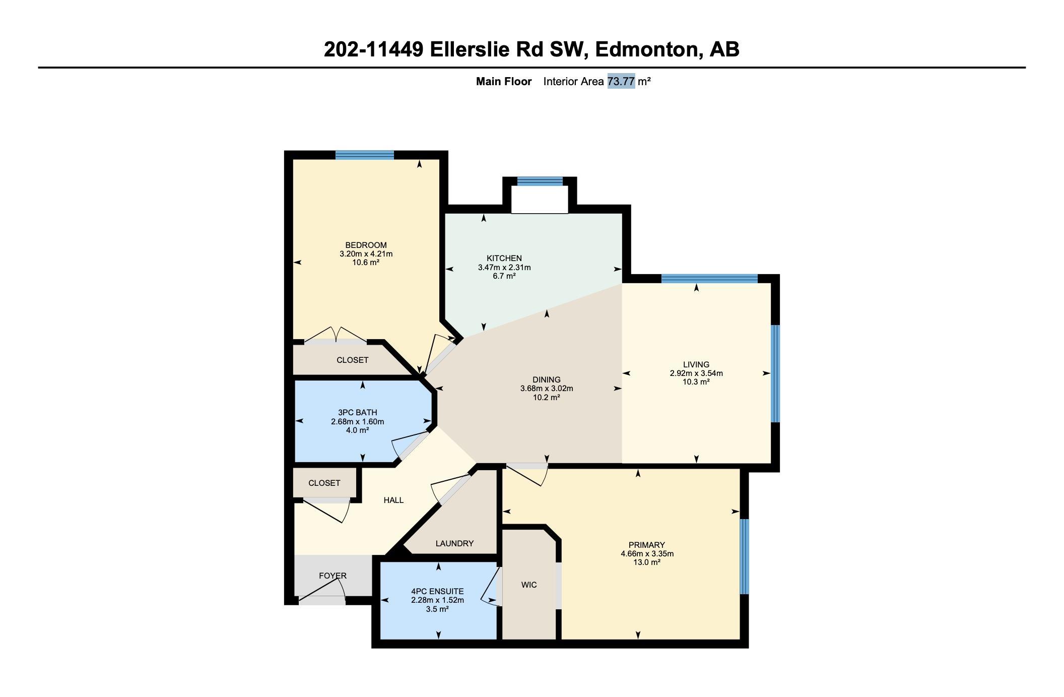 Bright, bold, and beautifully positioned, this SW facing, CORNER UNIT is 794 sq.ft & flooded with natural light, ready to impress! Offering 2 bedrooms and 2 bathrooms, the open layout features oversized windows and a spacious living room that feels airy and inviting. The kitchen shines with light wood cabinetry, dark appliances and countertops, generous counter space, and breakfast bar seating, perfect for everyday living or entertaining. Both bedrooms are generously sized with great closet space, and the primary retreat includes a private 4 piece ensuite, plus an additional 3 piece bath and in suite laundry for added convenience. Enjoy the bonus of two heated underground parking stalls. Located in Southwest Edmonton close to shopping, schools, golf, transit, and with quick access to the Anthony Henday Drive, this is an opportunity you do not want to miss.