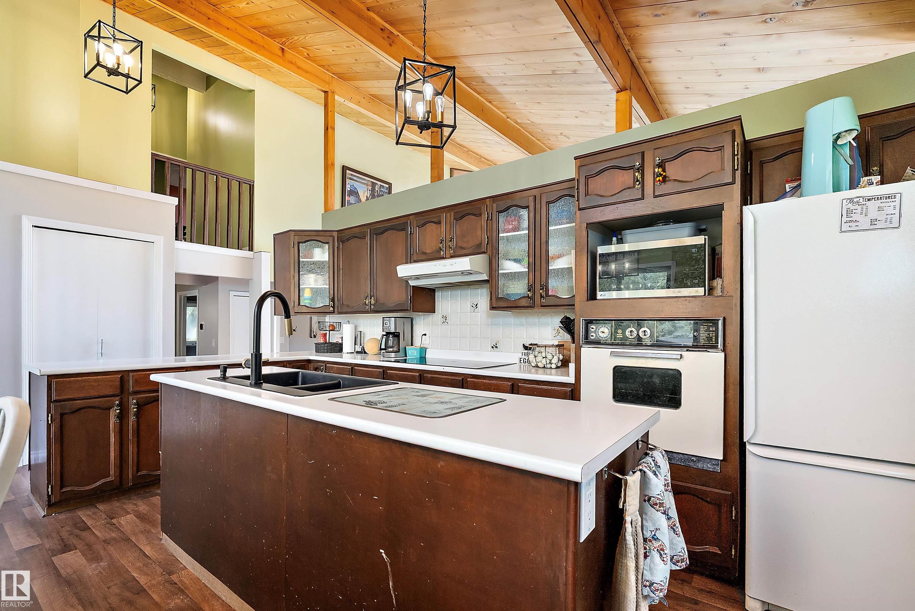 Minutes from town on paved roads, you'll find a private, tree lined driveway that leads you to this idyllic 3.4 acre acreage. It's a dreamy landscape of rolling hills & wide open spaces surrounded by trees. Inside you'll find over 2200 sq ft of finished living space with 5 huge bedrooms (4 up) and 3 baths. The home captivates with vaulted wood beam ceilings & soaring windows flooding the the living room in natural light, a sprawling kitchen with large island & a sunken cozy family room with gas fireplace. Shingles, both furnaces, hot water tank and 24x36' garage (with 8' doors & 10' ceilings & heater) were done in 2019. Induction cooktop in 2019, carpets 2020, AC in 2021, & dishwasher 2024. Zoned for stony plain school with bussing available & minutes to town - you can have the dream acreage without sacrificing convenience! If you've been waiting for a large home with room for everyone, character, most of 'the big stuff' done so you can unleash your creativity in cosmetic updates...welcome home!