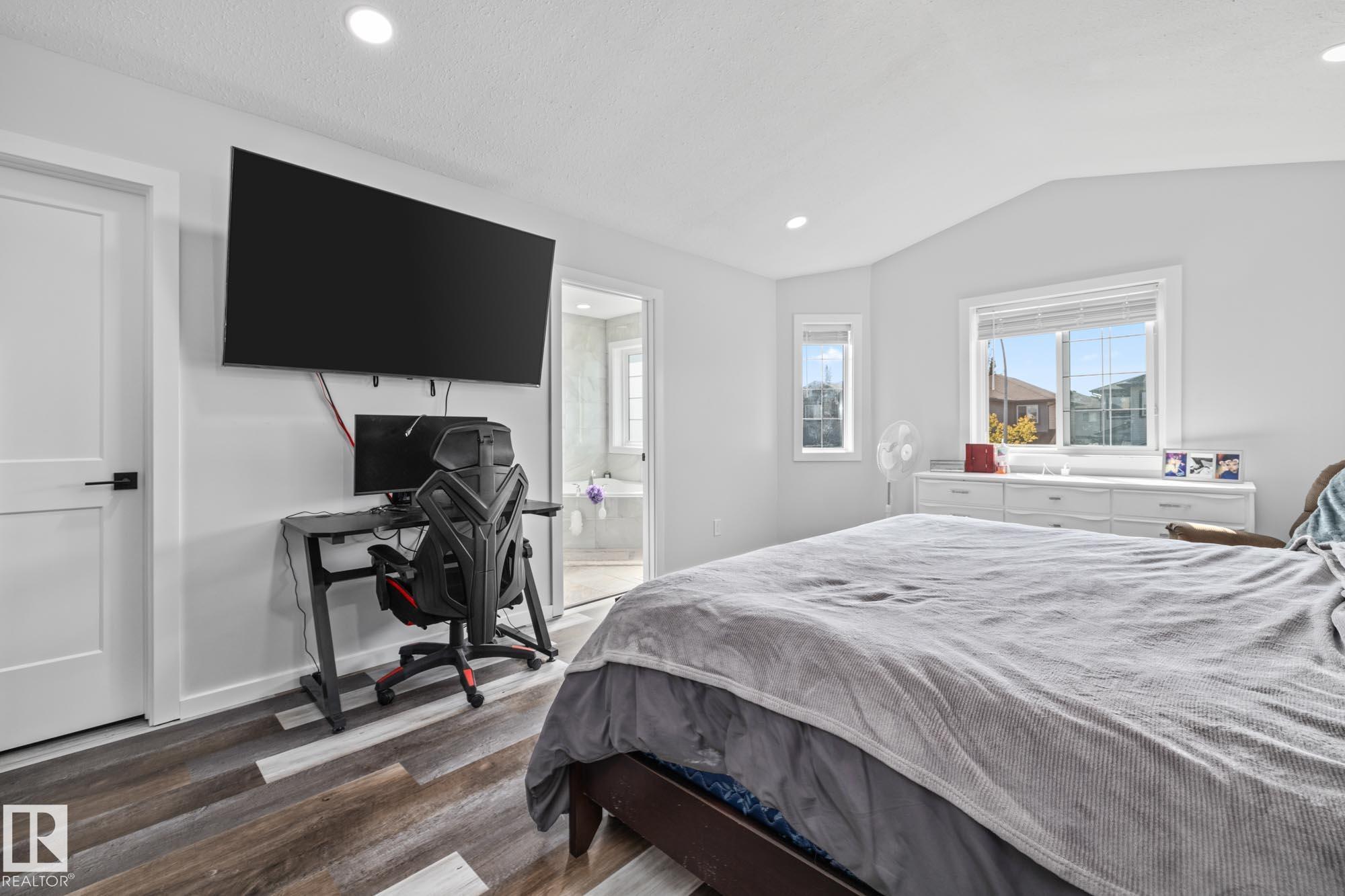 Welcome home to this 5 bedroom, 3 bathroom, Bi-Level located in the family-friendly community of South Glens in Morinville. This property features an attached double garage and a well-planned layout with space for everyone. The main floor greets you with vaulted ceilings and an open concept design, making the kitchen the heart of the home. The kitchen offers a corner pantry, center island with extra storage, stainless steel appliances, and a convenient eating bar, all open to the dining and living areas for easy family gatherings. Upstairs, the primary bedroom includes a walk-in closet and 4 piece ensuite. The fully finished basement adds two bedrooms, a large family room, and a third bathroom, providing even more living space. The backyard is private yet spacious, creating the perfect setting for family time.