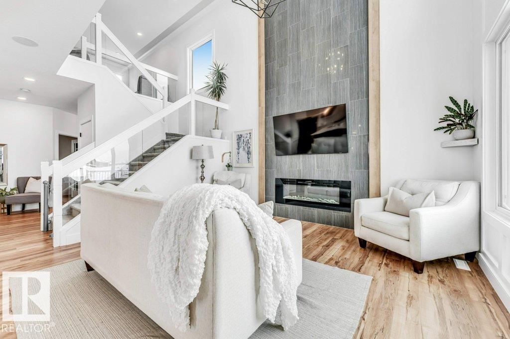 BACKING ONTO PRESCOTT SCHOOL YARD WITH NO REAR NEIGHBOURS! CORNER LOT & 2 MINS walk to LARGE POND, This beautifully upgraded home features 4 bedrooms, 2.5 bathrooms,a main floor DEN and a SIDE ENTRANCE offering exceptional space and functionality for modern family living. The main floor showcases an impressive OPEN TO ABOVE concept with a bright living area highlighted by a tiled fireplace and elegant glass railing, along with a convenient half bathroom.The extended kitchen is thoughtfully designed with quartz countertops, built-in appliances, under-cabinet lighting,and built in SPEAKERS creating a perfect space for both everyday living and entertainment.Upstairs, the spacious primary suite offers a walk-in closet and a luxurious 5-piece ensuite, complemented by three additional bedrooms, a bonus room, and a full bathroom and a laundry with SINK and lots of cabinets. 4 windows in the basement provides endless potential for future development.This home truly combines location,luxury,comfort and lifestyle!