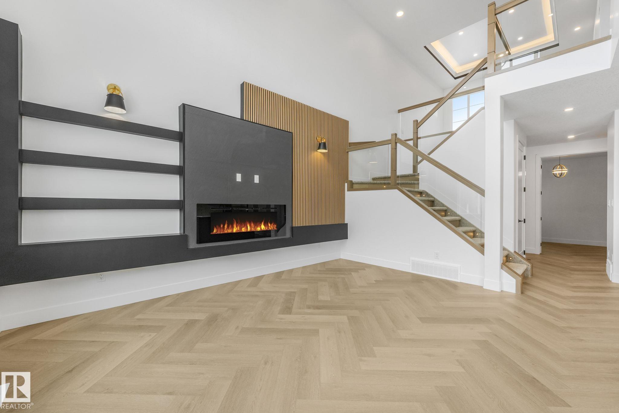 Welcome to this stunning 2,400 sq ft home in Cambrian—Sherwood Park’s fastest-growing community. Perfectly situated across from a ravine and park, with walking trails just steps away, this home offers an unbeatable lifestyle location. The bright open-to-below layout floods the space with natural light, while sleek glass railings enhance the modern design. A main floor office or den, full bath, and a convenient side entrance add flexibility and function. The fully upgraded kitchen features quartz countertops and cabinetry finished to the end wall for a seamless, high-end look. Upstairs, enjoy a spacious bonus room ideal for family living. The primary suite is a true retreat, complete with a luxurious 5-piece ensuite. Style, space, and setting all come together beautifully in this home.