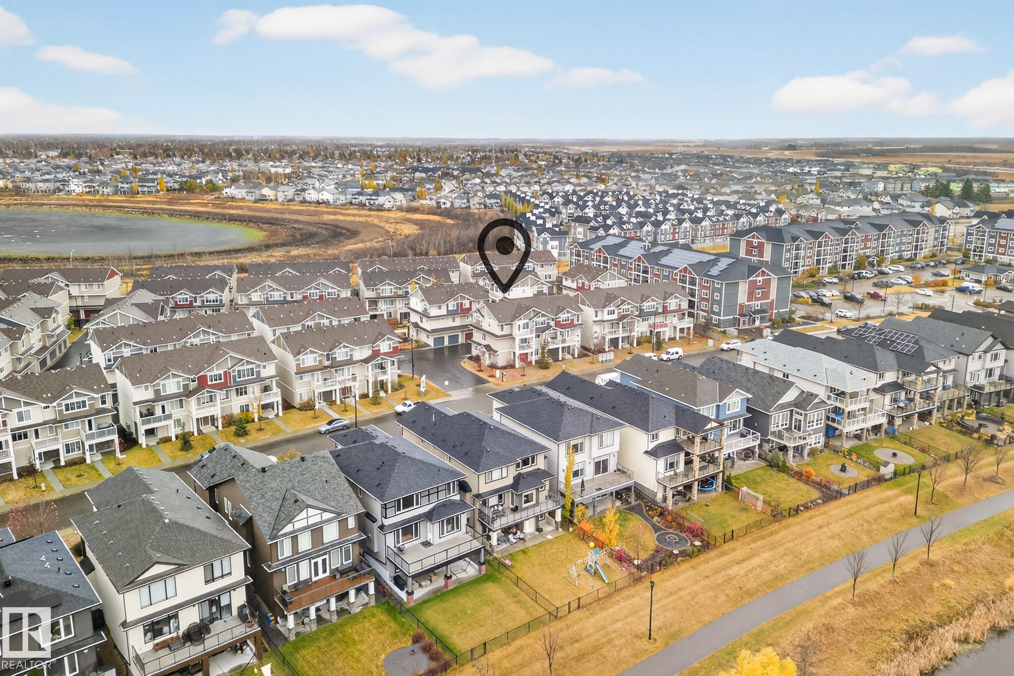 Corner END UNIT single-floor townhome with SINGLE ATTACHED GARAGE. Air conditioning. High-efficiency furnace. This innovative 883 sq ft layout offers one-level living with 2 bedrooms & 1 total bathroom (including tub and shower). The single attached garage is at ground level, with interior stairs leading to the bright top-floor living space. See video in listing. Perfect for buyers seeking affordability with the convenience, storage, and parking of a garage. Extra end-unit windows bring in abundant natural light. In-suite laundry has upgraded full-size washer and dryer (not apartment-sized). Ceiling-height cabinets, crown mouldings, island, upgraded stainless steel appliances. Walk-in closet. Full 4-pc bath. Private balcony has partial view of lake. 8 mins to CFB Edmonton. 2025 taxes $2,321.84; condo fee $155.40/mth. Flexible possession. Garage is insulated, drywalled, vapour barriered, with professional LED lighting. Tons of parking: Visitor parking behind garage + street parking at front door.