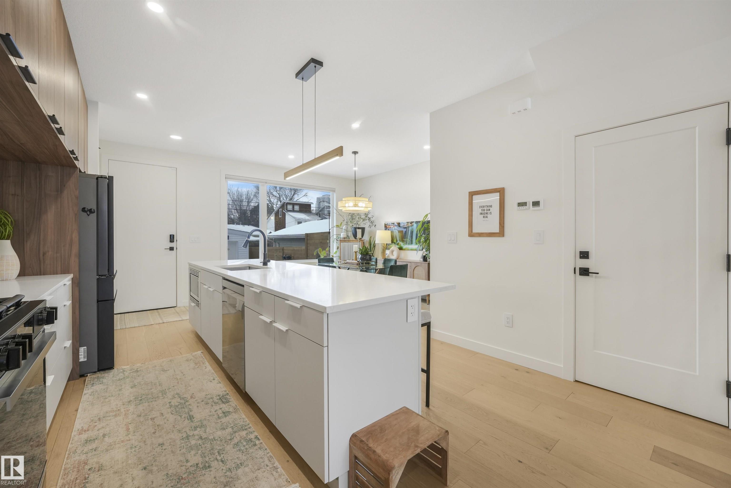 Better than new in desirable Idylwylde! This modern half duplex showcases thoughtfully selected natural finishes and a bright, open concept main floor designed for effortless living. The spacious living room features a large picture window that fills the home with natural light and flows seamlessly into the dining area and kitchen. The functional kitchen offers a pantry and large island, while the dining area overlooks the landscaped and fenced backyard. Upstairs boasts a generous primary bedroom with walk-in-closet and 4-pc ensuite, plus two additional bedrooms, a 5-pc main bath, and convenient upper floor laundry. The fully finished basement features a LEGAL SUITE complete with a full kitchen and separate in-suite laundry, ideal for rental income or extended family. Enjoy the convenience of a insulated garage and central A/C. unbeatable location just steps to parks, Idylwylde Community League, and Vimy Ridge Academy. Close to the LRT, Bonnie Doon Shopping Centre, and an easy commute to downtown.