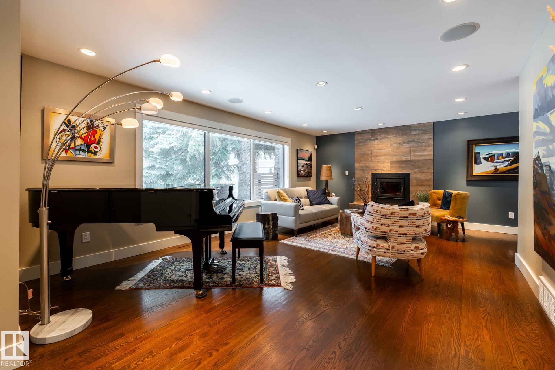 Set on a rare 12,000 sq ft southwest-facing pie lot in Parkview, this extensively renovated two-storey offers over 4,000 sq ft of developed living space just minutes from Edmonton’s River Valley and downtown. The home features 4 bedrooms, 3.5 bathrooms, and four fireplaces. The kitchen is anchored by a 12-ft granite island with double ovens and custom glass backsplash, overlooking the yard through a wall of windows. The lower level includes a sound-insulated media room with heated floors, theatre lighting, built-in speakers, and a gym/rec room. A spacious laundry room with sink and custom mudroom with built-in storage and sink add everyday function. Outside, SW yard with mature trees, irrigation, a concrete patio, and wood-burning fireplace create a private oasis. An oversized attached double garage plus heated 16’ x 39’ detached 4-car garage offers exceptional space for collectors, hobbies, or studio use. Hardie board siding, triple-pane windows, tankless hot water, EV charger, and more.