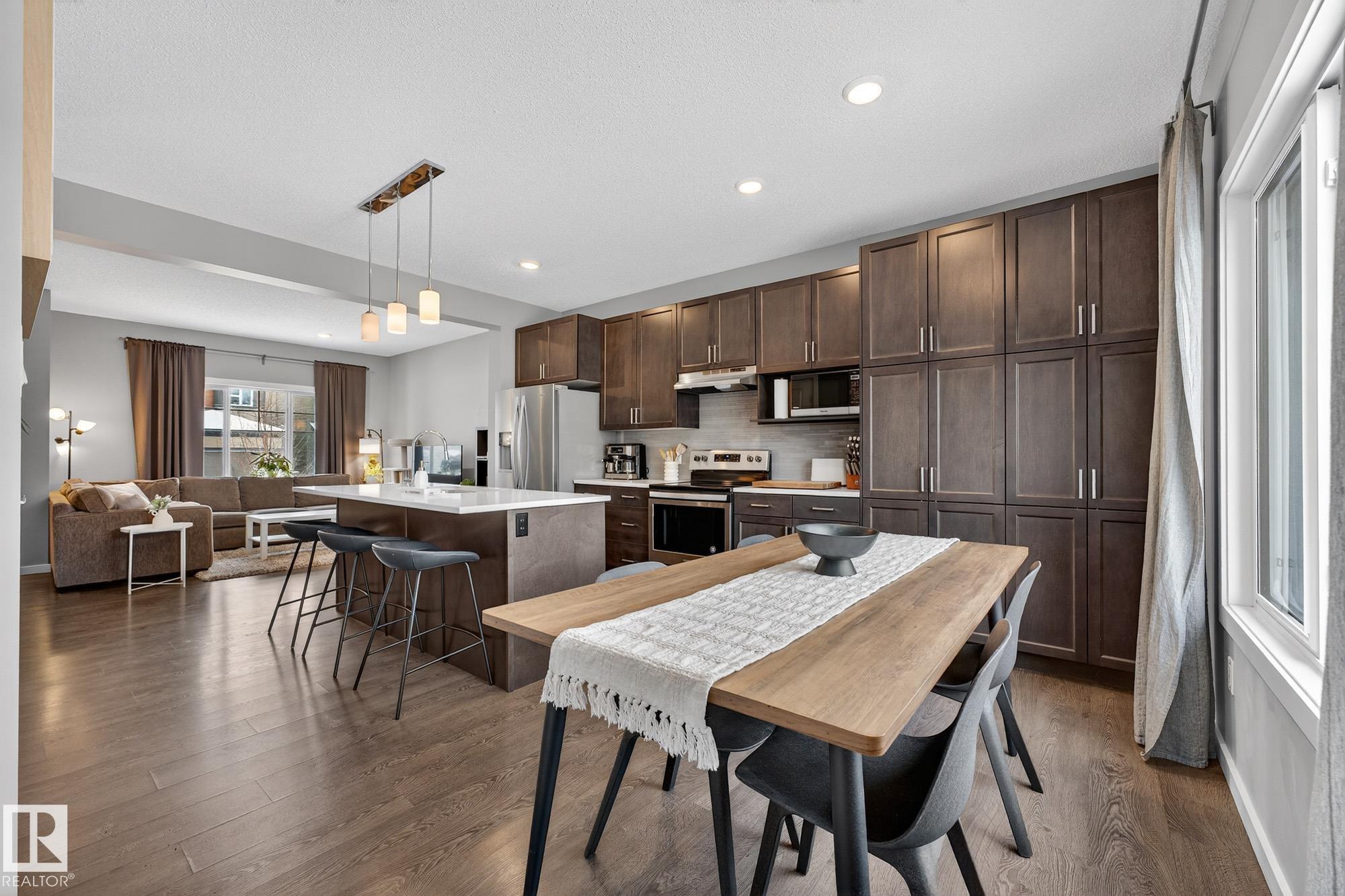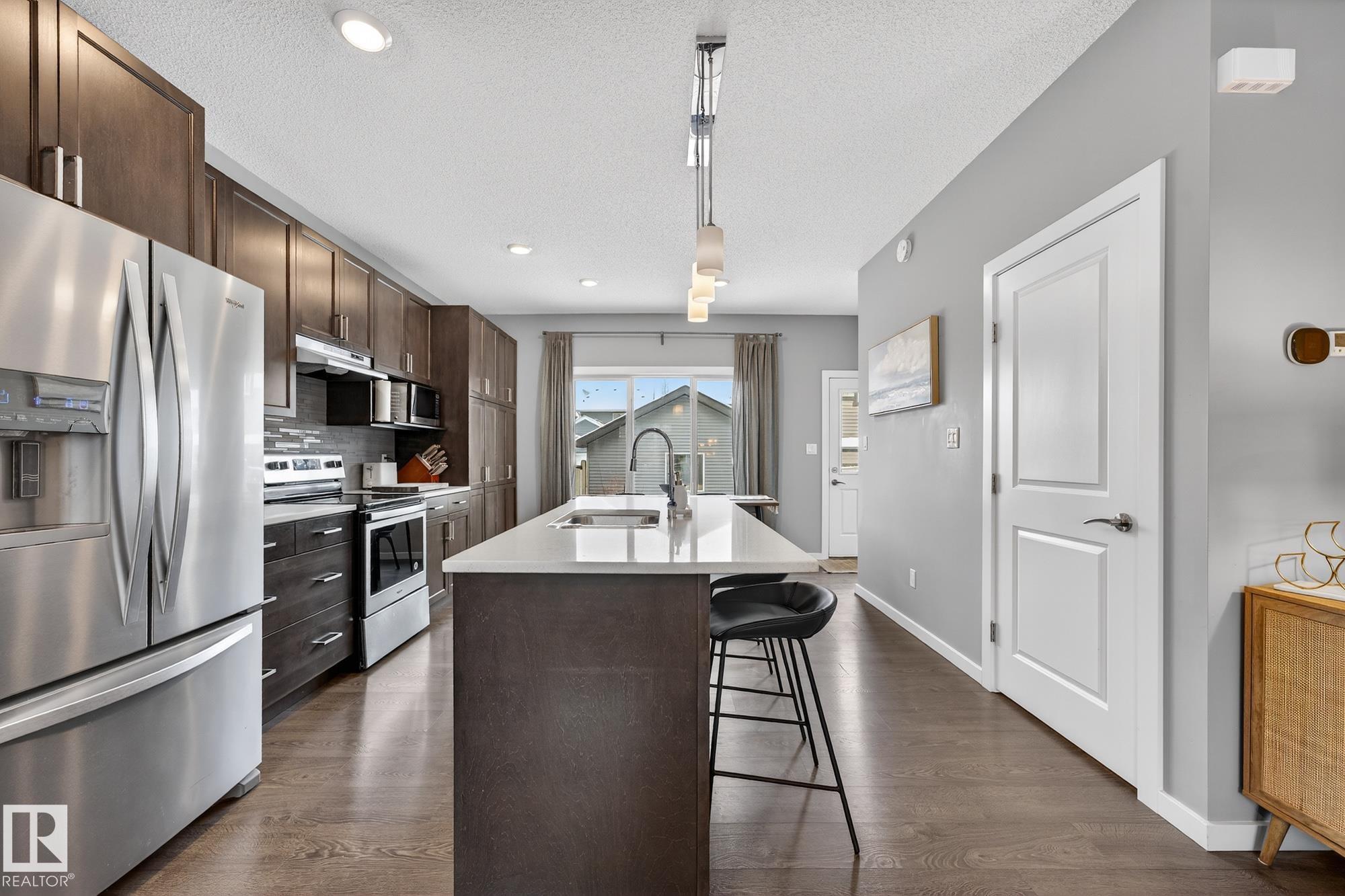 Gorgeous 3 bedroom, 3 bathroom home in family-friendly Rosenthal! This well-maintained 1,355 sq ft home features 9’ ceilings, large windows, and an open concept main floor with durable vinyl plank flooring. The upgraded kitchen offers quartz countertops, stainless steel appliances, extended cabinetry, and plenty of storage—perfect for everyday living and entertaining. Upstairs you’ll find convenient laundry, three spacious bedrooms, and a 4-piece main bath. The primary suite includes a large walk-in closet and private 4-piece ensuite. The partially finished basement features a rec room with vinyl plank flooring and room to grow. Enjoy the welcoming front porch and detached double garage, complete with a plug for an electric or hybrid vehicle. Fantastic location close to the Henday, Whitemud, Costco, River Cree, and many great amenities!