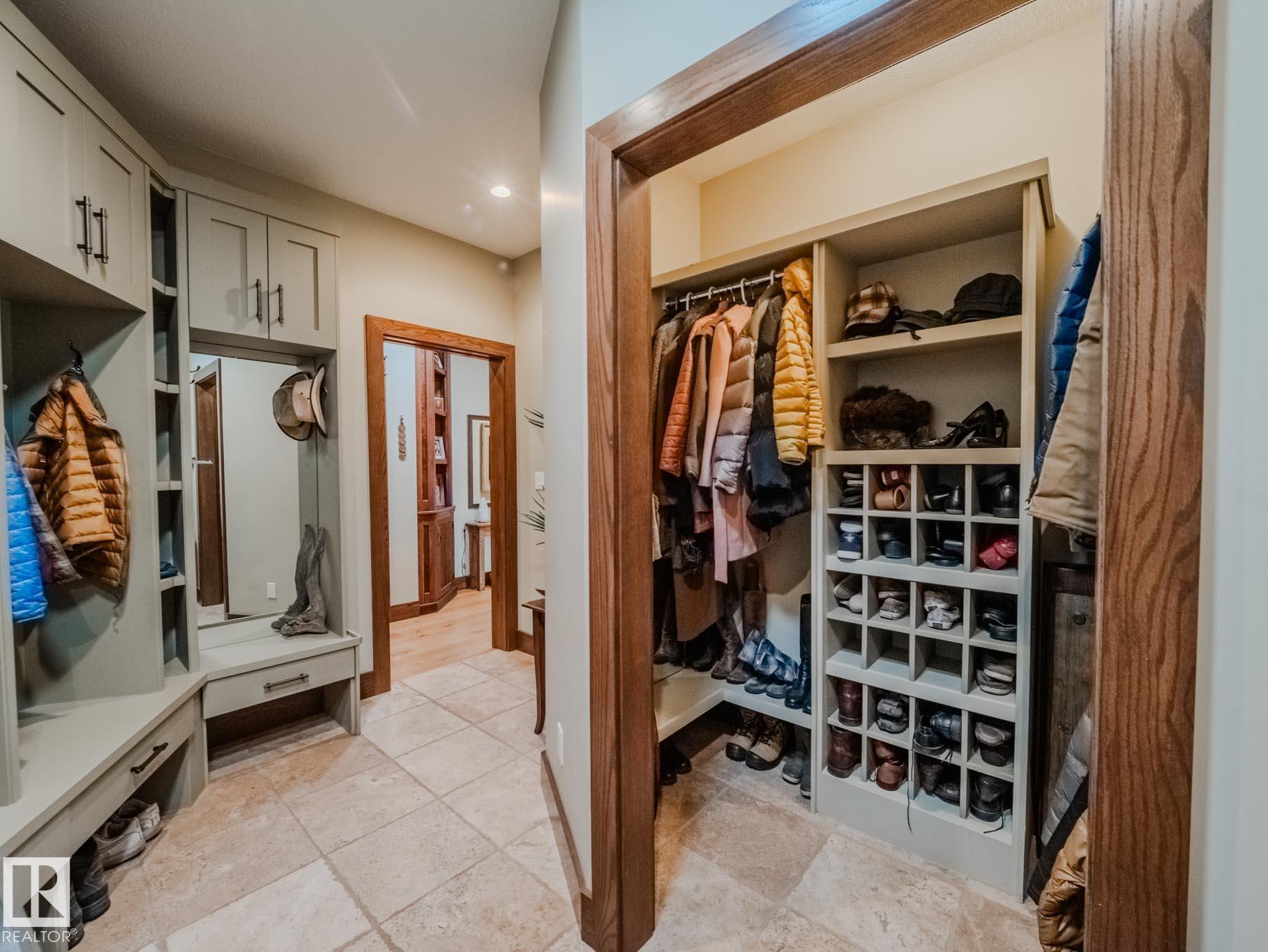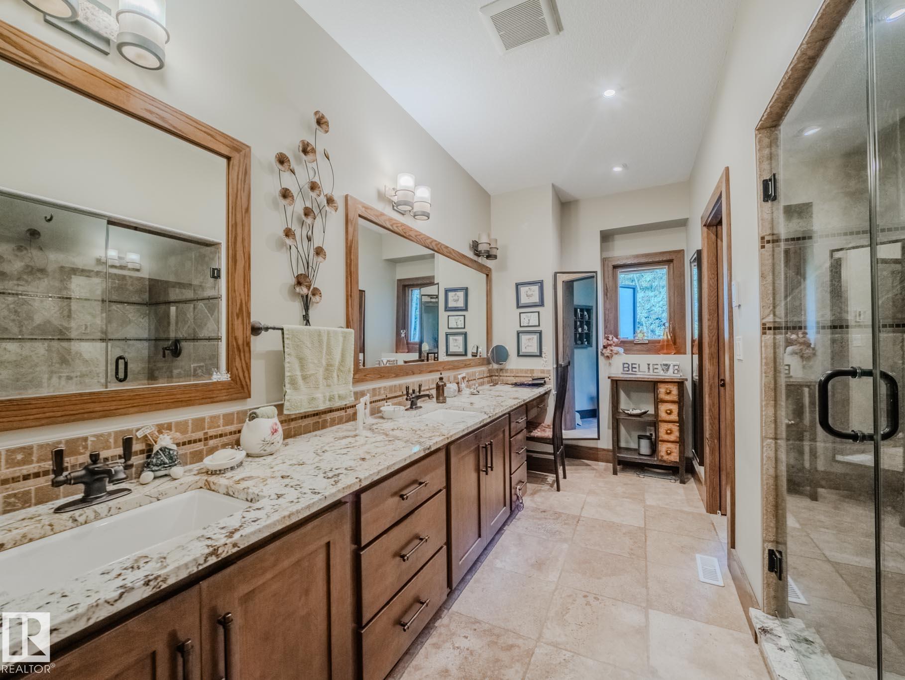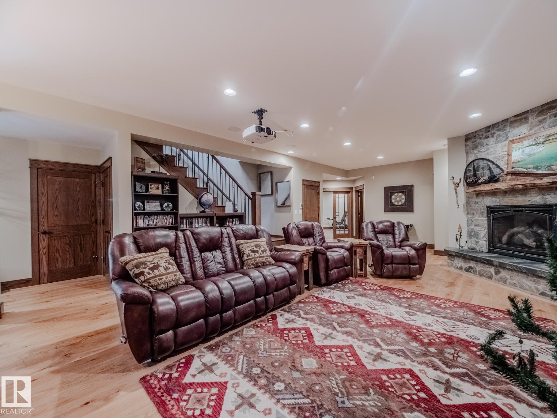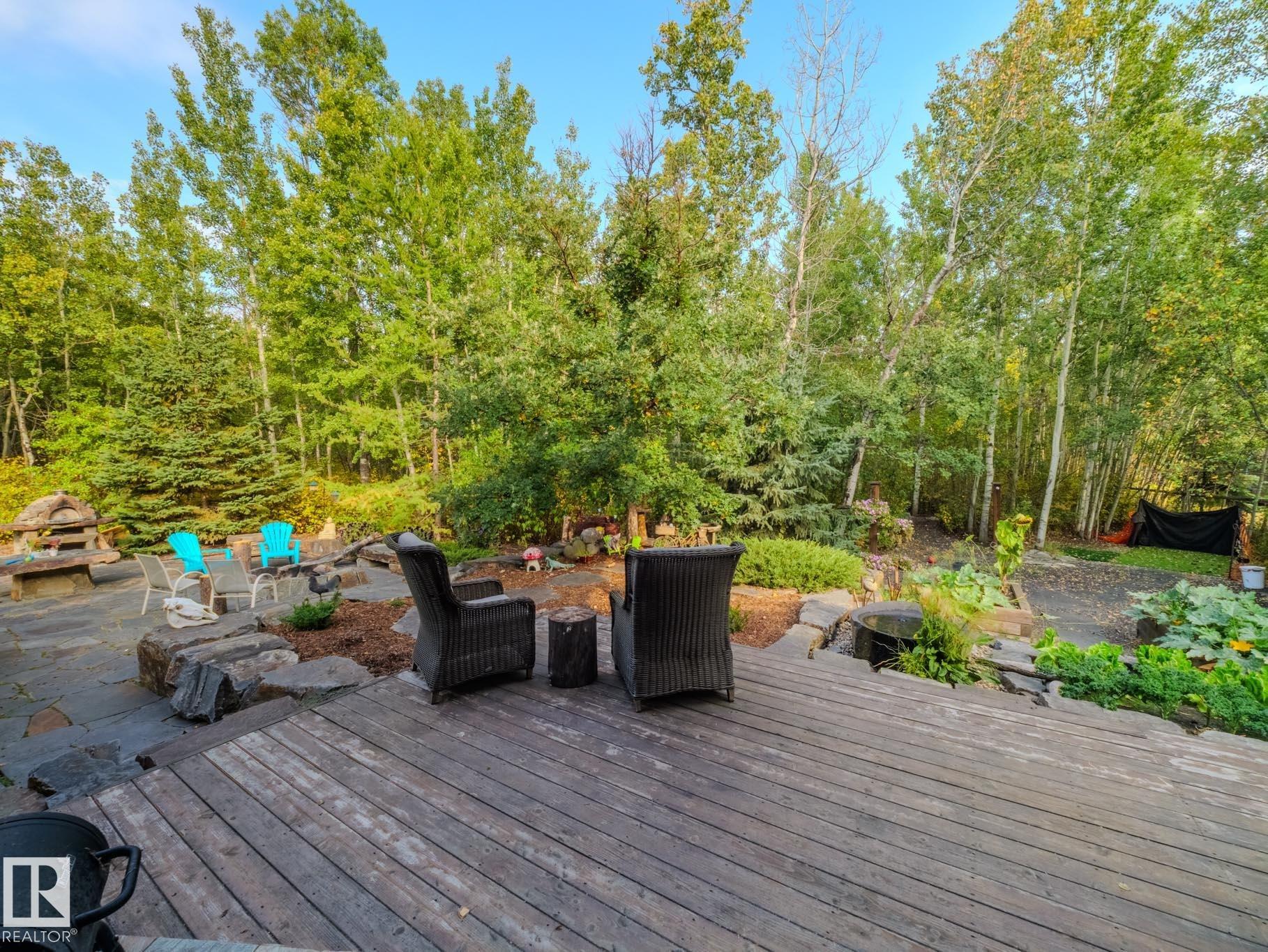WEST COAST INSPIRED MASTERPIECE…the yard and landscaping will absolutely blow your mind. Every corner of this 2-acre property was thoughtfully designed and selected. Just minutes to Sherwood Park with city water and sewer, this private slice of paradise is framed by mature trees and backs onto a 15-acre reserve. ~!WELCOME HOME!~ Step inside and you’re greeted by beautiful beams and warm wood accents, a spacious foyer, and an inviting great room. The chef-inspired kitchen offers extensive counter space and a true country-gourmet layout built for entertaining. Outside you’ll find an epic outdoor kitchen, BBQ area, and wood-burning fireplace. The primary suite is a retreat of its own, separated for privacy, with another bedroom and flex room/den on the main floor. The walkout basement features 2 additional bedrooms, gym, theatre area, bar, and an incredible office. Completing the property is a massive heated 4-car garage with custom mezzanine storage. The boulders, firepit, bird baths, ++ MORE