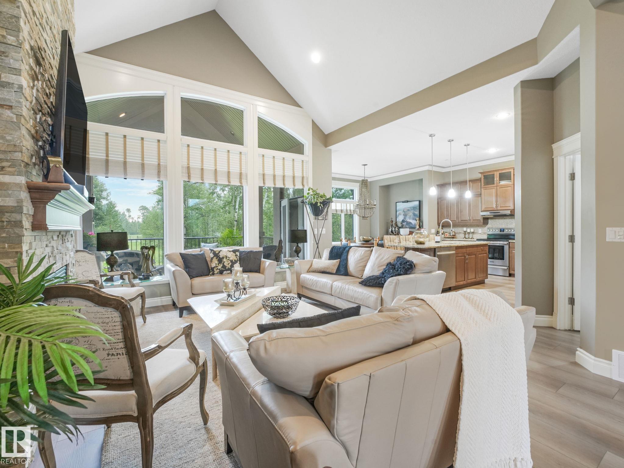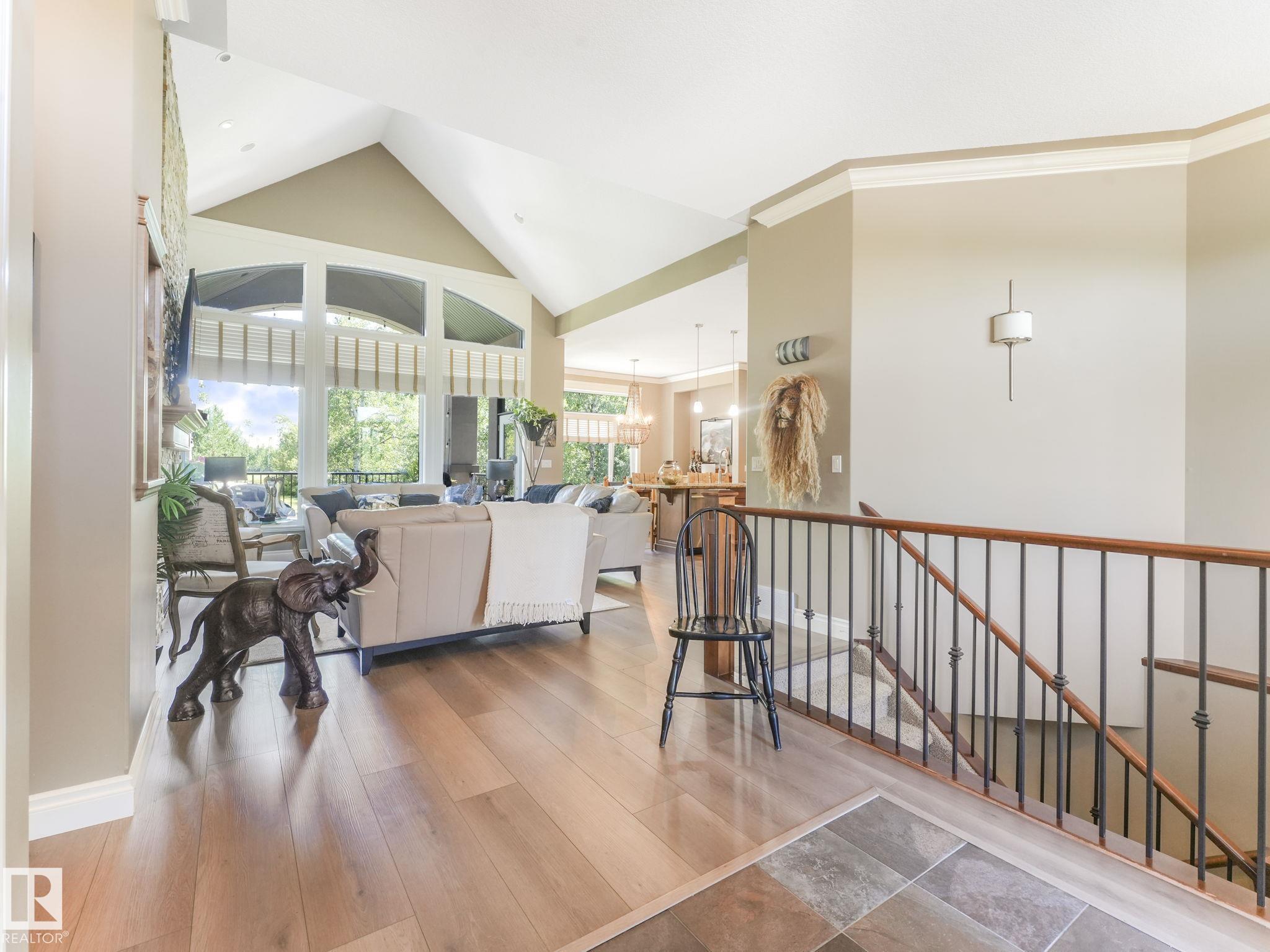LUXURY GATED COMMUNITY 45+ country living! 5 MIN TO SPRUCE GROVE, 15 MIN TO THE HENDAY HWY.This 1652 sq ft bungalow was the ORIGINAL SHOW HOME , tons of upgrades! Over 3000 square ft of useable space. STUNNING VAULT CIELINGS. MASSIVE backyard for your exclusive use! Treed private, BACKS ONTO A HUGE POND WITH WALKING PATHS EXCLUSIVE USE TO THE COMPLEX. Private storage for your RV, boat, or trailer. Expect to find beautiful cabinets, lots of granite counter tops, & featured ledgestone fireplace. NEW:VINYL PLANK FLOORING, NEW FURNACE, NEW WATER PUMP. Main floor has 2 bedrooms, the master HAS GEORGOUS VIEW & has an ensuite built for pampering. The O/S dining area walks out onto a massive covered deck! TRIPPLE GARAGE. Downstairs is professionally finished. 2 additional bedrooms, massive family room, 3 piece bath & storage. IMAGINE NO MORE SHOVELING, front lawn is looked after too. The garage is 3 car, heated. This very unique complex is so special in so many ways. A Must see to really appreciate!!!