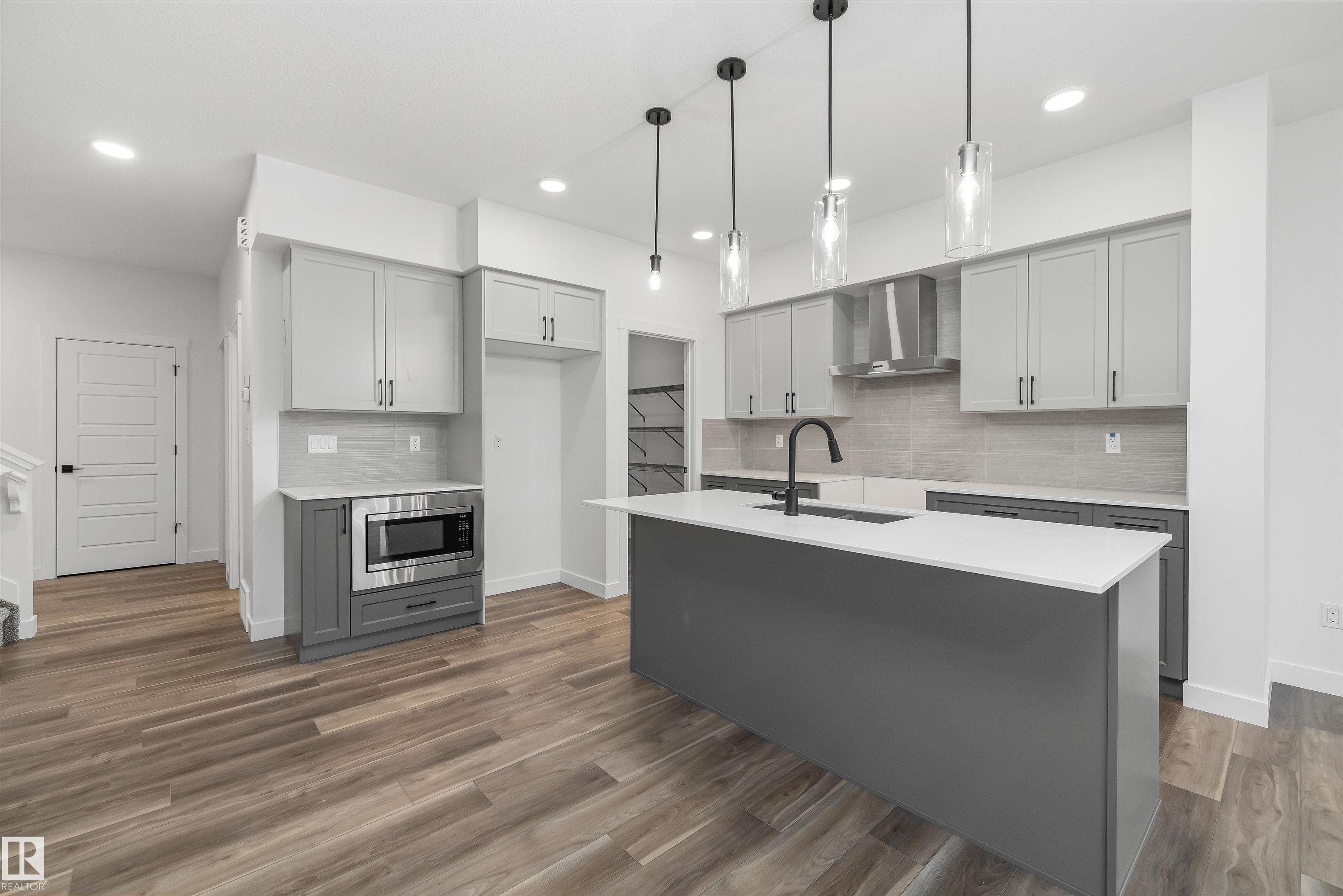 Built by Sterling Homes, this beautifully finished front-attached home in College Woods at Lakeview offers bright, refined living surrounded by trees, trails, and peaceful green space. Triple pane windows and 9’ ceilings create an airy main floor where a welcoming foyer leads past a half bath into a stylish kitchen featuring quartz countertops, a large island with seating, ceiling-height cabinetry, chimney hood fan, built-in microwave, and full-height tile backsplash. A walk-through pantry connects to the mudroom and garage for everyday ease. The great room centers on an electric fireplace, while patio doors open the dining nook to the backyard. Upstairs, the spacious primary suite includes a walk-in closet and a 4-piece ensuite with double sinks and glass shower. A bonus room, two additional bedrooms, full bath, and laundry with sink complete the layout. Luxury vinyl plank flooring, side entrance, upgraded railings, double attached garage with drain, and basement rough-ins add lasting value.