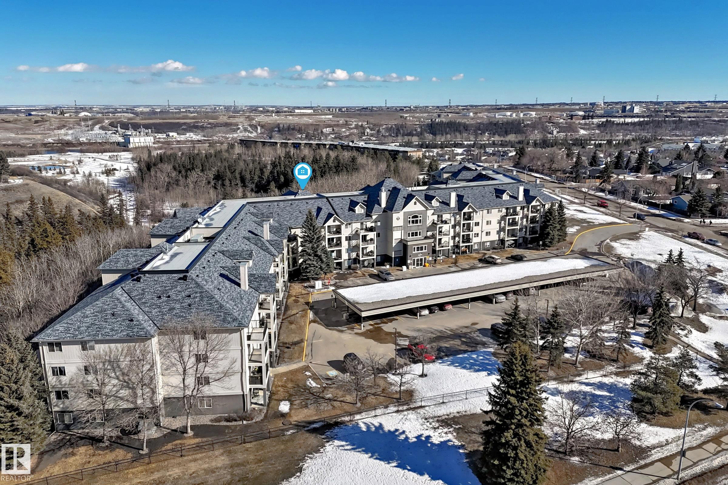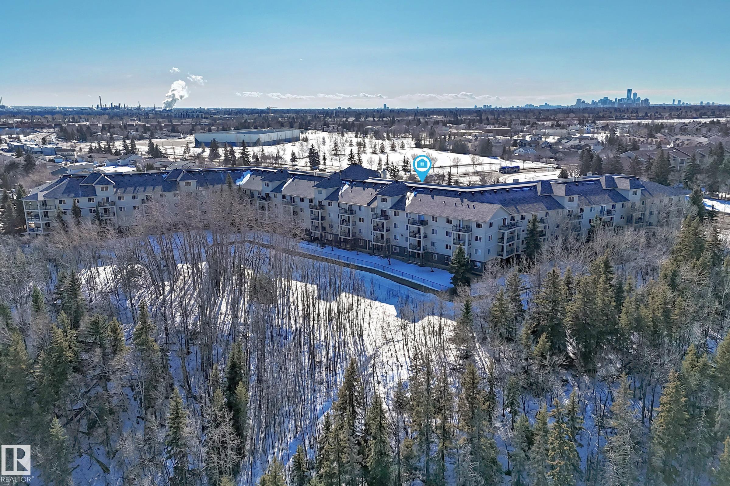 Lovely, clean and spacious 2 bedroom, 2 full bath condo overlooks the ravine for peach and serenity. This unit has a lot to offer and is situated in a very well managed aged restricted (18+) omplex featuring central air conditioning, in-suite laundry, spacious primary suite with walk through closet, heated underground parking and storage cage. Small pets are allowed with board approval. Close to Yellowhead Trail and the Anthony Henday, walking trails, golf course, shopping and public transportation. Comes with 6 appliances and quick possession is possible.
