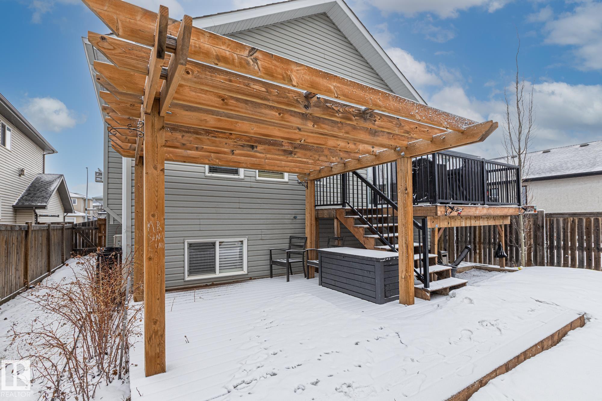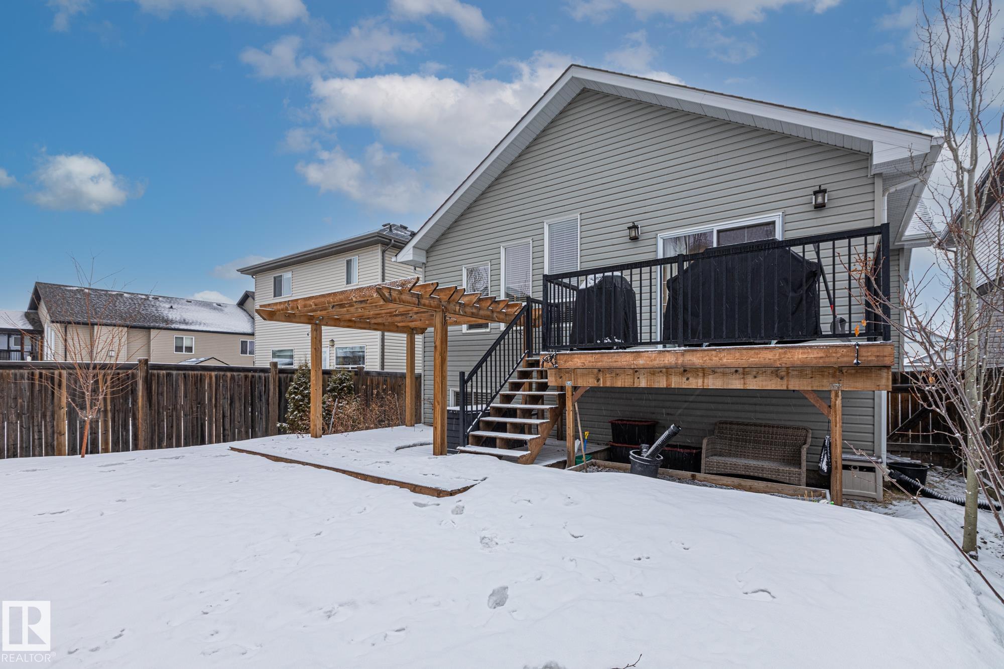 Welcome to this gorgeous custom-built bi-level offering style, space, and comfort for the whole family. This beautiful 3-bedroom home features a ceramic tile front entrance, dark maple hardwood flooring throughout the kitchen, dining area, and family room, plus vaulted ceilings that create a bright and open feel. The kitchen is designed for entertaining with dark maple cabinetry, stainless steel appliances, a large island with breakfast bar, and plenty of prep and gathering space. The main floor includes two spacious bedrooms, while the private upper-level primary suite offers a walk-in closet and a lovely ensuite with a relaxing jacuzzi tub. The fully finished basement features 9-ft ceilings, large windows, a spacious rec room, an additional bedroom, and a 3-piece bathroom. Step outside to the sunny south-facing yard with a two-tiered deck. Recent upgrades include a new furnace and central A/C. The oversized heated, insulated double garage is drywalled. Move-in ready!