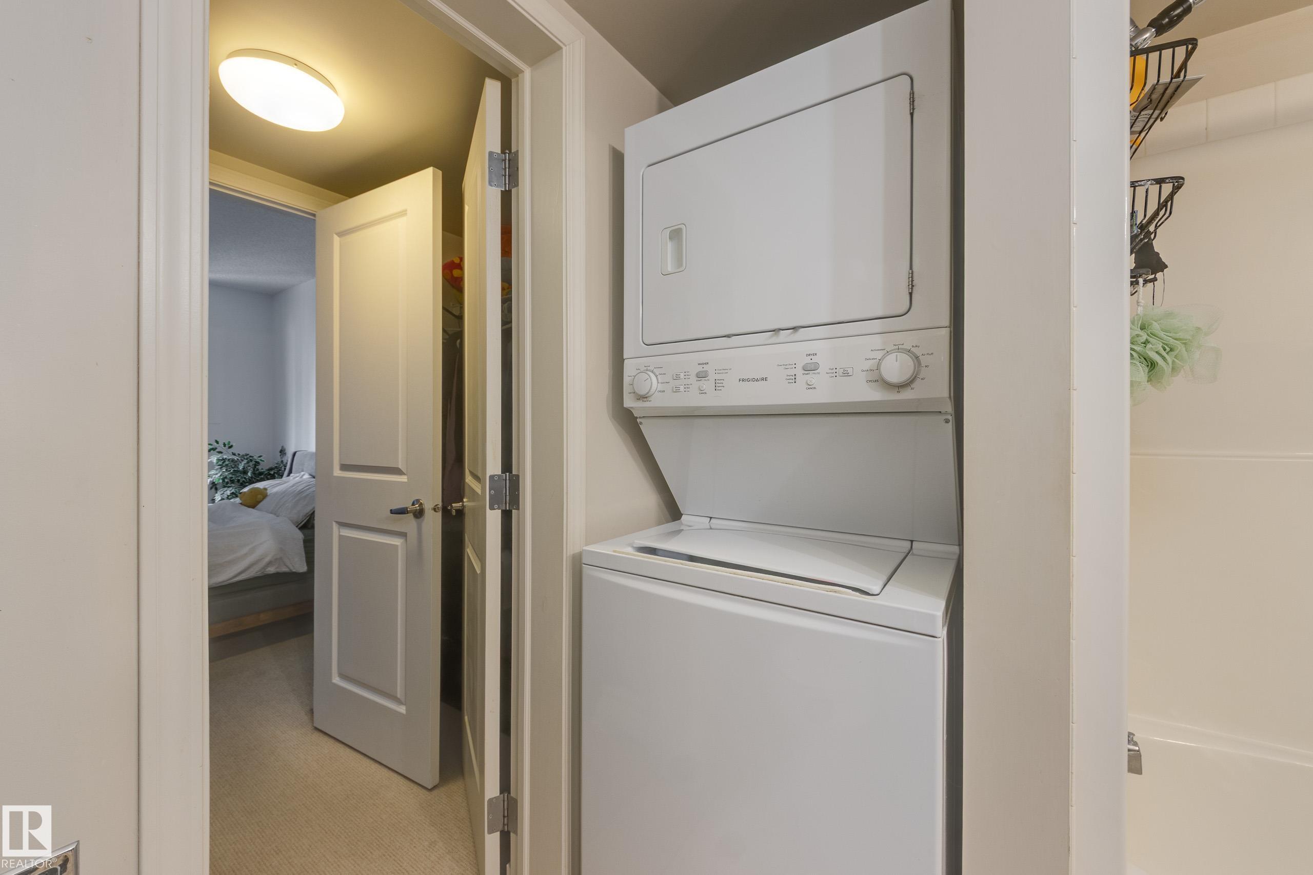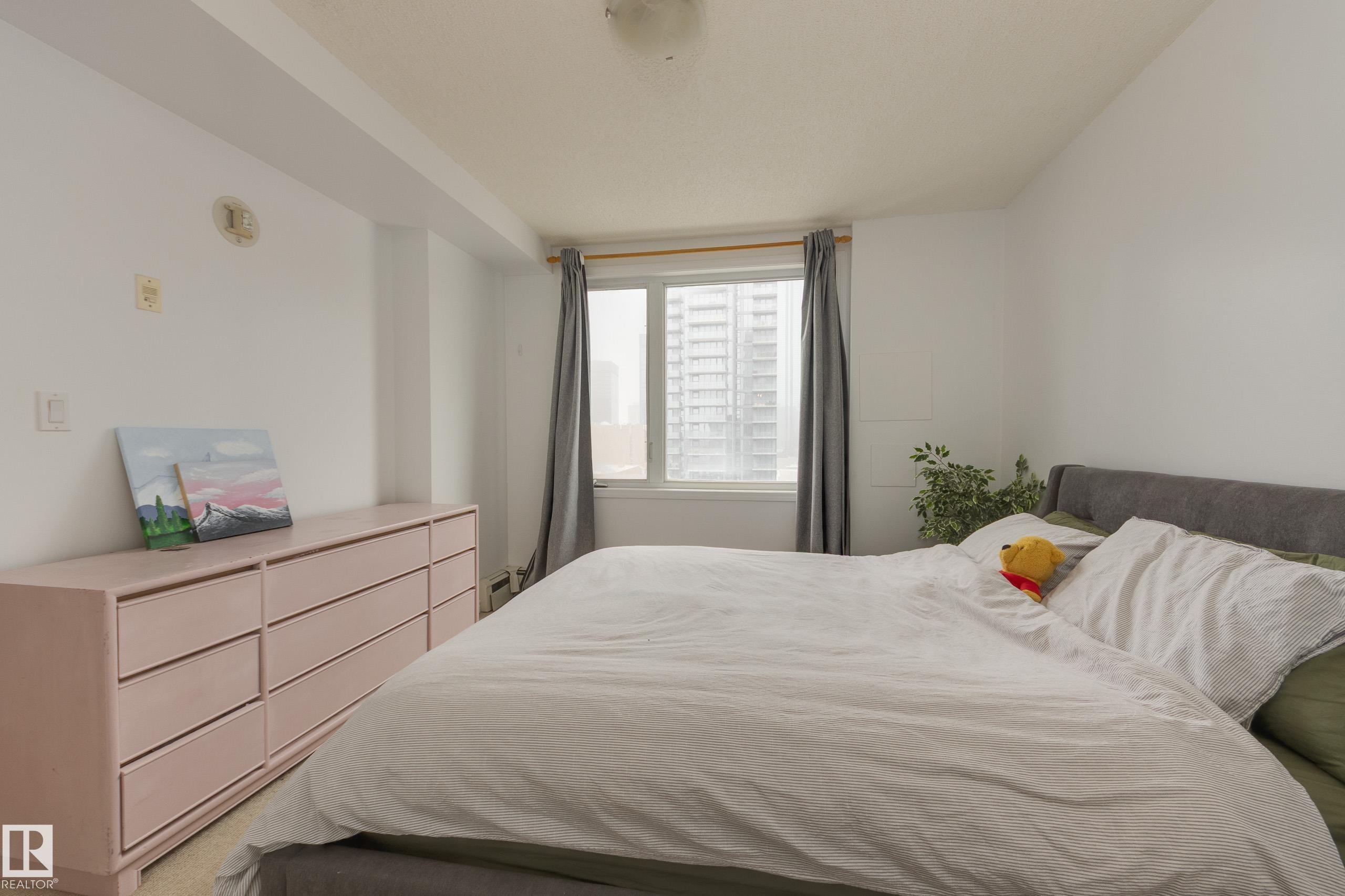 Bright and well-maintained NE corner 2-bedroom air-conditioned condo in the heart of downtown Edmonton with impressive city views. The open concept offers a functional layout with large NE-facing windows to bring in natural light throughout the day. Hardwood flooring runs through the main living areas, with carpet in both bedrooms for comfort. There is also a large storage unit and heated parking. The kitchen and living space flow into the private balcony, creating an ideal setting to enjoy downtown views. The spacious primary bedroom features convenient access to the semi-ensuite bathroom, which is also accessible from the main living room. In-suite laundry adds everyday practicality. Located steps from Rogers Place, Churchill Square, Edmonton City Centre, Winspear Centre, and the LRT, this home offers exceptional walkability to downtown amenities, restaurants, entertainment, and Edmonton's river valley. A great opportunity for first-time buyers, professionals or investors seeking urban living.
