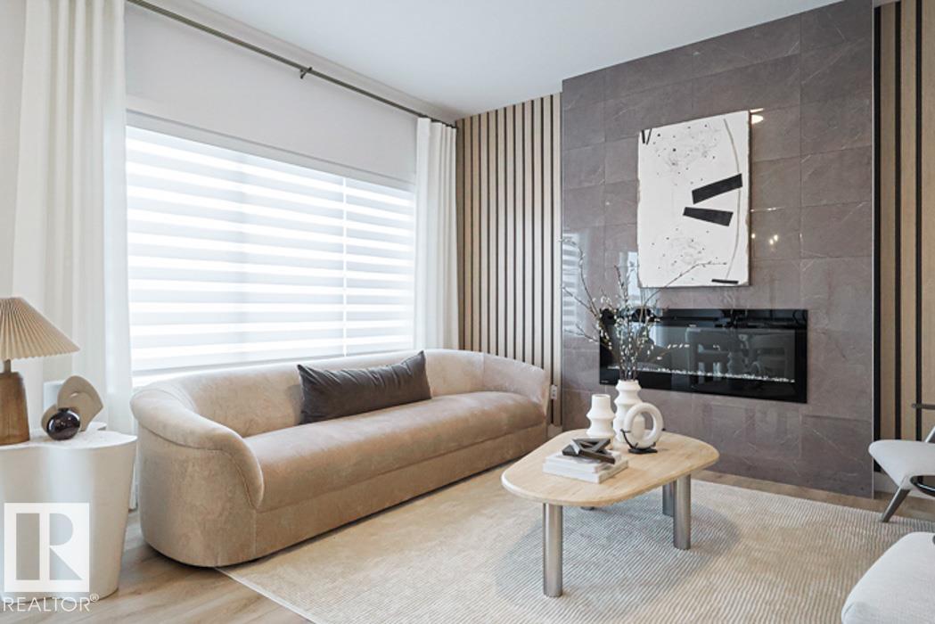 Built by Sterling Homes, this thoughtfully designed four-bedroom home offers a flexible layout for modern family living. The open main floor features 9-ft ceilings on the main level and basement, luxury vinyl plank flooring, and a separate side entrance for added versatility. A welcoming foyer includes a full bathroom with a stand-up shower and a main-floor bedroom—ideal for guests or a home office. The bright living room features an electric fireplace and large rear windows, flowing into a stylish kitchen with quartz countertops, a spacious island, a full-height backsplash, a built-in microwave, soft-close cabinetry, and a pantry. Patio doors lead to the backyard. Upstairs, the primary retreat offers a 5-pc ensuite with double sinks, tub, and glass walk-in shower, with the walk-in closet through the ensuite. A central bonus room, upper laundry, two additional bedrooms, and full bath complete the level. Includes upgraded railings, basement rough-ins, and double attached garage with floor drain.