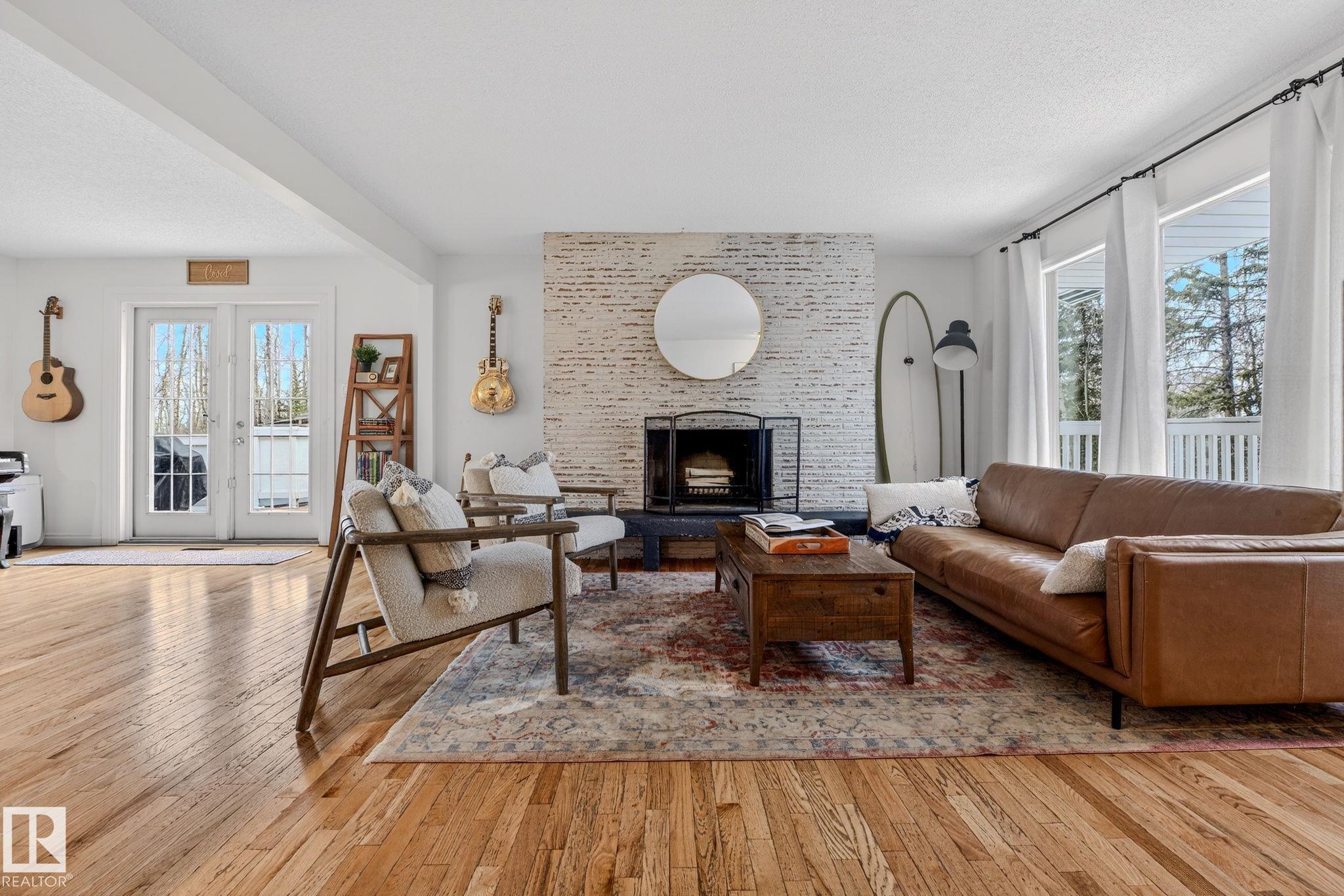 Escape the city to this beautiful 3 acre property, located just minutes from Sherwood Park. This beautiful walkout bungalow offers serene country living with quick access to the city and major highways. Inside, the home features a warm and inviting kitchen with classic oak cabinetry, stainless steel appliances, and a bright dining area highlighted by floor to ceiling windows. The main floor includes a spacious primary bedroom with an ensuite and direct access to a private patio- your quiet retreat. Two additional bedrooms and well appointed 3 piece bathroom complete the main level. The wrap-around deck is complete with natural gas hookup--perfect for outdoor entertaining. The fully finished walkout basement provides even more living space, featuring a cozy brick faced wood burning fireplace, an additional bedroom, bathroom and laundry room. Step out to your oversized heated double garage equipped with 220 volt power. Don't miss this rare opportunity as this property is PRICED TO SELL