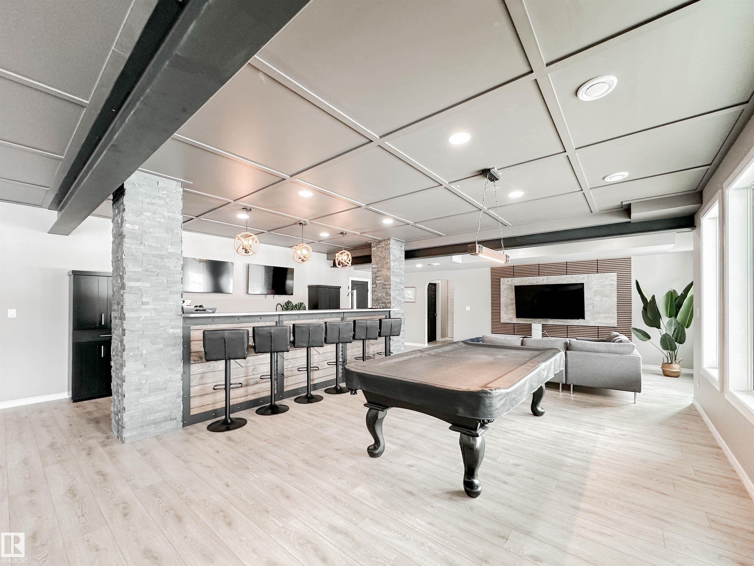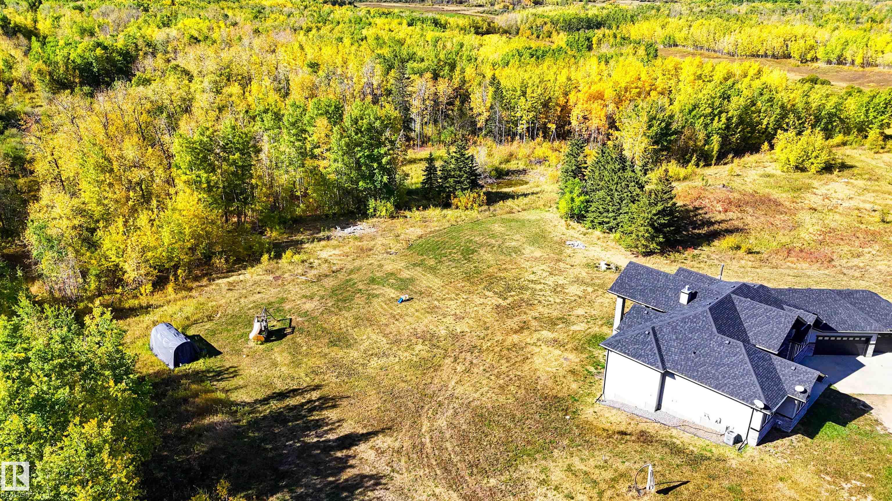 Stunning walkout bungalow fronting onto Elk Island Park, set on 40 acres agricultural zoned. This 4 bed, 3.5-bath home features an open-concept design w/soaring vaulted ceilings & floor to ceiling windows that flood the space w/natural light. Impressive stonework & modern finishes enhance the bright, spacious entry leading to a large living room, chef’s kitchen, & dining nook. The kitchen offers quartz countertops, dual ovens, full-height cabinetry, a gas cooktop, oversized island,& walk-through pantry to the mudroom & triple attached garage. The living room showcases a coffered vaulted ceiling & striking stone fireplace, perfect for entertaining. The primary retreat includes a luxurious 5-piece ensuite. Two add’l bedrooms, plus 4-piece & 2-piece baths, complete the main floor. Enjoy a private, west-facing, treed yard w/covered upper deck & walkout lower patio. The basement features a curved iron staircase, large bar, rec space w/wood stove, 4th bedroom, 4-piece bath, & future theatre room (pre-wired).