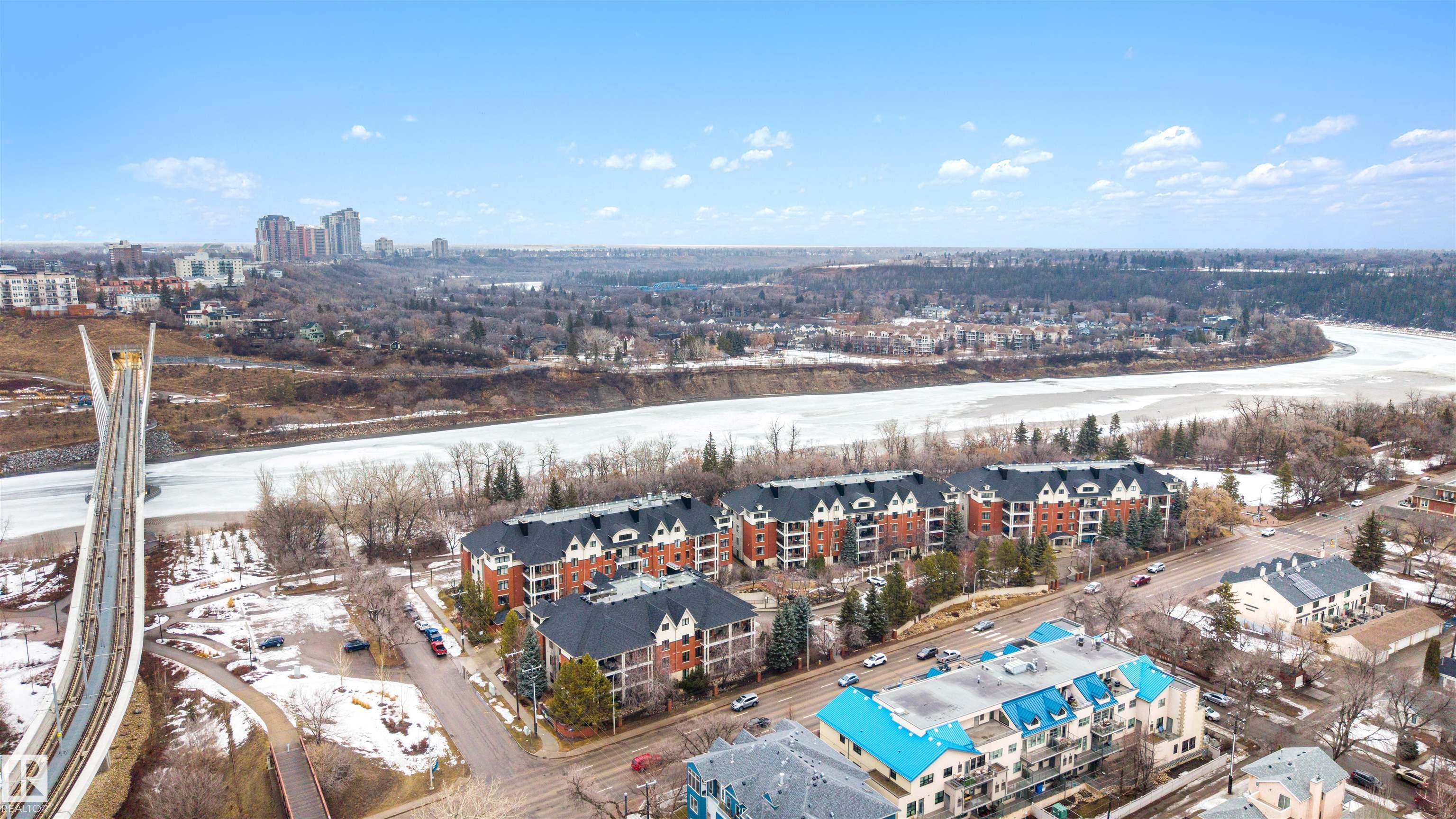 Located in a well-kept condo community beside Edmonton’s river valley, this top-floor home at The Landing offers a rare blend of comfort and immediate access to nature, with scenic trails functioning as your extended backyard. The suite provides over 1,100 square feet of single-level space with an open layout and warm Kempas hardwood flooring in the main living area. The kitchen includes cherrywood cabinets, granite countertops, stainless steel appliances, and a walk-in pantry, while a gas fireplace, upgraded lighting, and air conditioning enhance everyday living. The spacious primary bedroom features 20-foot vaulted ceilings, a walk-in closet, and an ensuite with a custom walk-in shower. A large deck with a gas hookup, underground parking, and access to the building’s fitness room add convenience, and with public transportation close by, this home offers both natural beauty and urban accessibility.