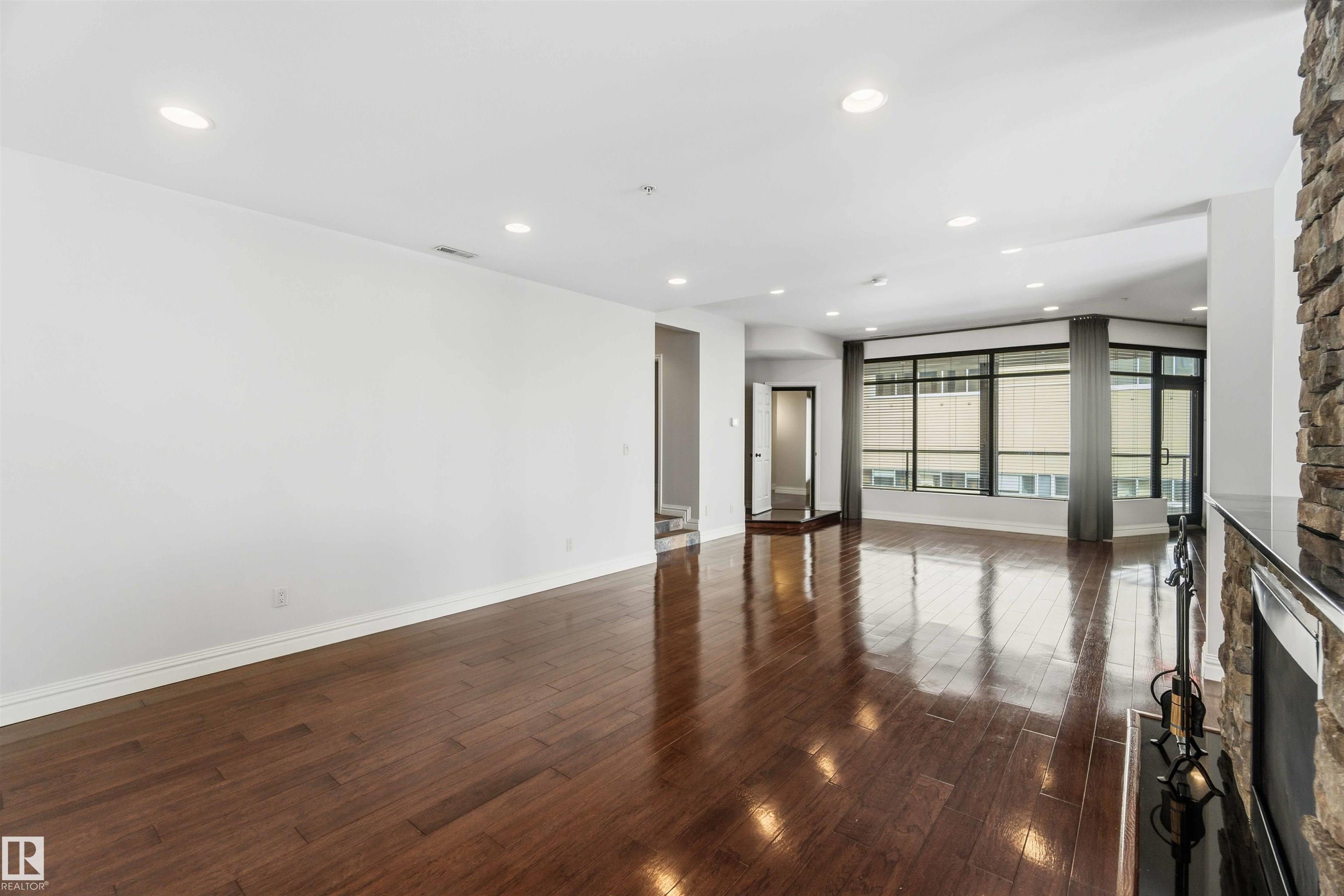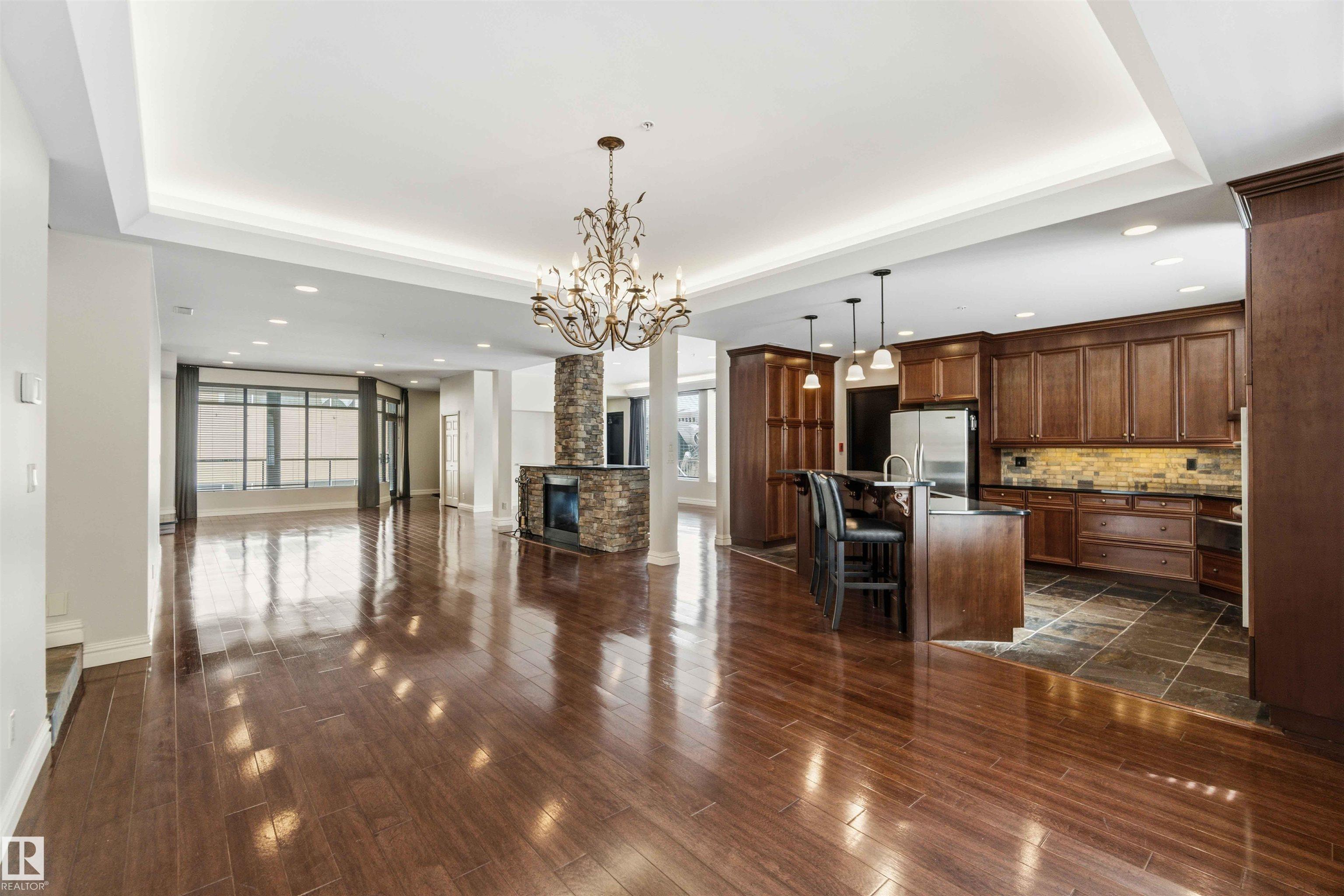Gorgeous, impeccably maintained penthouse in the prestigious Churchill Exchange, offering 2,389 sq. ft. of refined living space with exceptional privacy and two private balconies. This elegant residence features an open-concept design with rich hardwood flooring and a spacious living room anchored by a striking two-sided gas fireplace.The adjoining family and dining area is perfect for everyday living and entertaining, with patio doors leading to a large, secluded terrace. The kitchen is thoughtfully appointed with abundant cabinetry, granite countertops, and a raised breakfast bar.The primary suite offers a walk-in closet & a bright 3-piece ensuite with skylight. Two additional bedrooms provide flexibility, with the third ideal as a den and offering access to the main 4-piece bath. Ample in-suite storage adds convenience. Complete with two titled underground parking stalls, additional storage & direct elevator access, this exceptional residence is ideally located near shopping, dining, and entertainment.