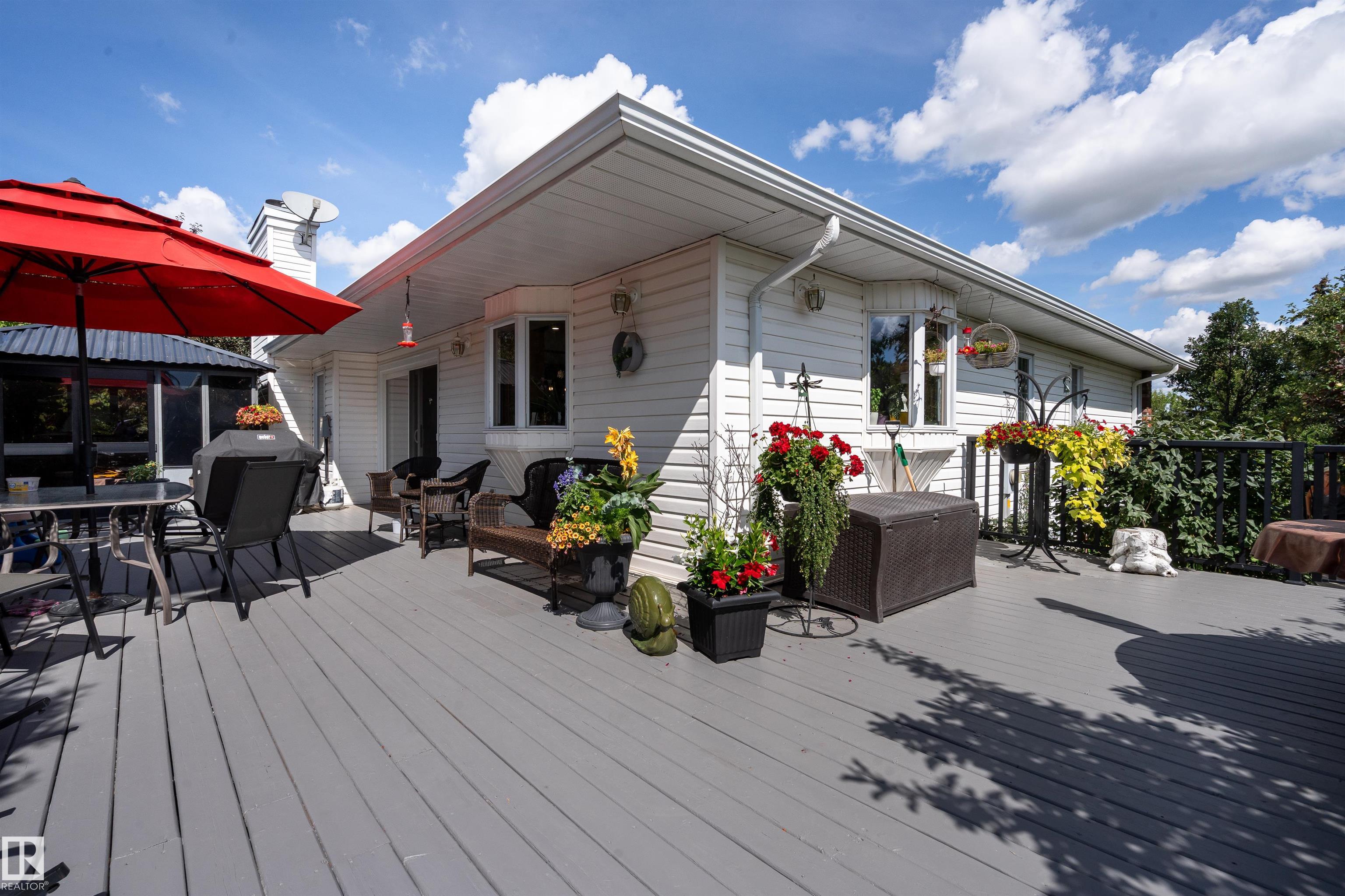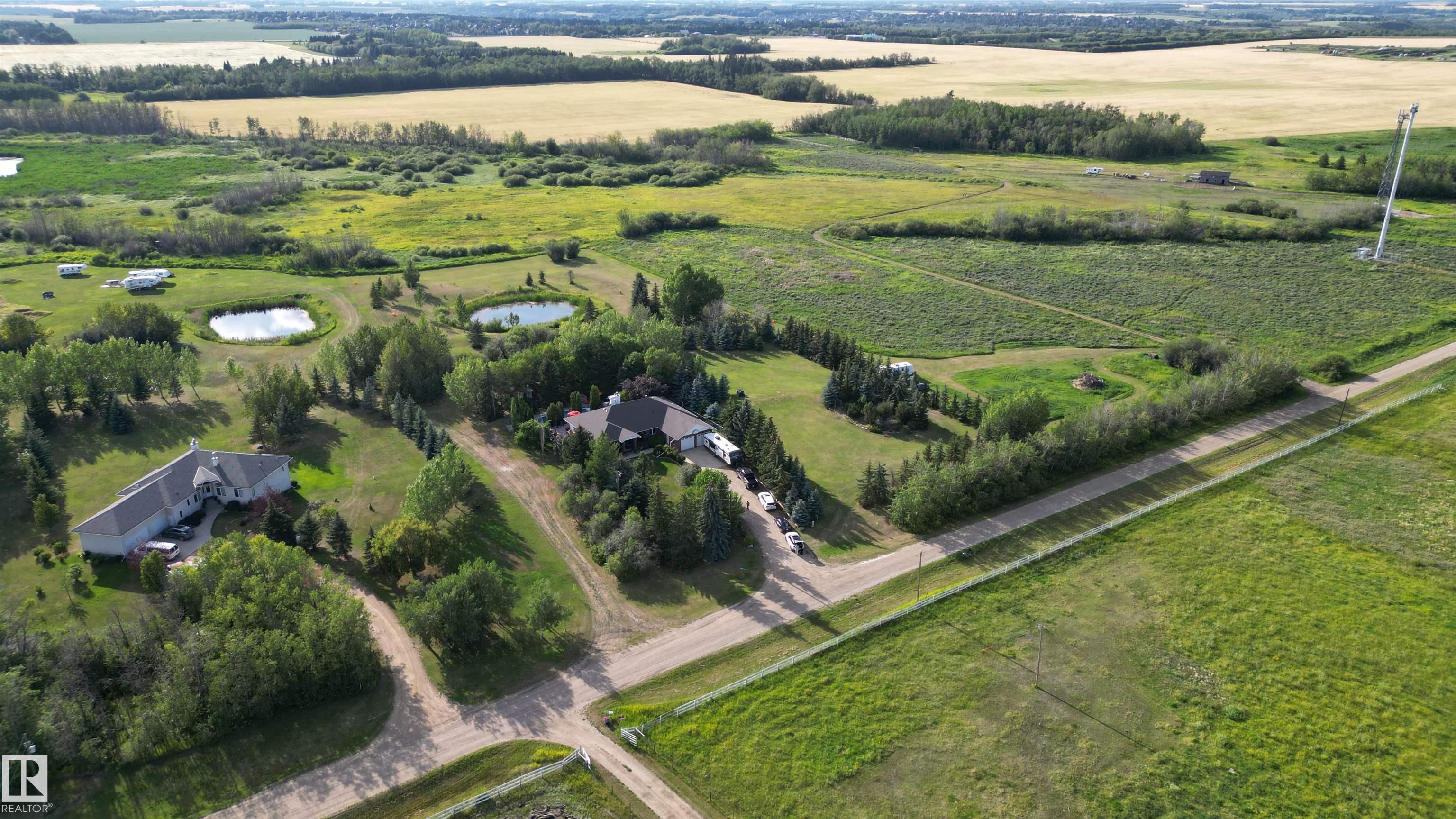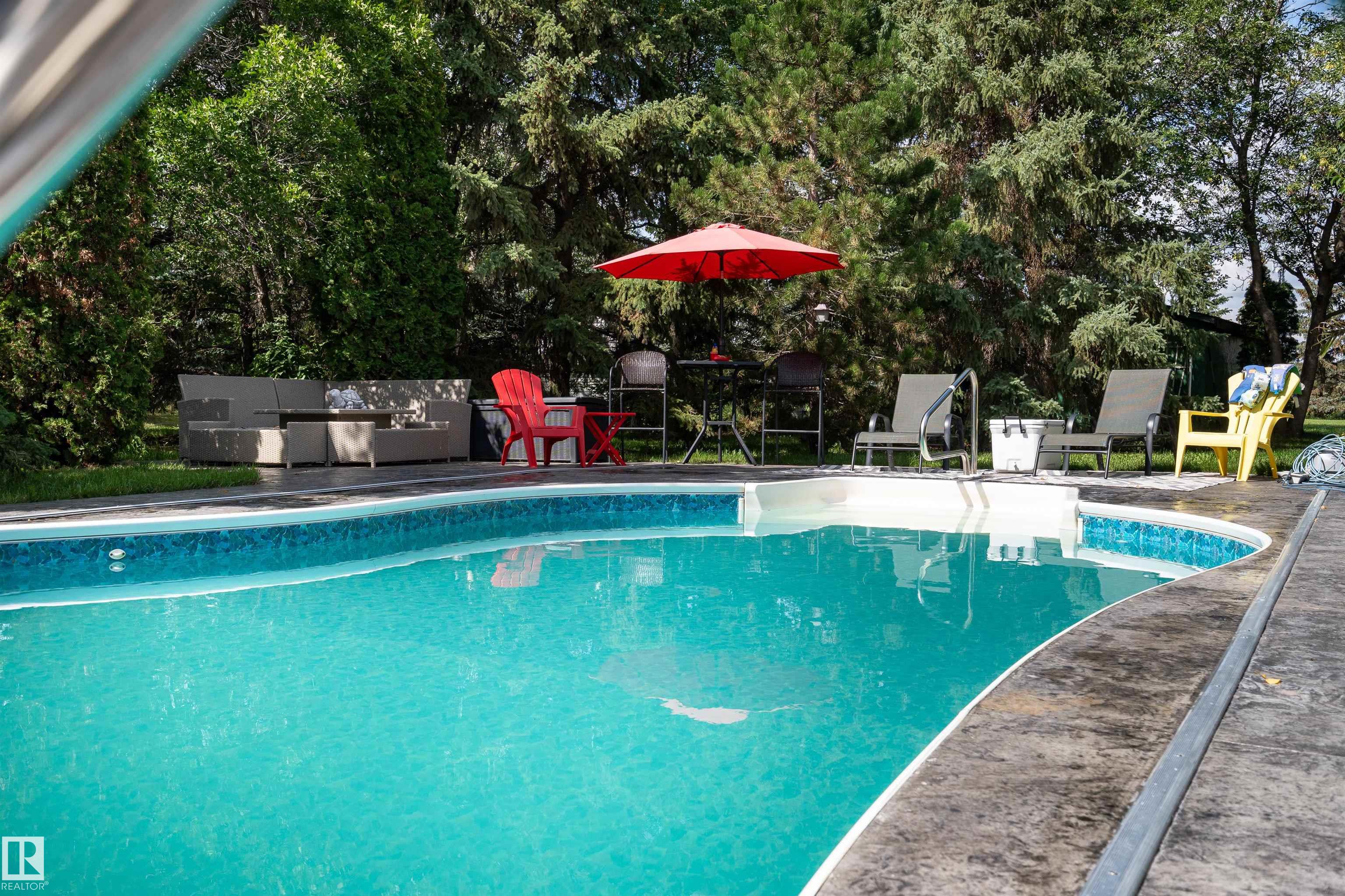 Welcome to Glenview Acres in Sturgeon County, just 5 minutes from Edmonton, where your private 15-acre retreat awaits. This 2,189 sq. ft. bungalow is thoughtfully designed for both relaxation and entertaining. The inviting country-style kitchen is built for gatherings, opening onto a spacious deck and sparkling heated pool with automatic cover. A warm, sunlit living room with a fireplace offers the perfect place to unwind. The primary suite is a true escape with a walk-in closet and 4-piece ensuite, complemented by two additional bedrooms, a 5-piece bath, and convenient main floor laundry. The fully finished basement features brand-new flooring, a sprawling rec room with fireplace—ideal for a games area, bar, or fitness space—along with a guest bedroom, 3-piece bath, and generous storage. A heated double attached garage with a half bath adds everyday comfort. Spend your summers poolside, hosting friends on the expansive deck, or simply savouring the tranquility of your secluded, endless yard.