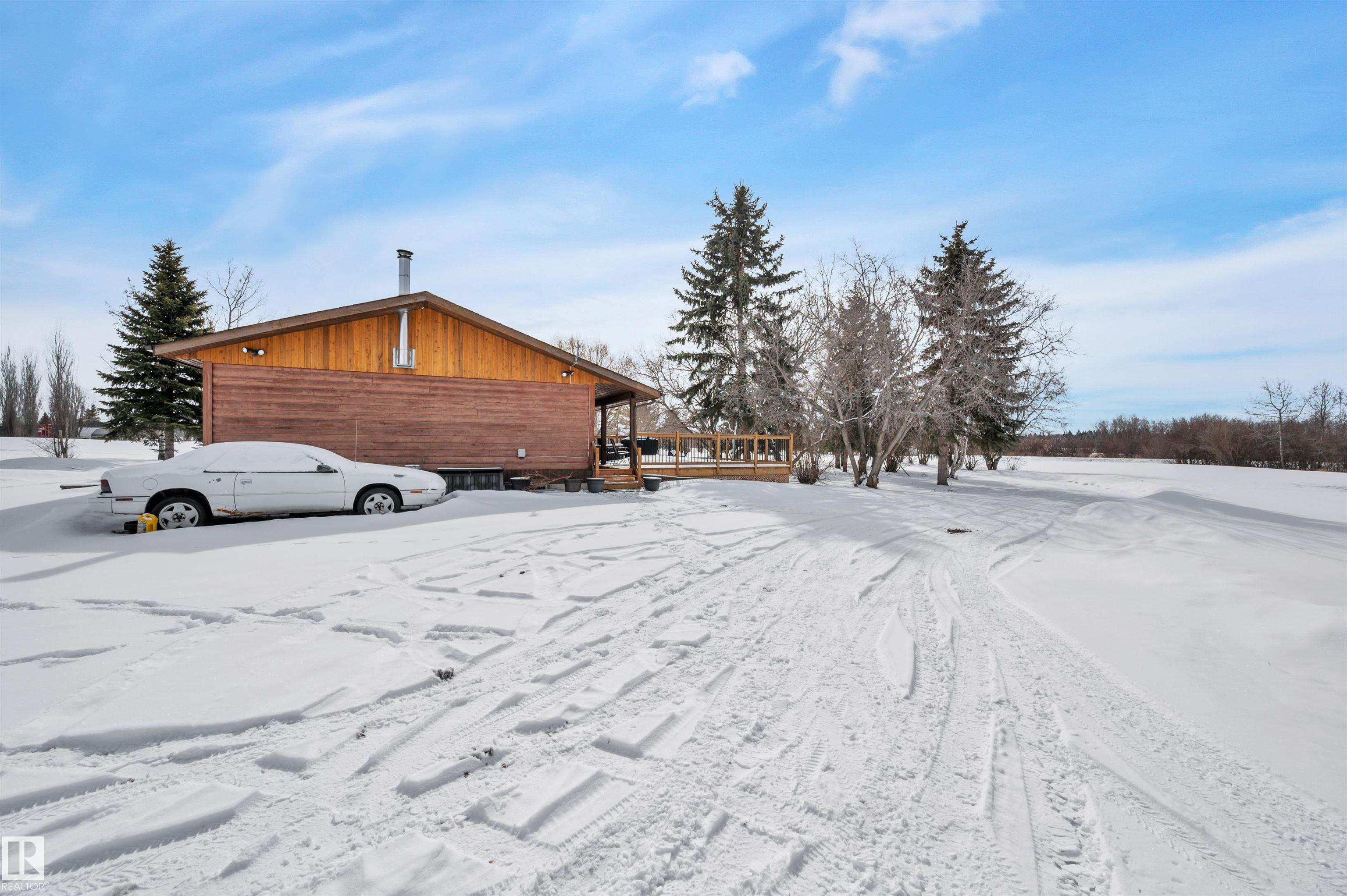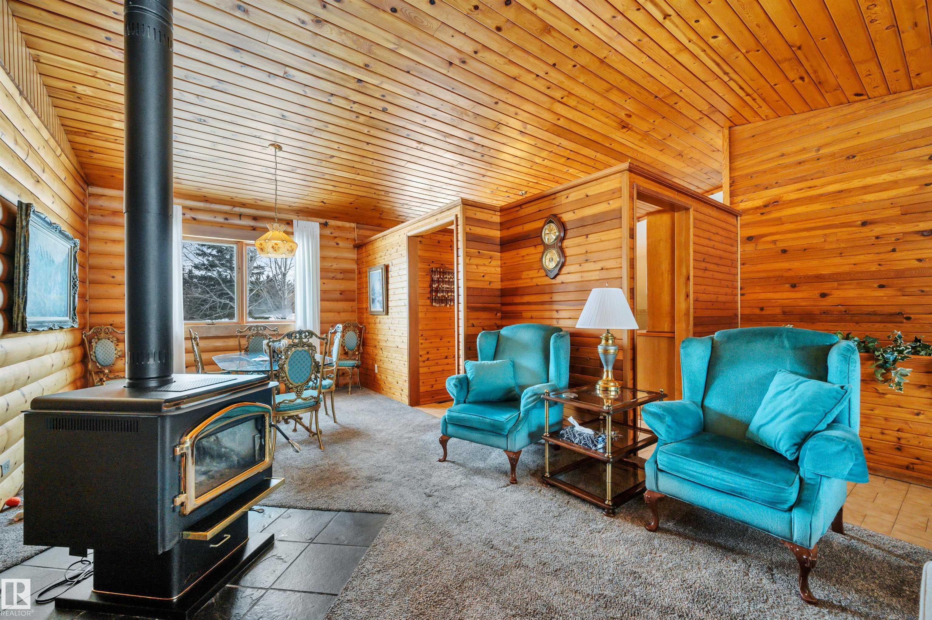 Enjoy peaceful country living in Greenhaven Estates! Less than 15 minutes from Sherwood Park! This CUSTOM BUILT log home is situated on 3.9 acres and has been meticulously maintained over the years. Lovely open floor plan with vaulted cedar ceilings & a wood-burning stove in the living room. Nice kitchen and an adjacent dining area. There are 2 bedrooms on the main floor plus an updated 4 piece bathroom. Primary bedroom with lovely 3 piece ensuite. The basement has a 3rd bedroom, family room, office, storage room, utility/laundry room & there's roughed-in plumbing for a future bathroom. UPGRADES INCLUDE: Shingles (2017), deck (2020), newer furnace(2017) & hot water tank, newer appliances, & newer carpets in living room & dining area. This property has 2x6 construction, septic tank and field, and a 2400 gallon cistern. Enjoy the beautiful view of the pond from the large front deck! DOUBLE CAR PORT 24 ft deep and 20 ft wide. Attached shed measures 24 ft deep and 16 ft wide. A great home for nature lovers!
