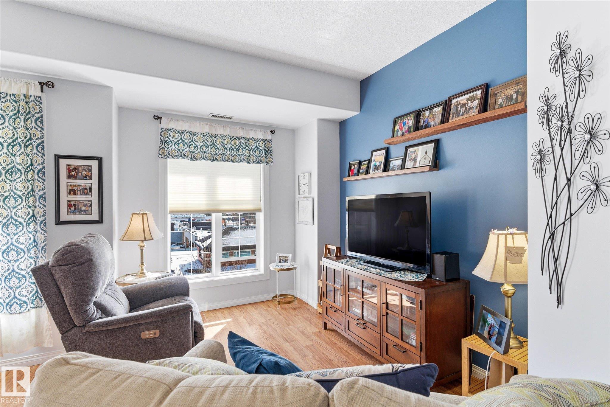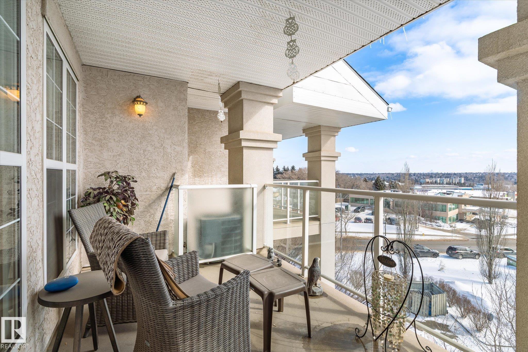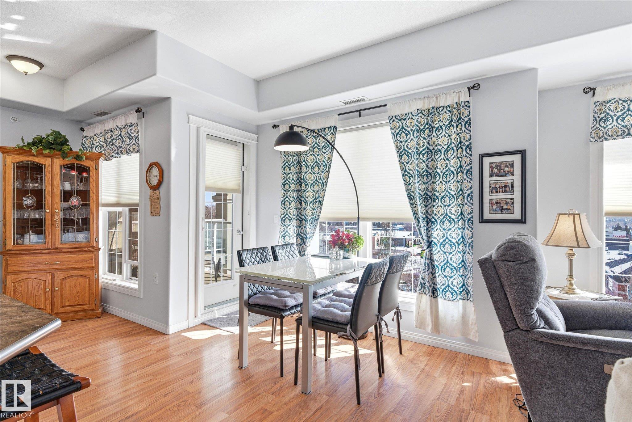 Welcome to the Sierra's of Inglewood! This bright and inviting top-floor condo offers 2 bedrooms, 2 bathrooms, and breathtaking panoramic views of St. Albert right from your own private balcony. Situated on the 4th floor with no neighbours above, the open-concept layout features a well-appointed kitchen with stainless steel appliances, dark countertops, warm wood cabinetry, and a breakfast bar perfect for casual dining. The sun-drenched living and dining area is flooded with natural light from oversized windows and patio doors leading to your spacious covered balcony — where unobstructed views of the city stretch as far as the eye can see. The primary bedroom includes its own ensuite, while a second full bathroom adds everyday convenience. Residents enjoy resort-style amenities including an indoor pool, hot tub, sauna, fitness centre, woodworking shop, games and social rooms, guest suites, and a welcoming lounge with a fireplace. Heated underground parking and storage included.
